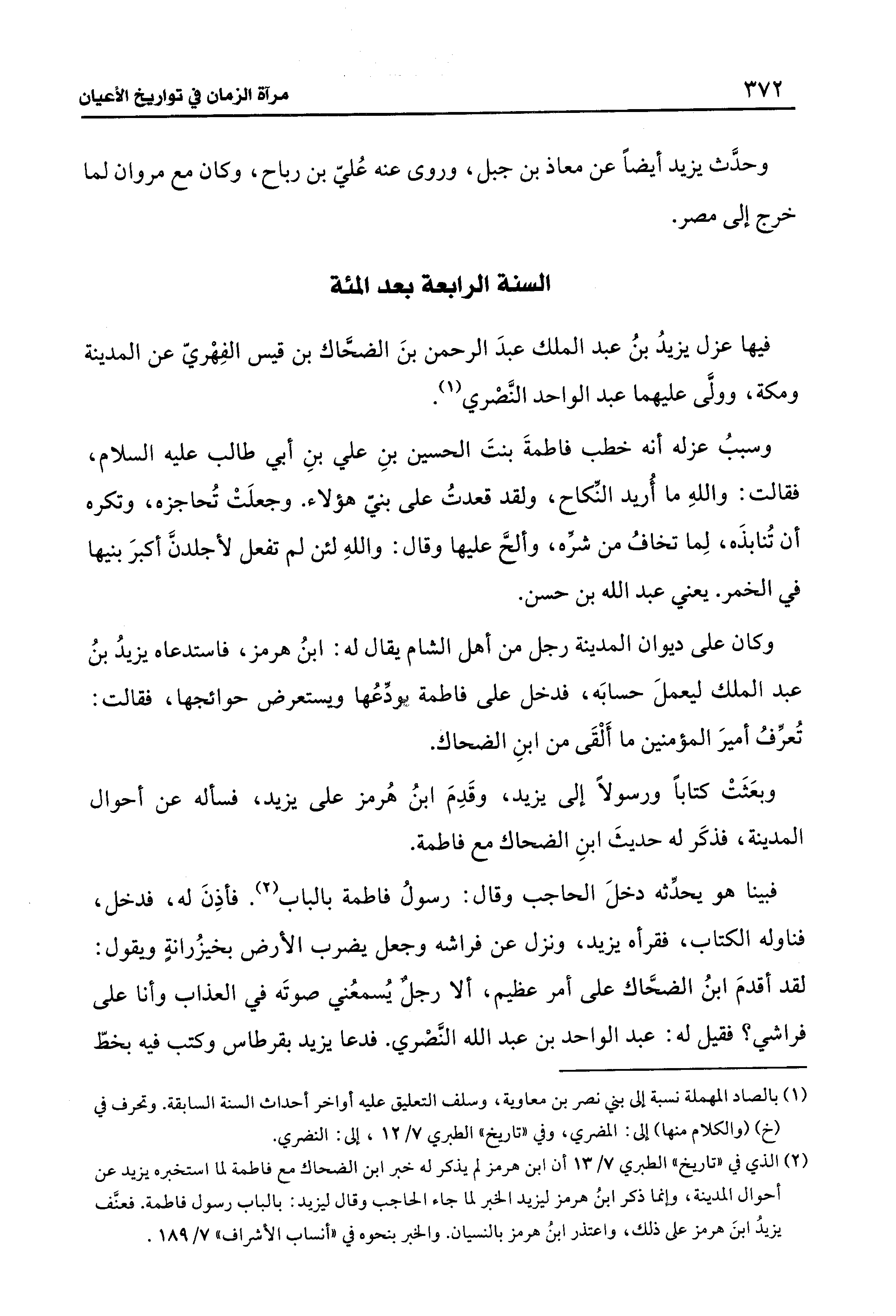 وبعَثَتْ كتابًا ورسولًا إلى يزيد، وقَدِمَ ابنُ هُرمز على يزيد، فسأله عن أحوال المدينة، فذكَر له حديثَ ابنِ الضحاك مع فاطمة.