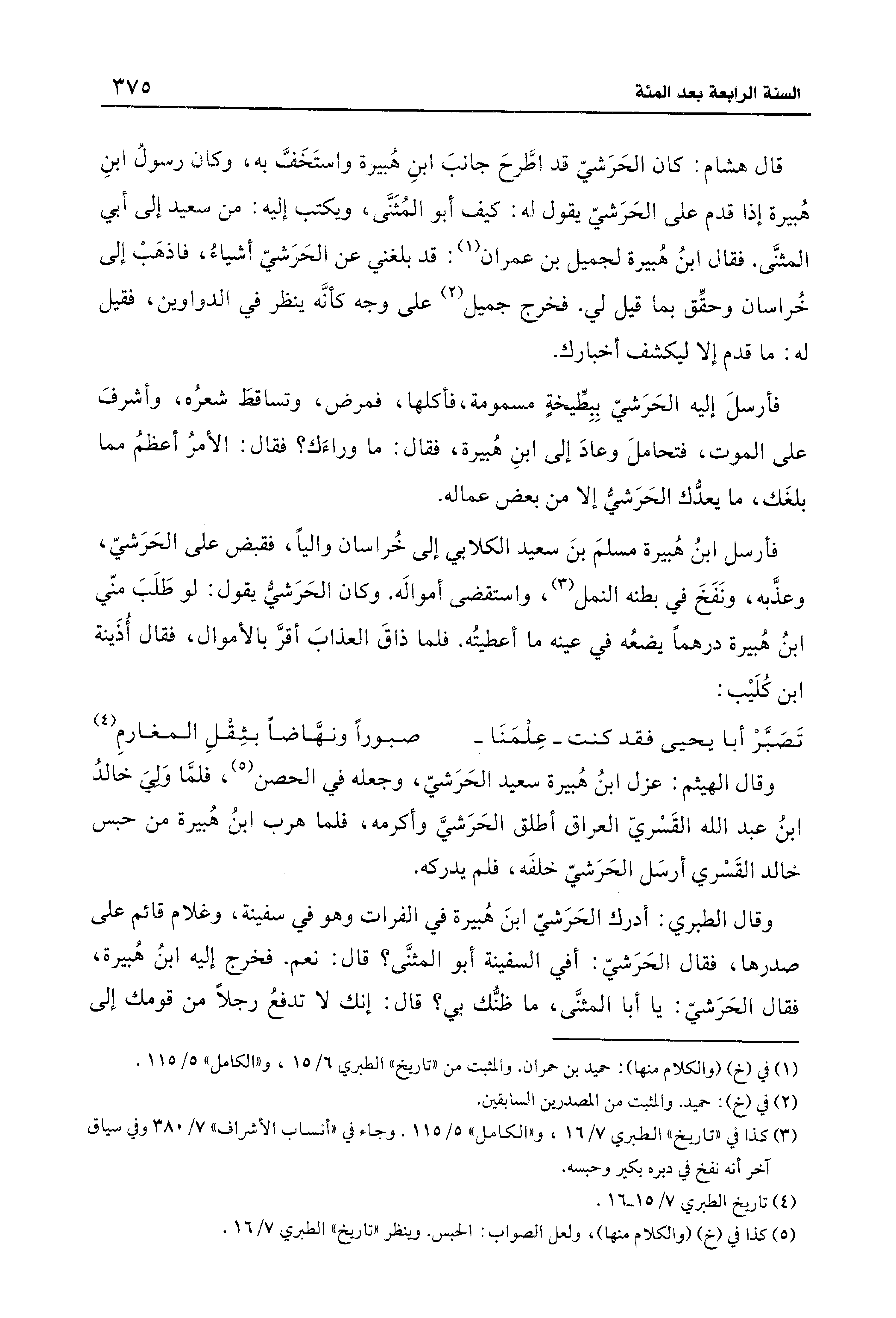 قال هشام: كان الحَرَشيّ قد اطَّرحَ جانبَ ابنِ هُبيرة واستَخَفَّ به , وكان رسولُ ابنِ هُبيرة إذا قدم على الحَرَشيّ يقول له: كيف أبو المُثَنَّى , ويكتب إليه: من سعيد إلى أبي المثنَّى. فقال ابنُ هُبيرة لجميل بن عمران (¬1): قد بلغني عن الحَرَشيّ أشياءُ، فاذهَبْ إلى خُراسان وحقِّق بما قيل لي. فخرج جميل (¬2) على وجه كأنَّه ينظر في الدواوين، فقيل له: ما قدم إلا ليكشف أخبارك.