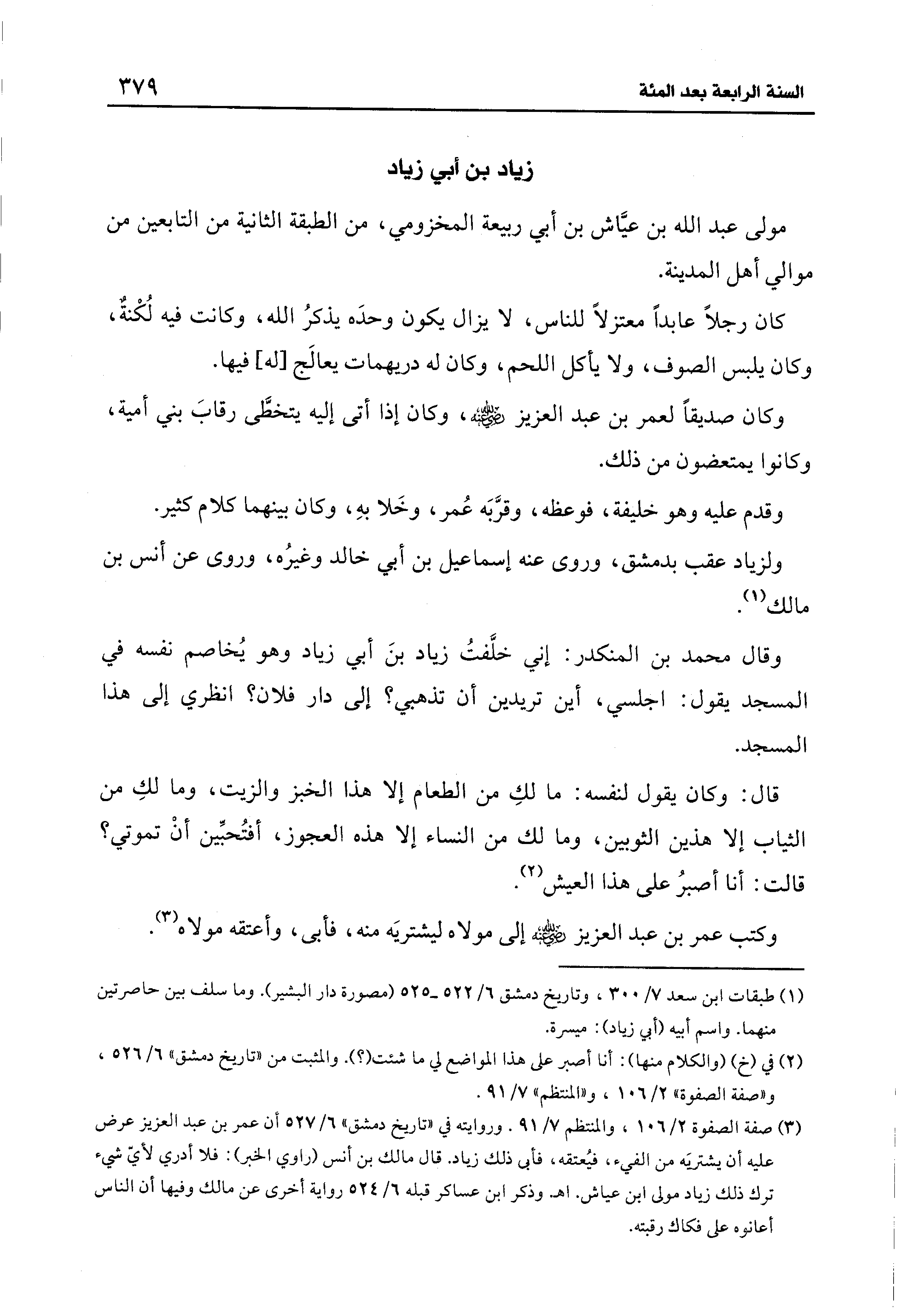 (¬3) صفة الصفوة 2/ 106، والنتظم 7/ 91. وروايته في "تاريخ دمشق" 6/ 527 أن عمر بن عبد العزيز عرض عليه أن يشتريَه من الفيء، فيُعتقه، فأبى ذلك زياد. قال مالك بن أنس (راوي الخبر): فلا أدري لأيّ شيء ترك ذلك زياد مولى ابن عياش. اهـ. وذكر ابن عساكر قبله 6/ 524 رواية أخرى عن مالك وفيها أن الناس أعانوه على فكاك رقبته.