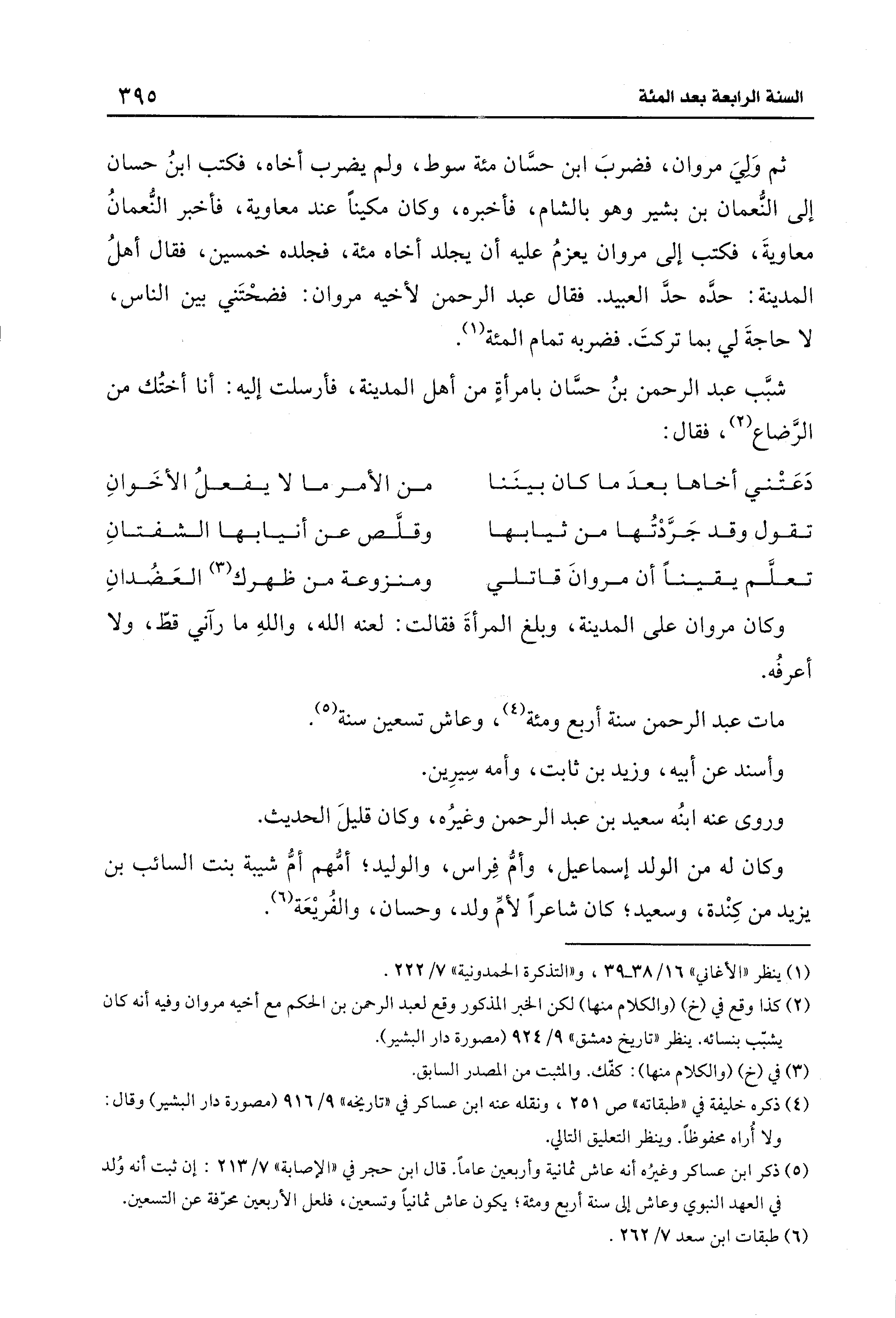 ثم وَليَ مروان، فضربَ ابن حسَّان مئة سوط، ولم يضرب أخاه، فكتب ابنُ حسان إلى النُّعمان بن بشير وهو بالشام، فأخبره، وكان مكينًا عند معاوية، فأخبر النُّعمانُ معاويةَ، فكتب إلى مروان يعزمُ عليه أن يجلد أخاه مئة، فجلده خمسين، فقال أهلُ المدينة: حدَّه حدَّ العبيد. فقال عبد الرحمن لأخيه مروان: فضحْتَني بين الناس، لا حاجةَ لي بما تركتَ. فضربه تمام المئة (¬1).
