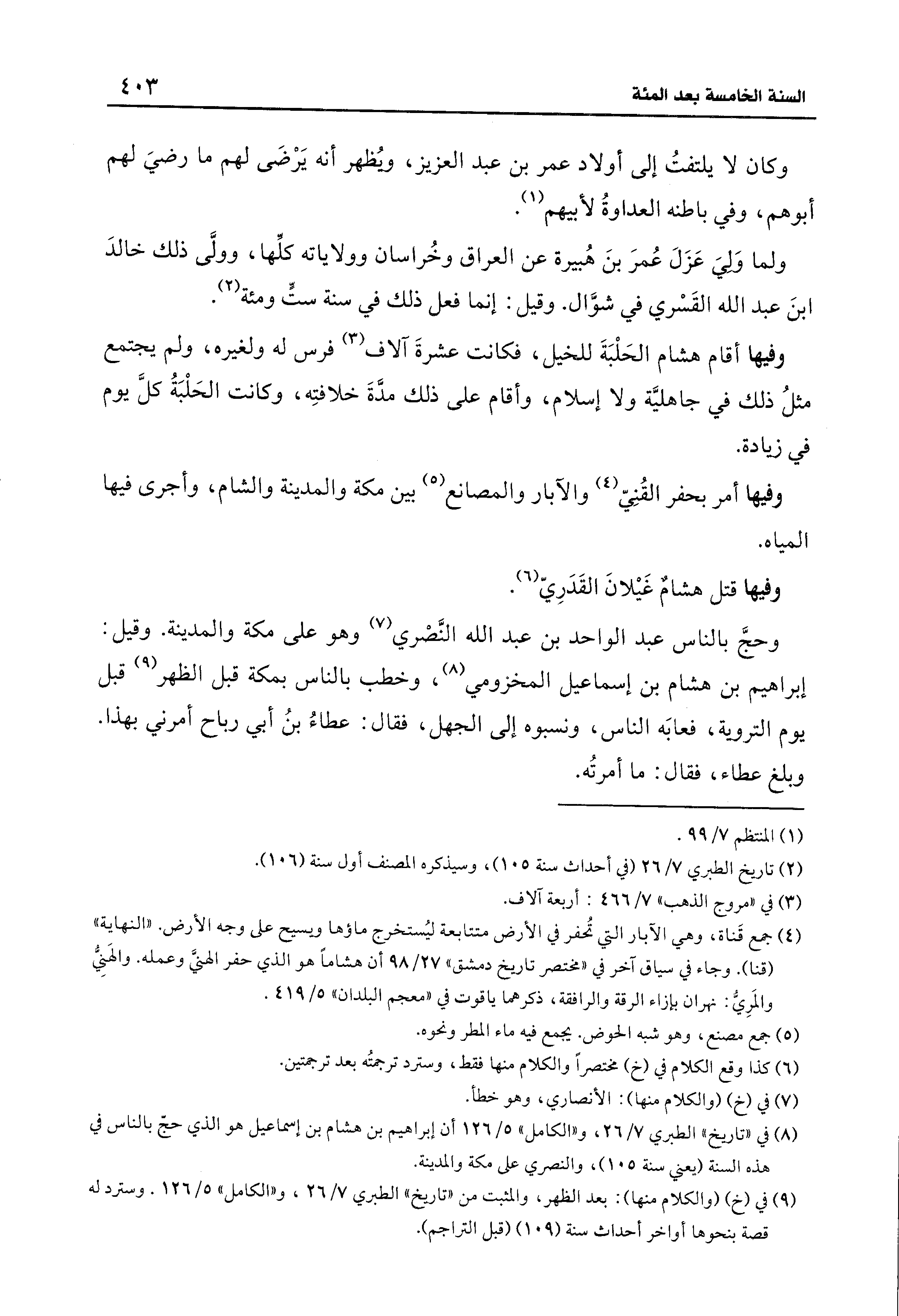 (¬8) في "تاريخ" الطبري 7/ 26، و"الكامل" 5/ 126 أن إبراهيم بن هشام بن إسماعيل هو الذي حجّ بالناس في هذه السنة (يعني سنة 105)، والنصري على مكة والمدينة.