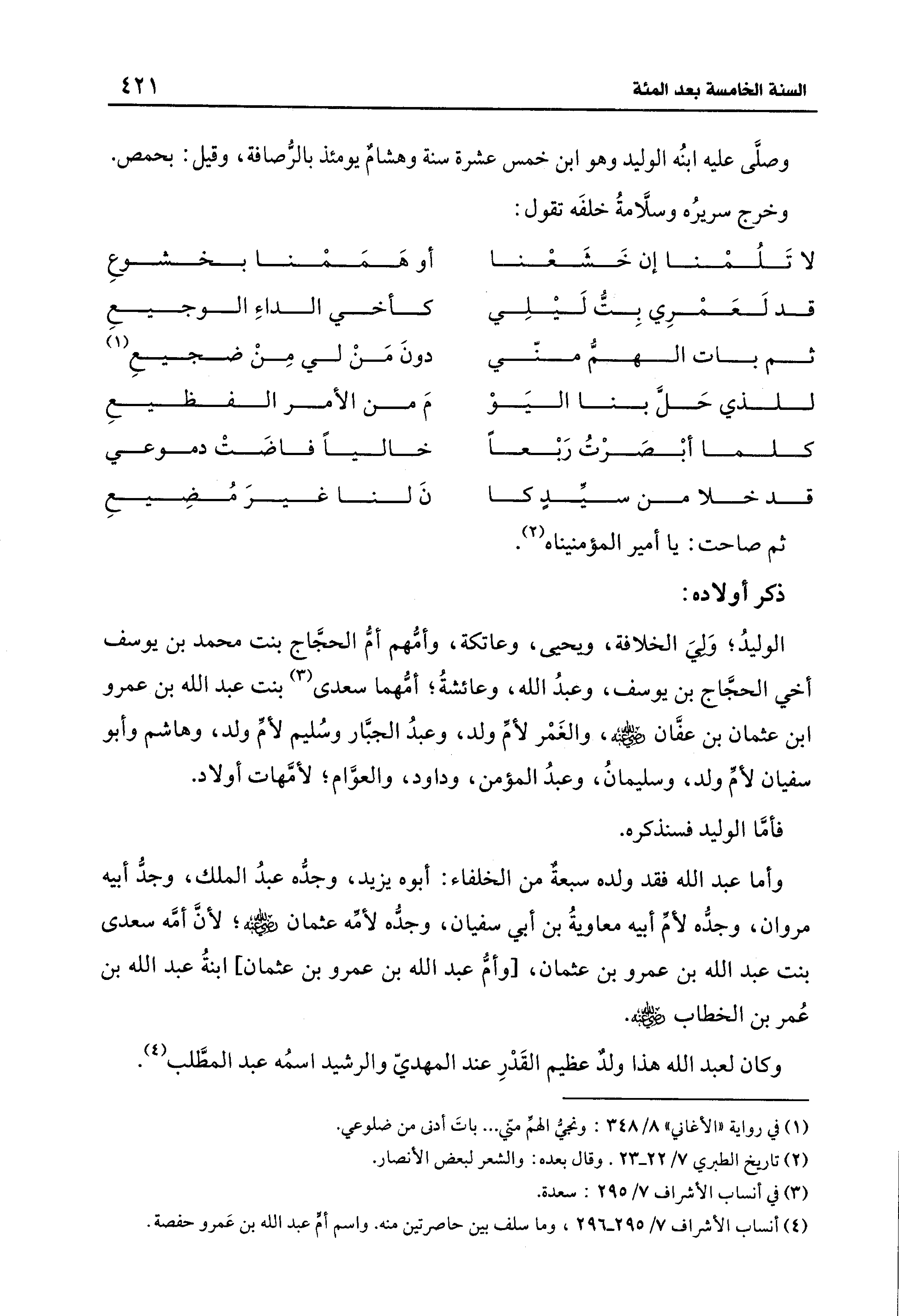 وصلَّى عليه ابنُه الوليد وهو ابن خصس عشرة سنة وهشامٌ يومئذ بالرُّصافة، وقيل: بحمص.
