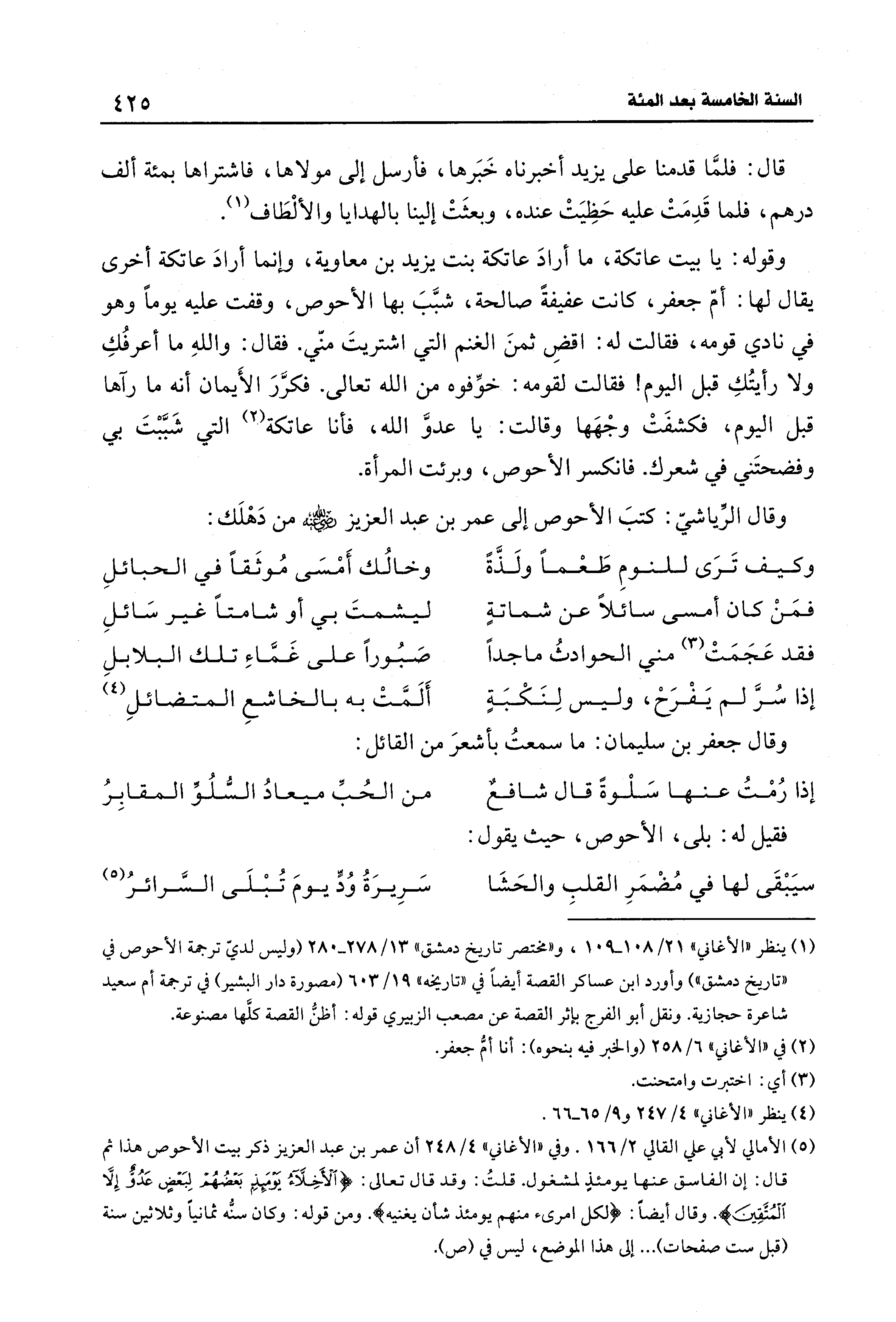 (¬1) ينظر "الأغاني" 21/ 108 - 109، و"مختصر تاريخ دمشق" 13/ 278 - 280 (وليس لديّ ترجمة الأحوص في "تاريخ دمشق" (وأورد ابن عساكر القصة أيضًا في "تاريخه" 19/ 603 (مصورة دار البشير) في ترجمة أم سعيد شاعرة حجازية. ونقل أبو الفرج بإثر القصة عن مصعب الزبيري قوله: أظنُّ القصة كلَّها مصنوعة.