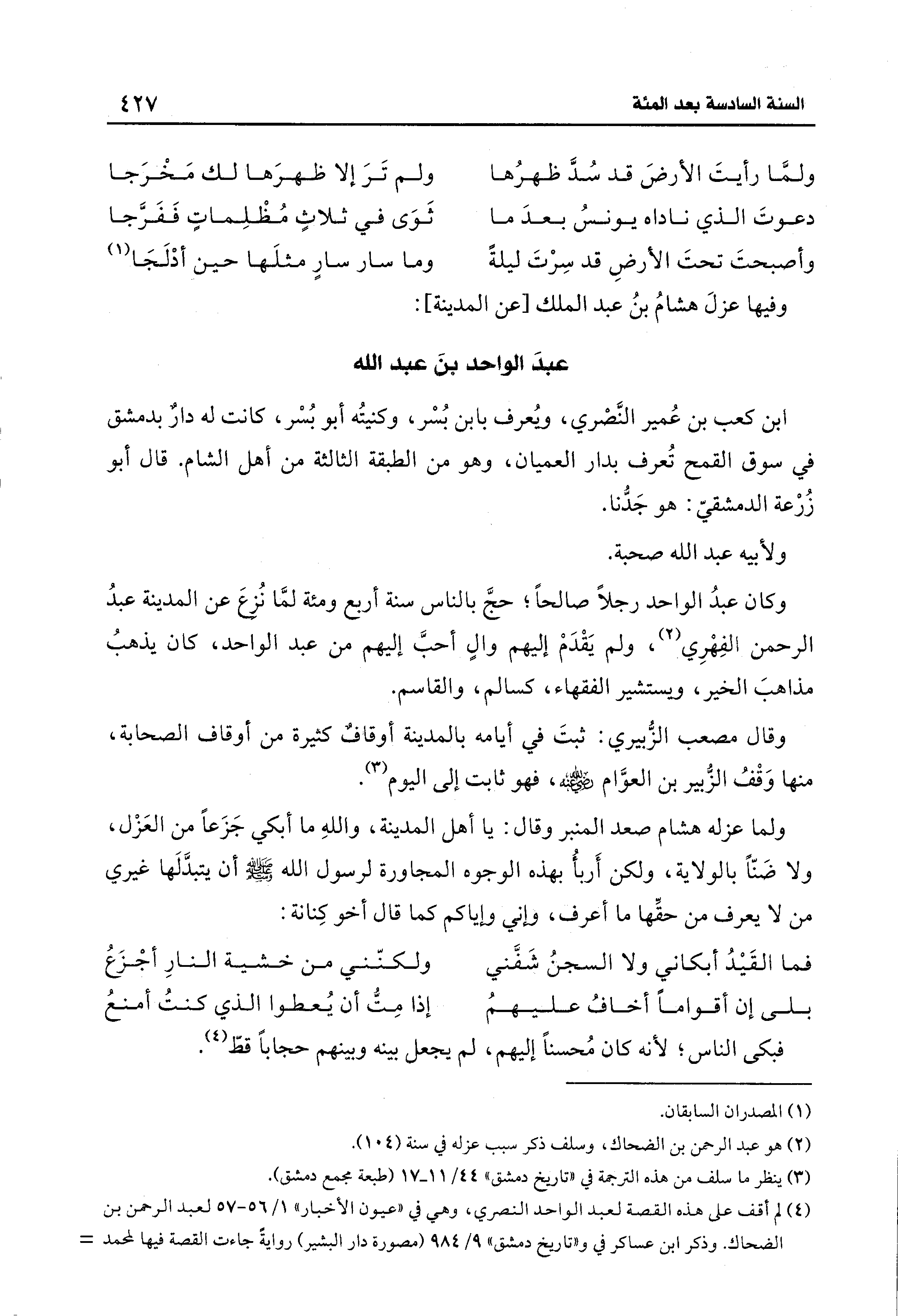 (¬4) لم أقف على هذه القصة لعبد الواحد النصري، وهي في "عيون الأخبار" 1/ 56 - 57 لعبد الرحمن بن الضحاك. وذكر ابن عساكر في و"تاريخ دمشق" 9/ 984 (مصورة دار البشير) روايةً جاءت القصة فيها لمحمد =