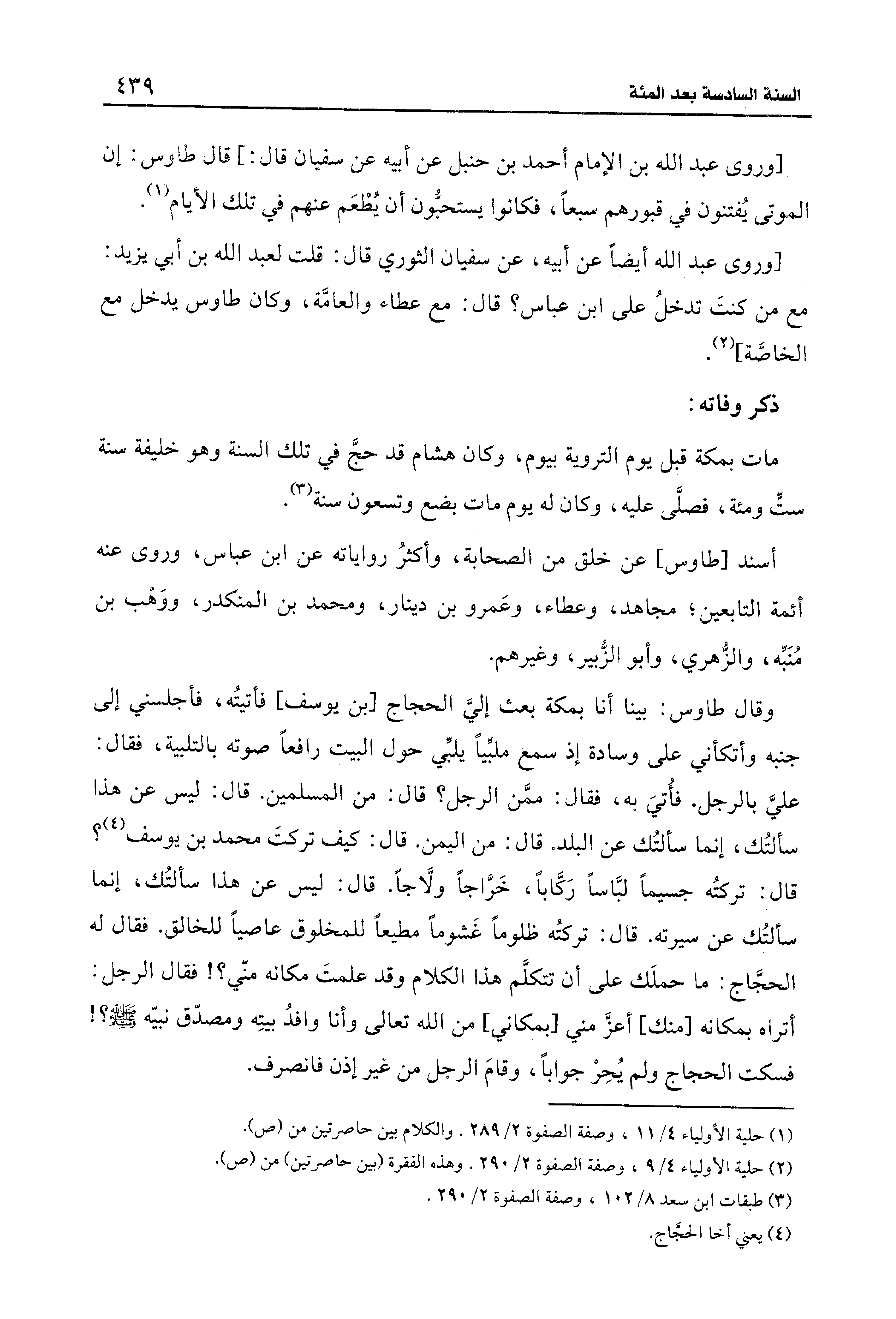 مات بمكة قبل يوم التروية بيوم، وكان هشام قد حجَّ في تلك السنة وهو خليفة سنة ستٍّ ومئة، فصلَّى عليه، وكان له يوم مات بضع وتسعون سنة (¬3).