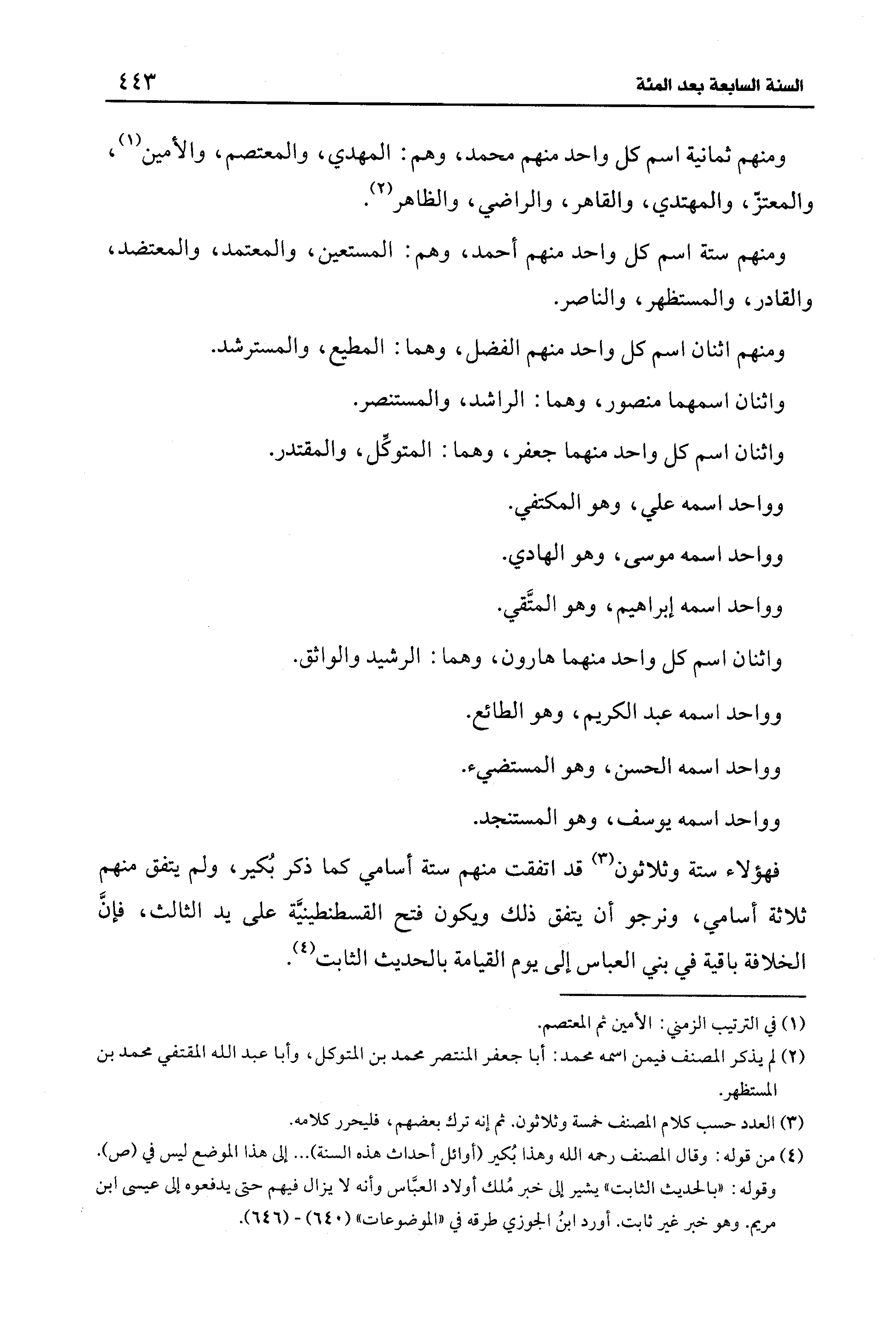 فهؤلاء ستة وثلاثون (¬3) قد اتفقت منهم ستة أسامي كما ذكر بُكير، ولم يتفق منهم ثلاثة أسامي، ونرجو أن يتفق ذلك ويكون فتح القسطنطينية على يد الثالث، فإنَّ الخلافة باقية في بني العباس إلى يوم القيامة بالحديث الثابت (¬4).