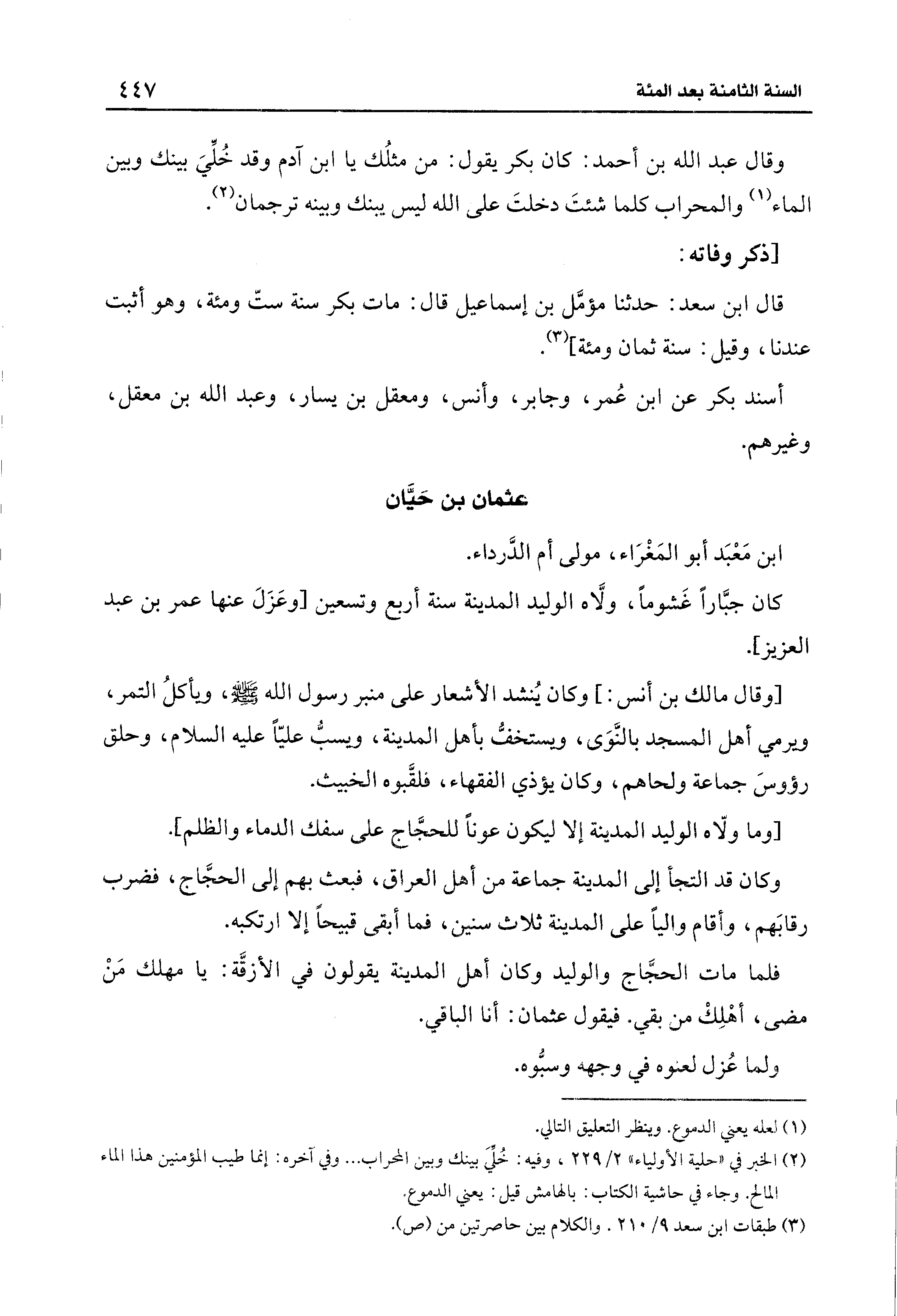فلما مات الحجَّاج والوليد وكان أهل المدينة يقولون في الأزقَّة: يا مهلك مَن مضى، أهْلِك من بقي. فيقول عثمان: أنا الباقي.