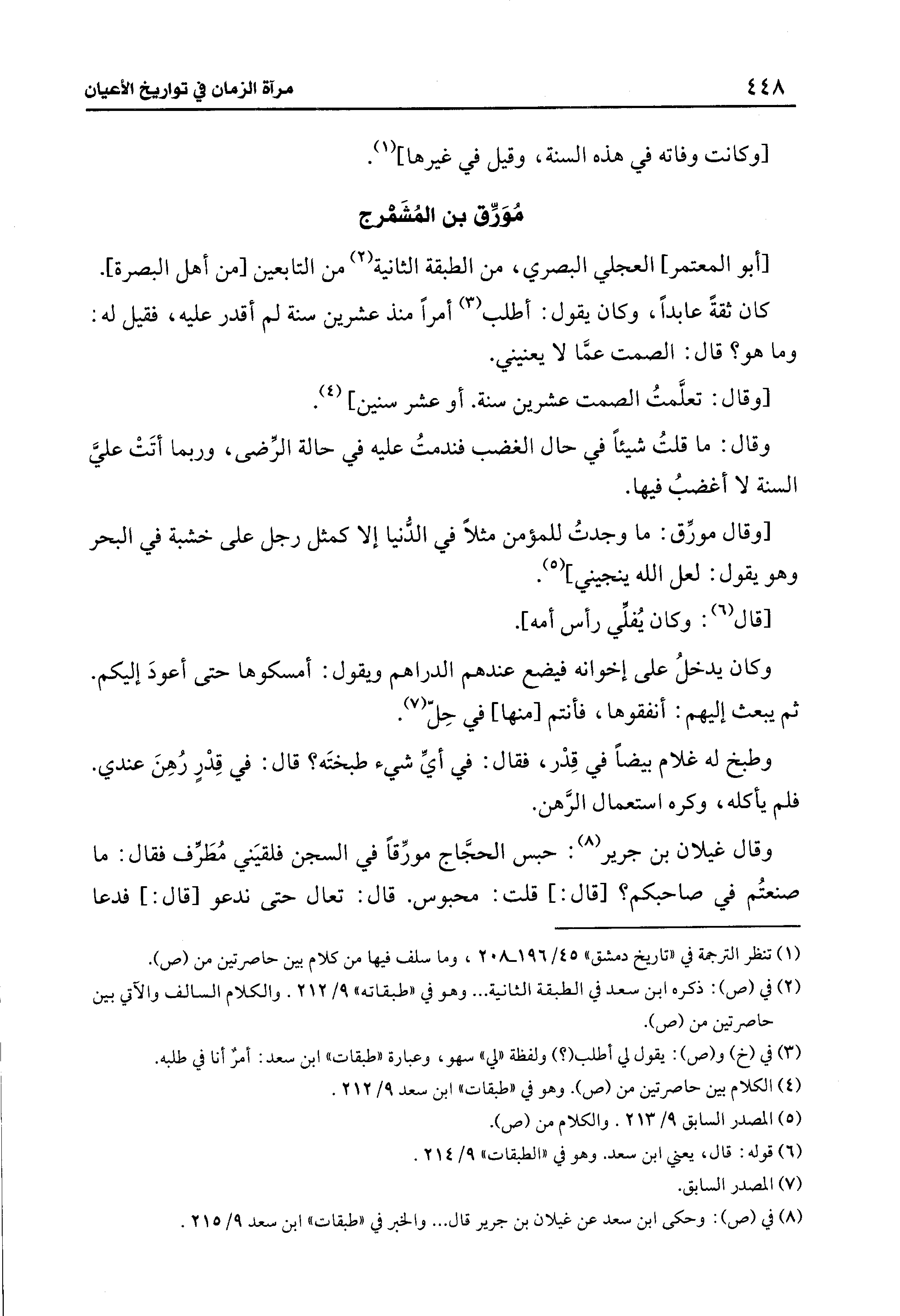 وقال غيلان بن جرير (¬8): حبس الحجَاج مورِّقًا في السجن فلقيَني مُطَرِّف فقال: ما صنعتُم في صاحبكم؟ [قال: ] قلت: محبوس. قال: تعال حتَّى ندعو [قال: ] فدعا