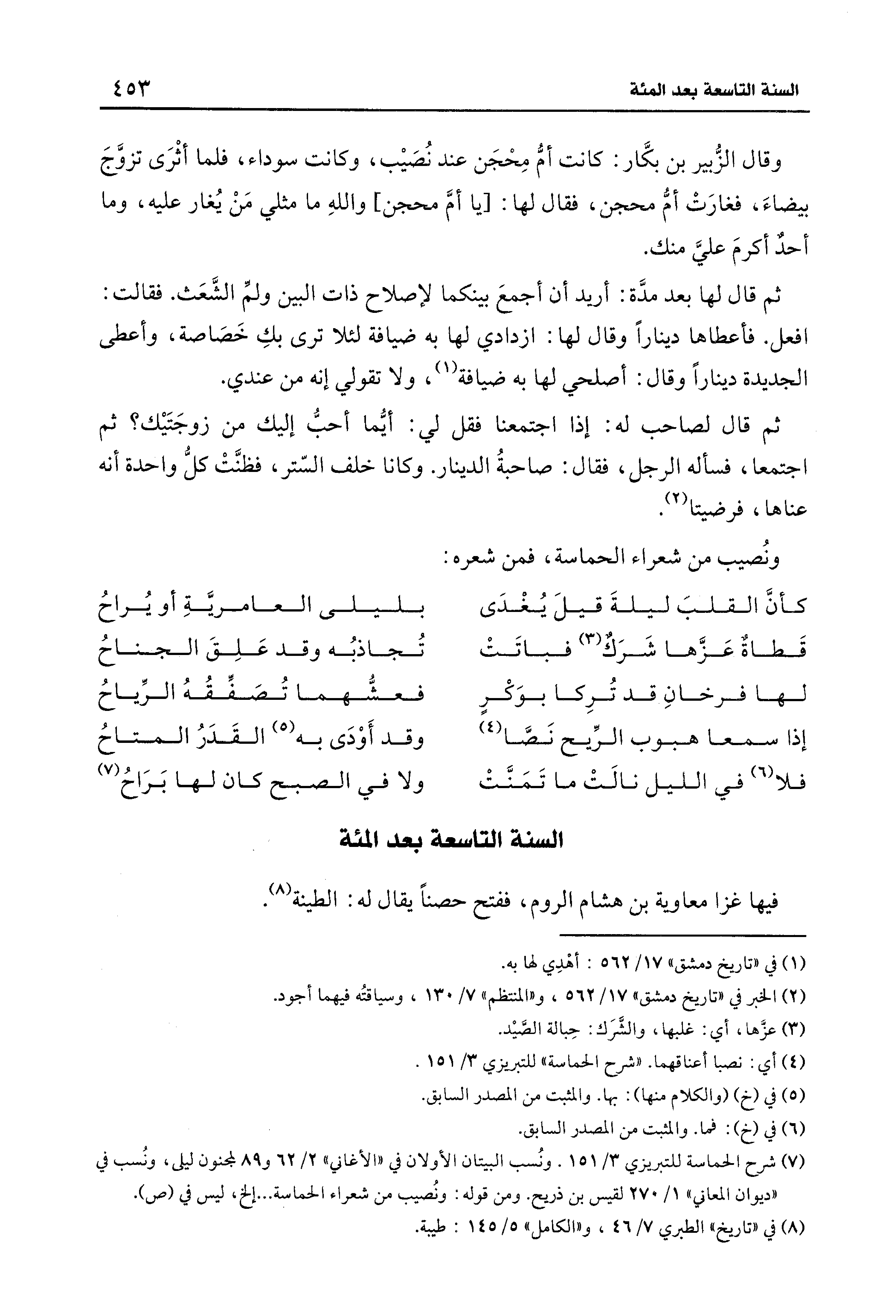 (¬7) شرح الحماسة للتبريزي 3/ 151. ونُسب البيتان الأولان في "الأغاني" 2/ 62 و 89 لمجنون ليلى، ونُسب في "ديوان المعاني" 1/ 275 لقيس بن ذريح. ومن قوله: ونُصيب من شعراء الحماسة ... إلخ، ليس في (ص).
