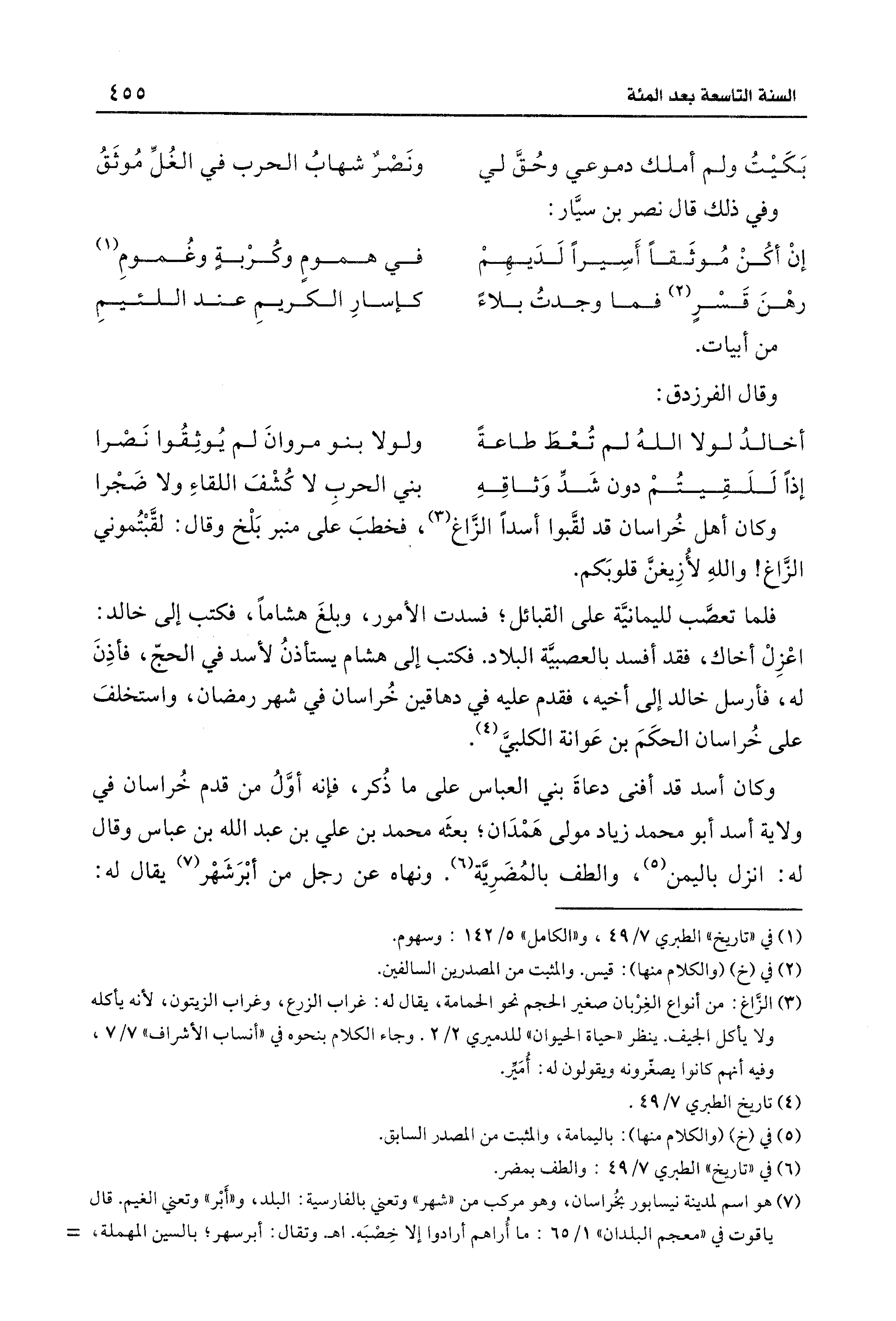 وكان أسد قد أفنى دعاةَ بني العباس على ما ذُكر، فإنه أوَّلُ من قدم خُراسان في ولاية أسد أبو محمد زياد مولى همدَان؛ بعثَه محمد بن علي بن عبد الله بن عباس وقال له: انزل باليمن (¬5)، والطف بالمُضَرِيَّة (¬6). ونهاه عن رجل من أبْرَشَهْر (¬7) يقال له: