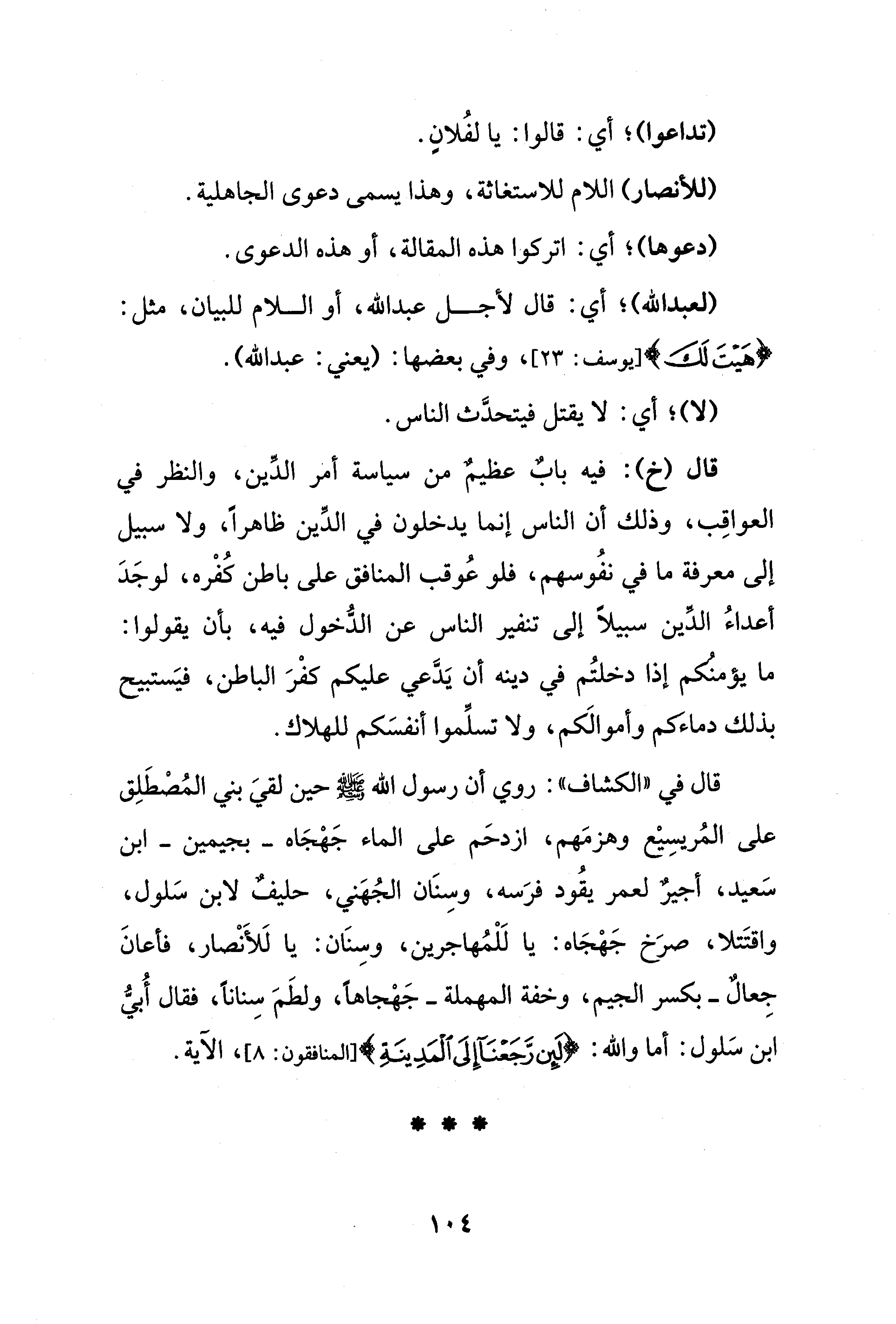 قال في "الكشاف": روي أن رسول الله - صلى الله عليه وسلم - حين لقيَ بني المُصْطَلِق على المُريسِيْع وهزمَهم، ازدحَم على الماء جَهْجَاه -بجيمين- ابن سَعيد، أجيرٌ لعمر يقُود فرَسه، وسِنَان الجُهَني، حليفٌ لابن سَلول، واقتَتلا، صرَخ جَهْجَاه: يا لَلْمُهاجرين، وسِنَان: يا لَلأَنْصار، فأعانَ جِعالٌ -بكسر الجيم، وخفة المهملة- جَهْجاهًا، ولطَمَ سِنانًا، فقال أُبيُّ ابن سَلول: أما والله: {لَئِنْ رَجَعْنَا إِلَى الْمَدِينَةِ} [المنافقون: 8]، الآية.
