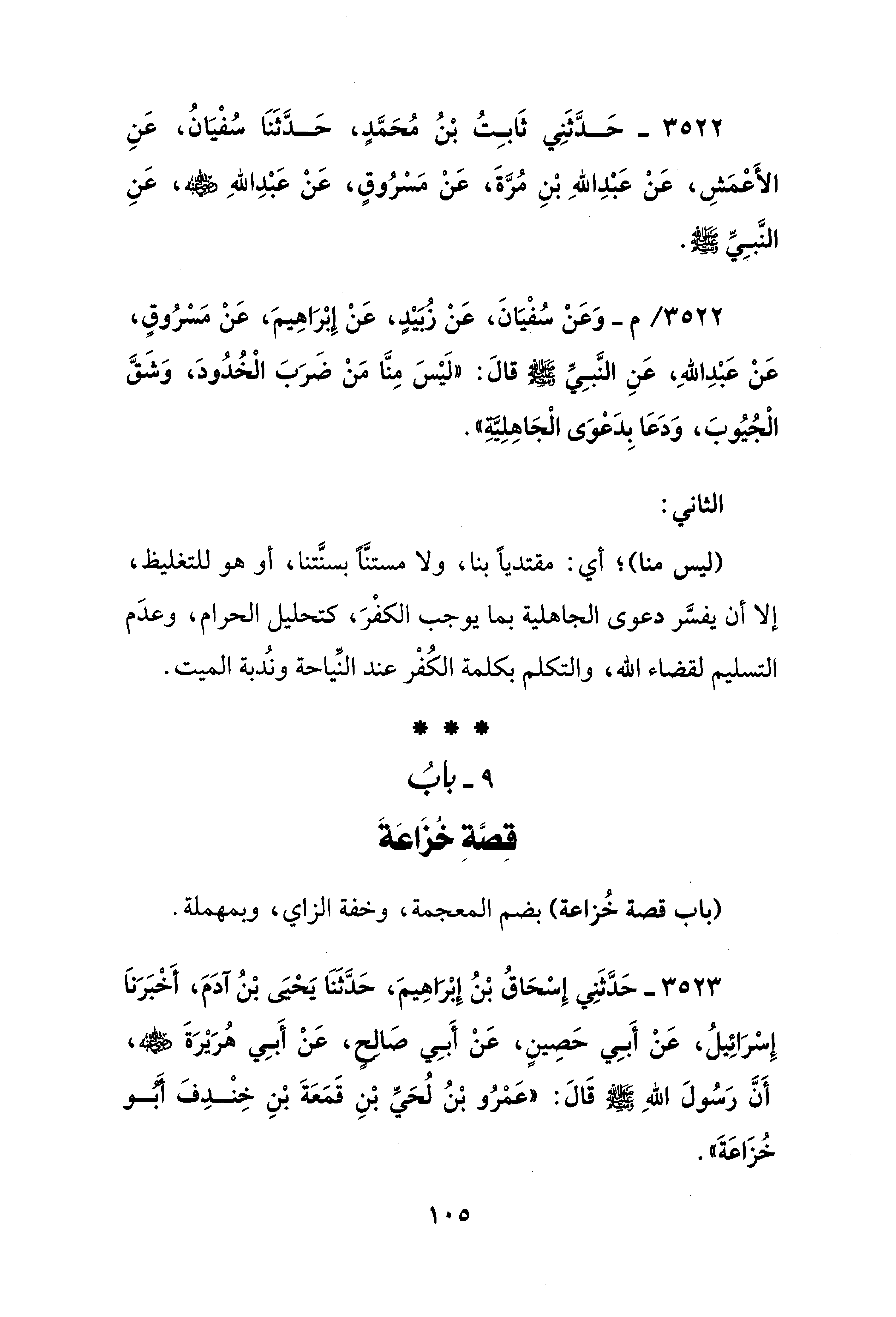 3522 - حَدَّثَنِي ثَابِتُ بْنُ مُحَمَّدٍ، حَدَّثَنَا سُفْيَانُ، عَنِ الأَعْمَشِ، عَنْ عَبْدِ اللهِ بْنِ مُرَّةَ، عَنْ مَسْرُوقٍ، عَنْ عَبْدِ اللهِ - رضي الله عنه -، عَنِ النَّبِيِّ - صلى الله عليه وسلم -.