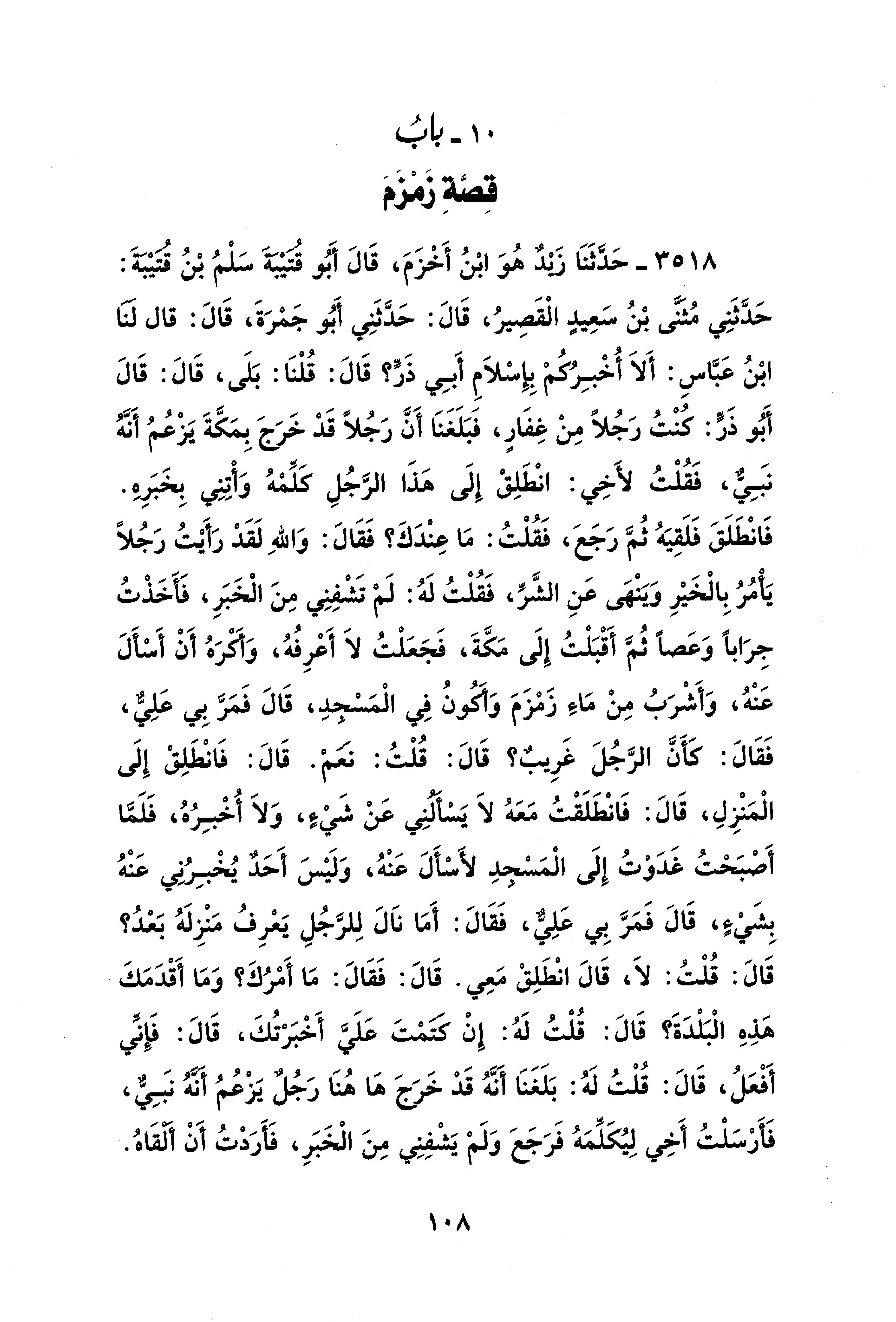 3518 - حَدَّثَنَا زيْدٌ هُوَ ابْنُ أَخْزَمَ، قَالَ أَبُو قُتَيْبَةَ سَلْمُ بْنُ قُتَيْبَةَ: حَدَّثَنِي مُثَنَّى بْنُ سَعِيدٍ الْقَصِيرُ، قَالَ: حَدَّثَنِي أَبُو جَمْرَةَ، قَالَ: قال لَنَا ابْنُ عَبَّاسِ: أَلاَ أُخْبِرُكُمْ بِإِسْلاَمِ أَبِي ذَرٍّ؟ قَالَ: قُلْنَا: بَلَى، قَالَ: قَالَ أَبُو ذَرٍّ: كُنْتُ رَجُلًا مِنْ غِفَارٍ، فَبَلَغَنَا أَنَّ رَجُلًا قَدْ خَرَجَ بِمَكَّةَ يَزْعُمُ أَنَّهُ نبَيٌّ، فَقُلْتُ لأَخِي: انْطَلِقْ إِلَى هَذَا الرَّجُلِ كَلِّمْهُ وَأْتِنِي بِخَبَرِهِ. فَانْطَلَقَ فَلَقِيَهُ ثُمَّ رَجَعَ، فَقُلْتُ: مَا عِنْدَكَ؟ فَقَالَ: وَاللهِ لَقَدْ رَأَيْتُ رَجُلًا يَأْمُرُ بِالْخَيْرِ وَيَنْهَى عَنِ الشَّرِّ، فَقُلْتُ لَهُ: لَمْ تَشْفِنِي مِنَ الْخَبَرِ، فَأَخَذْتُ جِرَابًا وَعَصًا ثُمَّ أَقْبَلْتُ إِلَى مَكَّةَ، فَجَعَلْتُ لاَ أَعْرِفُهُ، وَأَكْرَهُ أَنْ أَسْأَلَ عَنْهُ، وَأَشْرَبُ مِنْ مَاءِ زَمْزَمَ وَأَكُونُ فِي الْمَسْجِدِ، قَالَ فَمَرَّ بِي عَلِيٌّ، فَقَالَ: كَأَنَّ الرَّجُلَ غَرِيبٌ؟ قَالَ: قُلْتُ: نَعَمْ. قَالَ: فَانْطَلِقْ إِلَى الْمَنْزِلِ، قَالَ: فَانْطَلَقْتُ مَعَهُ لاَ يَسْأَلُنِي عَنْ شَيْءٍ، وَلاَ أُخْبِرُهُ، فَلَمَّا أَصْبَحْتُ غَدَوْتُ إِلَى الْمَسْجِدِ لأَسْأَلَ عَنْهُ، وَلَيْسَ أَحَدٌ يُخْبِرُني عَنْهُ بِشَيْءٍ، قَالَ فَمَرَّ بِي عَلِيٌّ، فَقَالَ: أَمَا ناَلَ لِلرَّجُلِ يَعْرِفُ مَنْزِلَهُ بَعْدُ؟ قَالَ: قُلْتُ: لاَ، قَالَ انْطَلِقْ مَعِي. قَالَ: فَقَالَ: مَا أَمْرُكَ؟ وَمَا أَقْدَمَكَ هَذِهِ الْبَلْدَةَ؟ قَالَ: قُلْتُ لَهُ: إِنْ كَتَمْتَ عَلَيَّ أَخْبَرْتُكَ، قَالَ: فَإِنِّي أَفْعَلُ، قَالَ: قُلْتُ لَهُ: بَلَغَنَا أَنَّهُ قَدْ خَرَجَ هَا هُنَا رَجُلٌ يَزْعُمُ أَنَّهُ نَبِيٌّ، فَأَرْسَلْتُ أَخِي لِيُكَلِّمَهُ فَرَجَعَ وَلَمْ يَشْفِنِي مِنَ الْخَبَرِ، فَأَرَدْتُ أَنْ ألْقَاهُ.