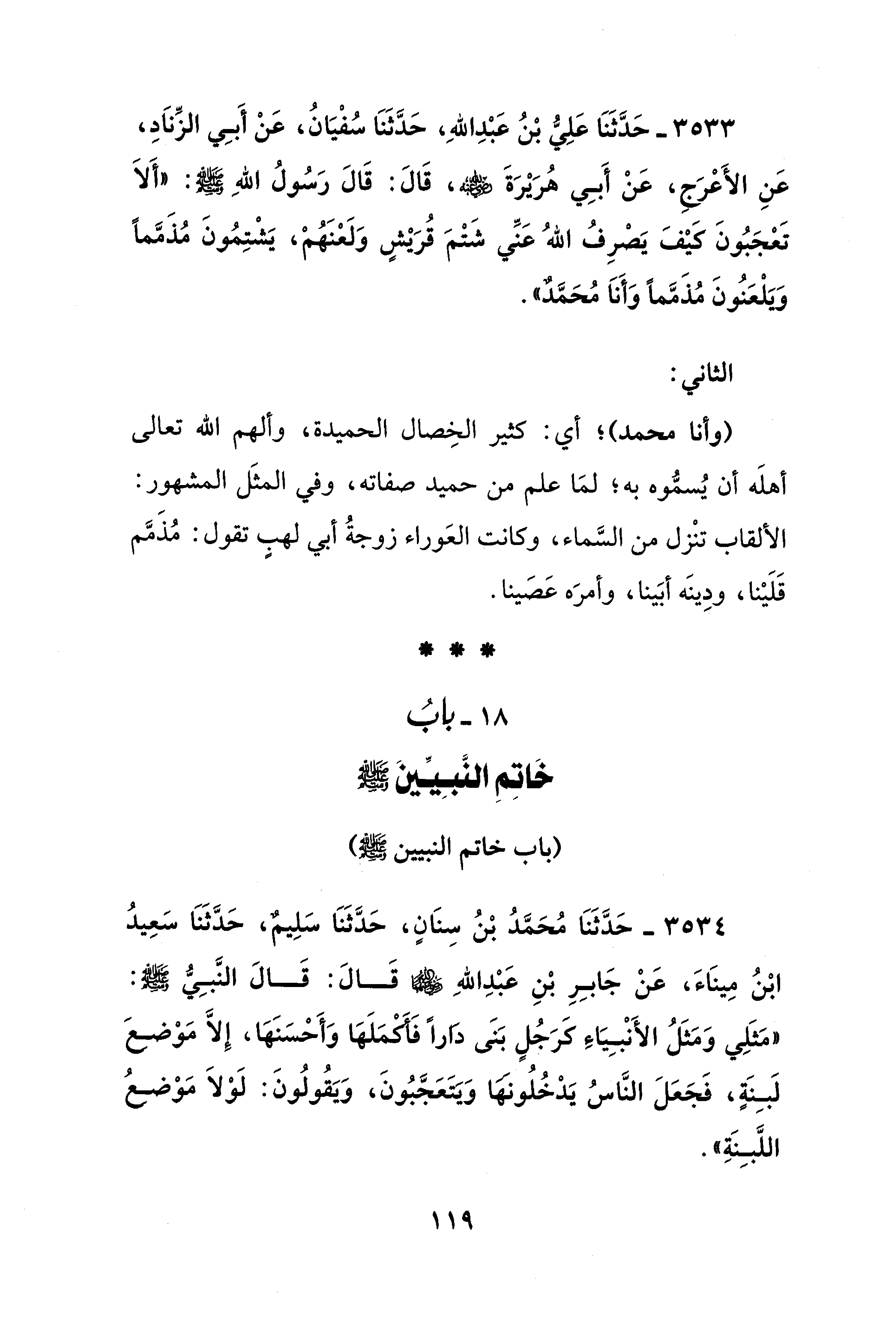 3533 - حَدَّثَنَا عَلِيُّ بْنُ عَبْدِ اللهِ، حَدَّثَنَا سُفْيَانُ، عَنْ أَبِي الزِّنَادِ، عَنِ الأَعْرَج، عَنْ أَبِي هُرَيْرَةَ - رضي الله عنه -، قَالَ: قَالَ رَسُولُ اللهِ - صلى الله عليه وسلم -: "أَلاَ تَعْجَبُونَ كَيْفَ يَصْرِفُ اللهُ عَنِّي شَتْمَ قُرَيْشٍ وَلَعْنَهُمْ، يَشْتِمُونَ مُذَمَّمًا وَيَلْعَنُونَ مُذَمَّمًا وَأَناَ مُحَمَّدٌ".