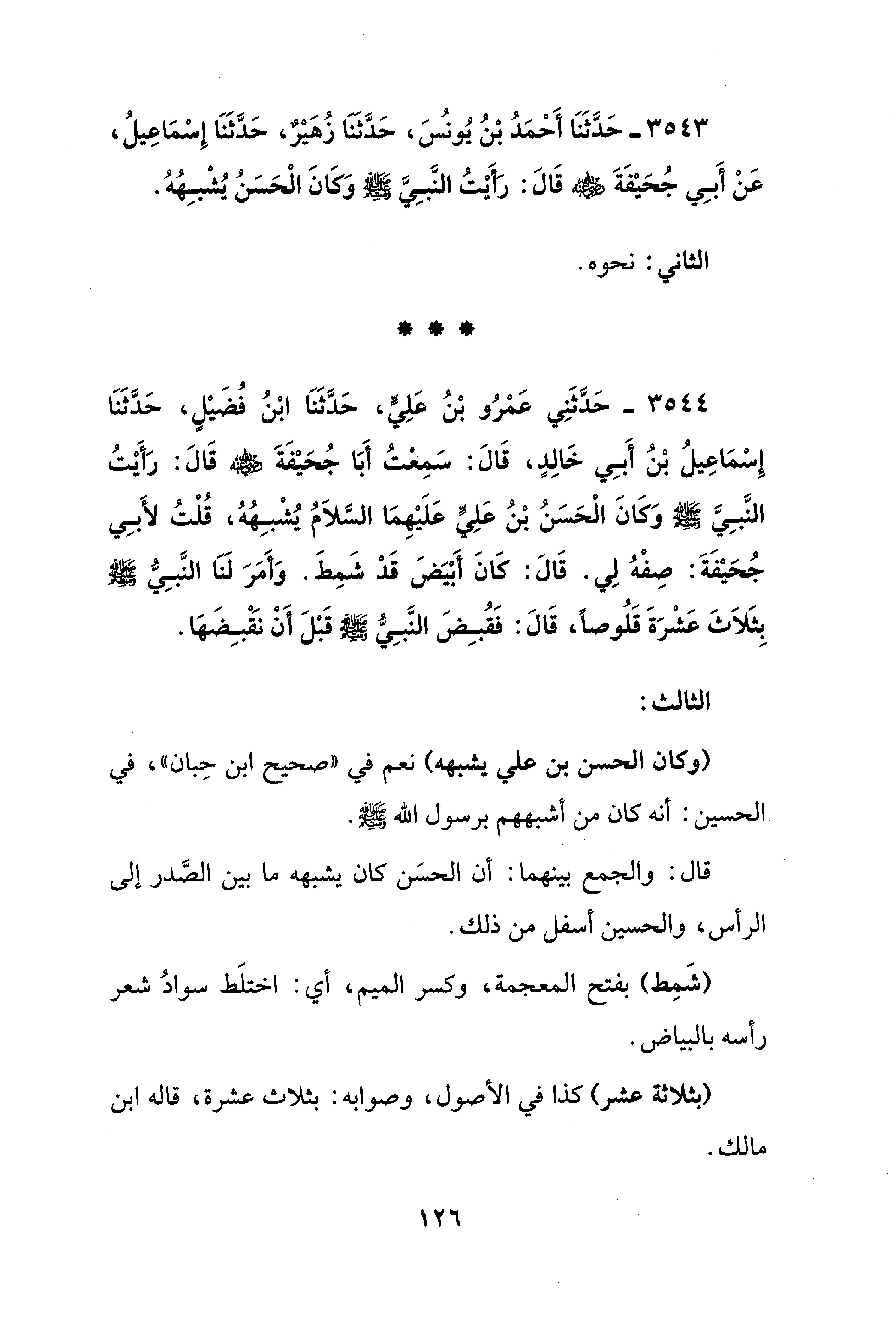 3544 - حَدَّثَنِي عَمْرُو بْنُ عَليٍّ، حَدَّثَنَا ابْنُ فُضَيْلٍ، حَدَّثَنَا إِسْمَاعِيلُ بْنُ أَبِي خَالِدٍ، قَالَ: سَمِعْتُ أَبَا جُحَيْفَةَ - رضي الله عنه - قَالَ: رَأَيْتُ النَّبِيَّ - صلى الله عليه وسلم - وَكَانَ الْحَسَنُ بْنُ عَلِيٍّ عَلَيْهِمَا السَّلاَمُ يُشْبِهُهُ، قُلْتُ لأَبِي جُحَيْفَةَ: صِفْهُ لِي. قَالَ: كَانَ أَبْيَضَ قَدْ شَمِطَ. وَأَمَرَ لَنَا النَّبِيُّ - صلى الله عليه وسلم - بِثَلاَثَ عَشْرَةَ قَلُوصًا، قَالَ: فَقُبِضَ النَّبِيُّ - صلى الله عليه وسلم - قَبْلَ أَنْ نَقْبِضَهَا.