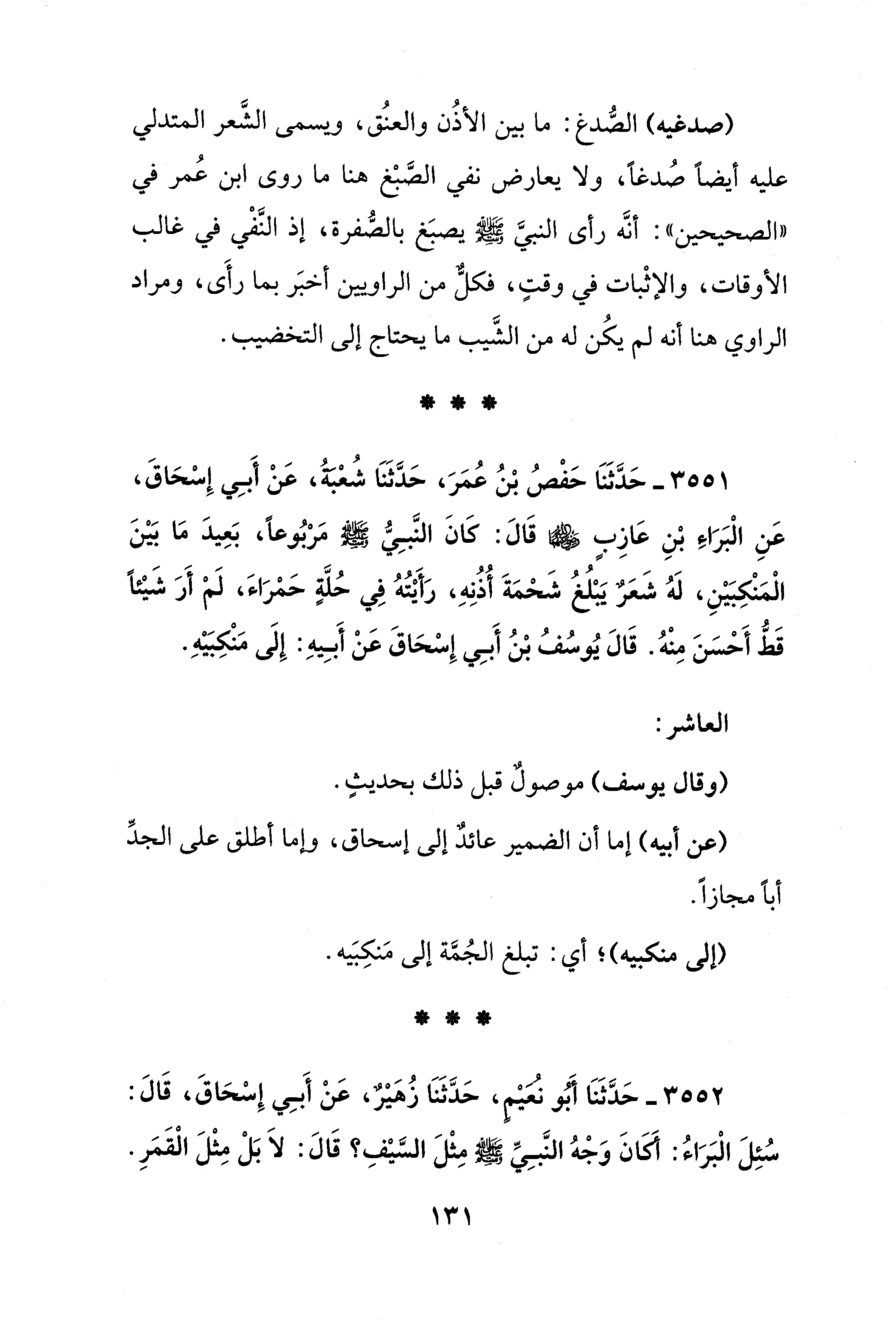 3551 - حَدَّثَنَا حَفْصُ بْنُ عُمَرَ، حَدَّثَنَا شُعْبَةُ، عَنْ أَبِي إِسْحَاقَ، عَنِ الْبَرَاءِ بْنِ عَازِبٍ - رضي الله عنهما - قَالَ: كَانَ النَّبِيُّ - صلى الله عليه وسلم - مَرْبُوعًا، بَعِيدَ مَا بَيْنَ الْمَنْكِبَيْنِ، لَهُ شَعَرٌ يَبْلُغُ شَحْمَةَ أُذُنِهِ، رَأَيْتُهُ فِي حُلَّةٍ حَمْرَاءَ، لَمْ أَرَ شَيْئًا قَطُّ أَحْسَنَ مِنْهُ. قَالَ يُوسُفُ بْنُ أَبِي إِسْحَاقَ عَنْ أَبِيهِ: إِلَى مَنْكِبَيْهِ.
