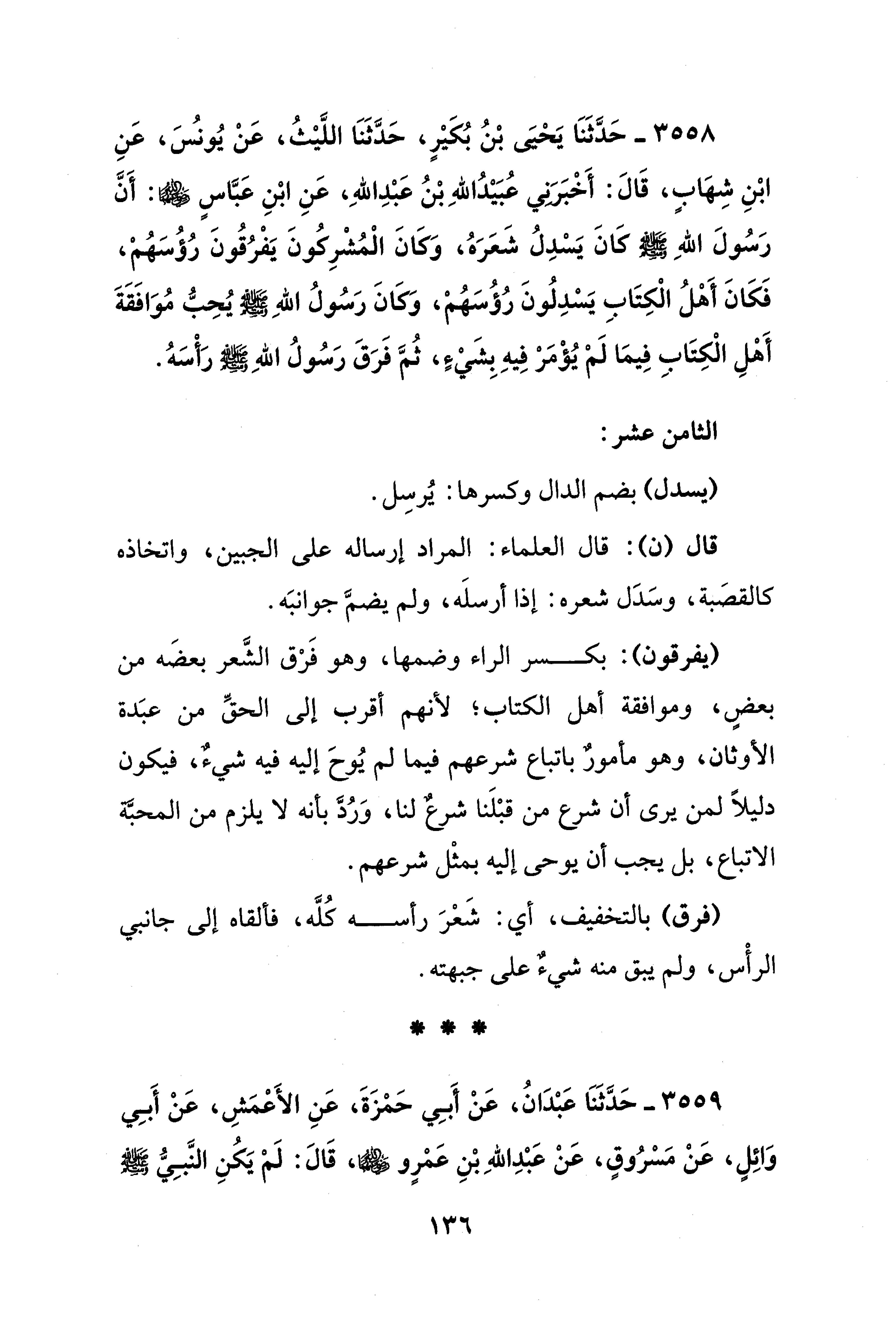 3558 - حَدَّثَنَا يَحْيَى بْنُ بُكَيْرٍ، حَدَّثَنَا اللَّيْثُ، عَنْ يُونُسُ، عَنِ ابْنِ شِهَابٍ، قَالَ: أَخْبَرَنِي عُبَيْدُ اللهِ بْنُ عَبْدِ اللهِ، عَنِ ابْنِ عَبَّاسٍ - رضي الله عنهما -: أَنَّ رَسُولَ اللهِ - صلى الله عليه وسلم - كَانَ يَسْدِلُ شَعَرَهُ، وَكَانَ الْمُشْرِكُونَ يَفْرُقُونَ رُؤُسَهُمْ، فَكَانَ أَهْلُ الْكِتَابِ يَسْدِلُونَ رُؤُسَهُمْ، وَكَانَ رَسُولُ - صلى الله عليه وسلم - يُحِبُّ مُوَافَقَةَ أَهْلِ الْكِتَابِ فِيمَا لَمْ يُؤْمَرْ فِيهِ بِشَيْءٍ، ثُمَّ فَرَقَ رَسُولُ اللهِ - صلى الله عليه وسلم - رَأْسَهُ.