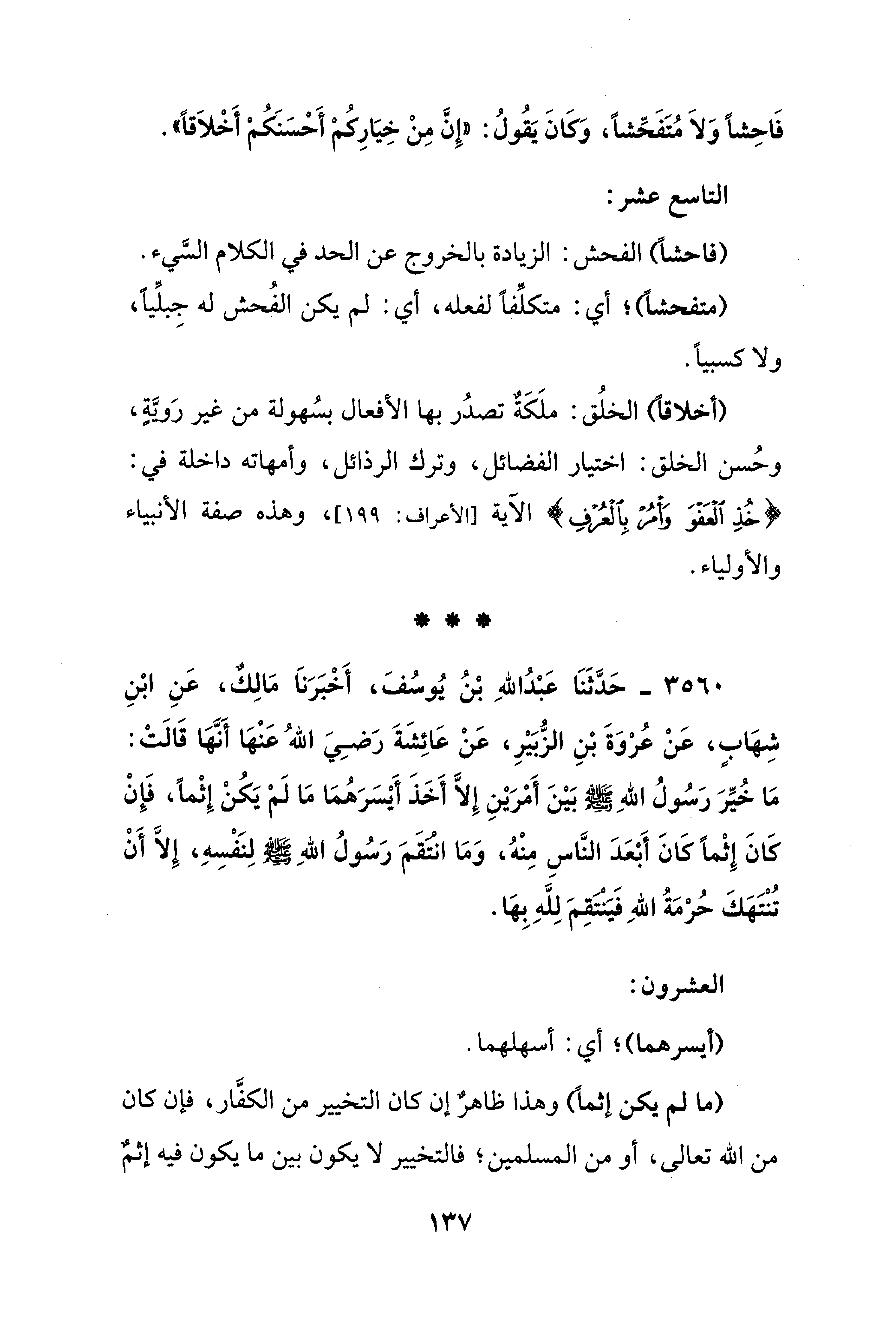 3560 - حَدَّثَنَا عَبْدُ اللهِ بْنُ يُوسُفَ، أَخْبَرَنَا مَالِكٌ، عَنِ ابْنِ شِهَابٍ، عَنْ عُرْوَةَ بْنِ الزُّبَيْرِ، عَنْ عَائِشَةَ رَضِيِ اللهُ عَنْهَا أَنَّهَا قَالَتْ: مَا خُيِّرَ رَسُولُ اللهِ - صلى الله عليه وسلم - بَيْنَ أَمْرَيْنِ إِلَّا أَخَذَ أَيْسَرَهُمَا مَا لَمْ يَكُنْ إِثْمًا، فَإِنْ كَانَ إِثْمًا كَانَ أَبْعَدَ النَّاسِ مِنْهُ، وَمَا انْتَقَمَ رَسُولُ اللهِ - صلى الله عليه وسلم - لِنَفْسِهِ، إِلَّا أَنْ تُنْتَهَكَ حُرْمَةُ اللهِ فَيَنْتَقِمَ لِلَّهِ بِهَا.