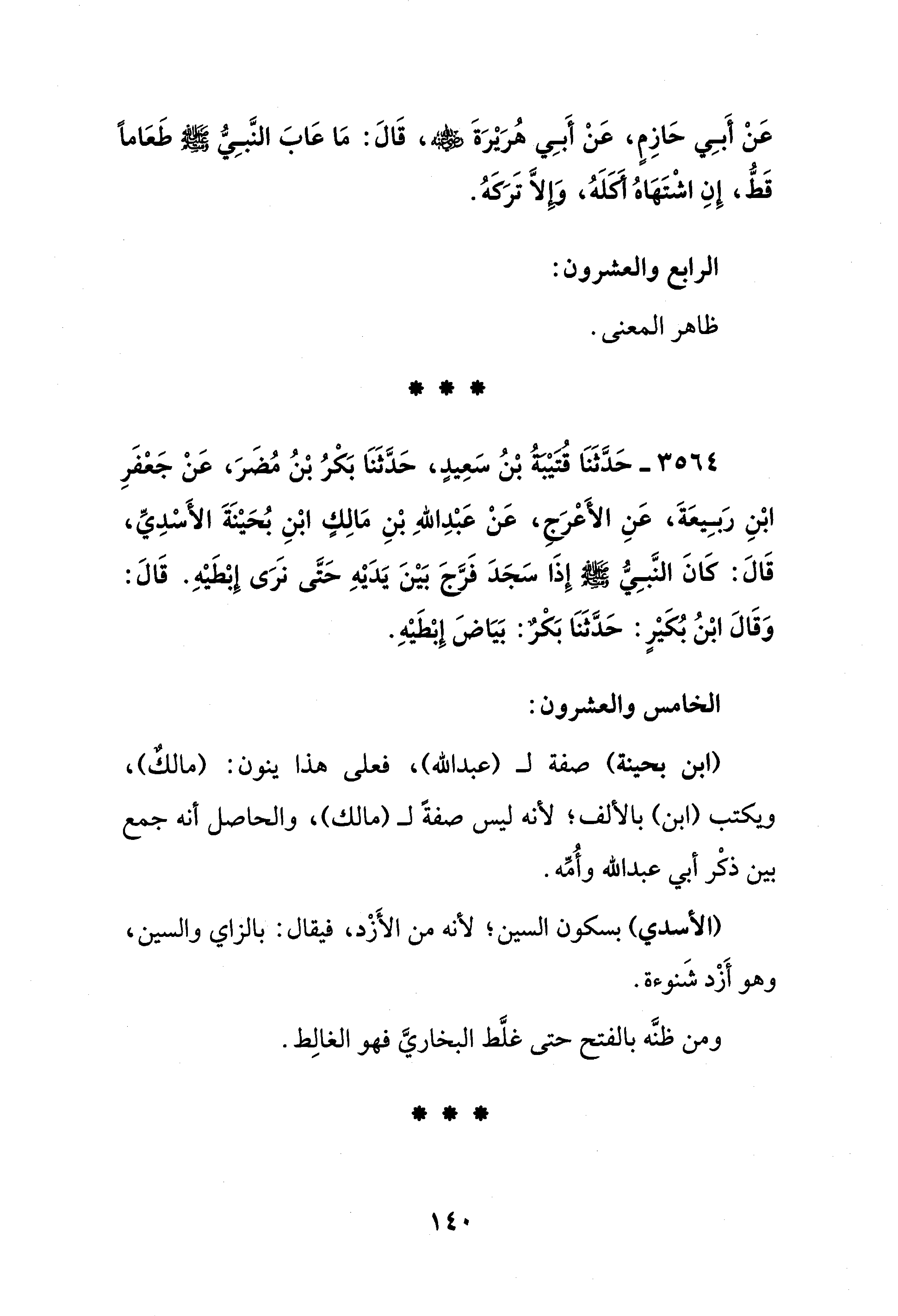 عَنْ أَبِي حَازِمٍ، عَنْ أَبِي هُرَيْرَةَ - رضي الله عنه -، قَالَ: مَا عَابَ النَّبِيُّ - صلى الله عليه وسلم - طَعَامًا قَطُّ، إِنِ اشْتَهَاهُ أَكلَهُ، وَإِلَّا تَرَكَهُ.