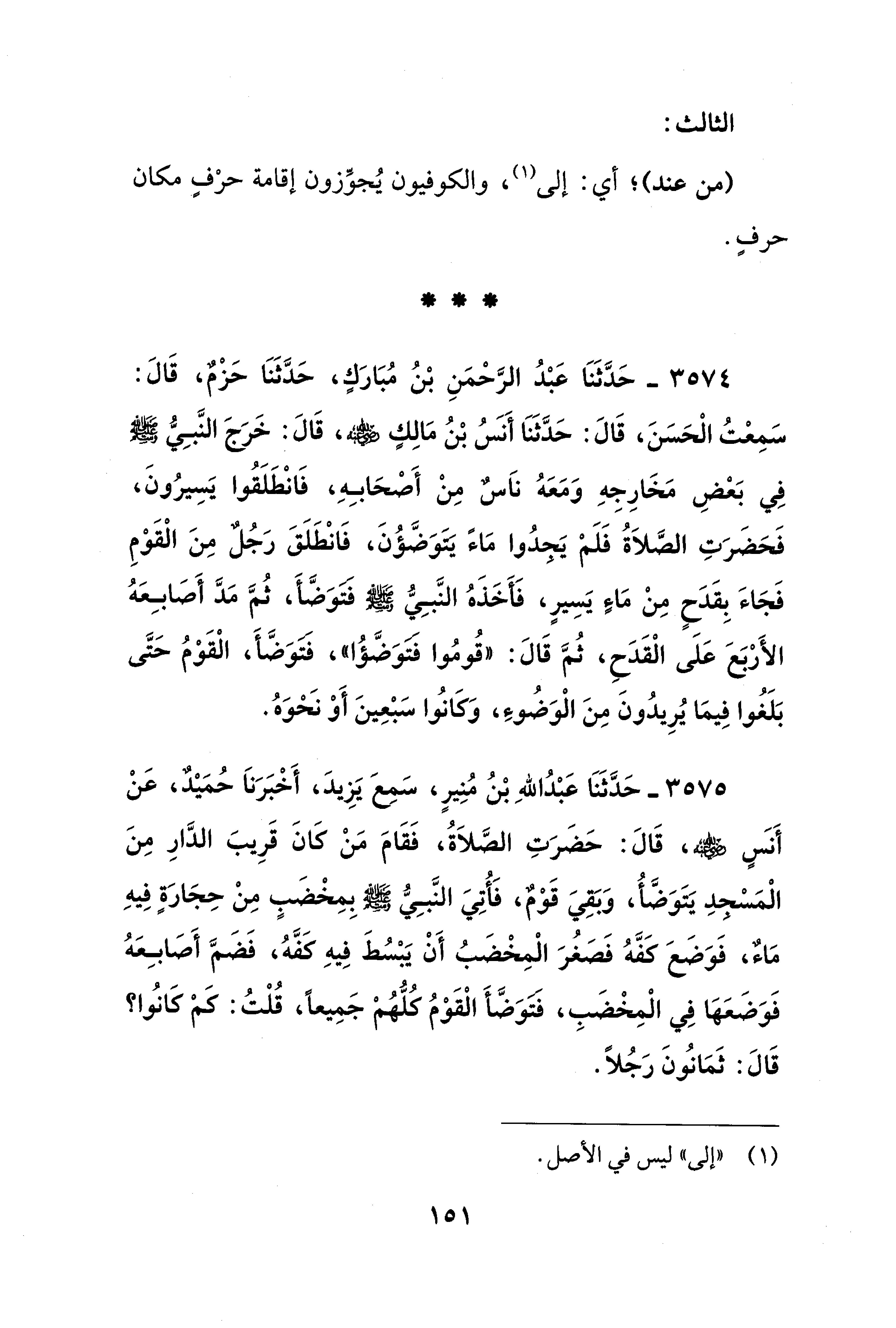 3574 - حَدَّثَنَا عَبْدُ الرَّحْمَنِ بْنُ مُبَارَكٍ، حَدَّثَنَا حَزْمٌ، قَالَ: سَمِعْتُ الْحَسَنَ، قَالَ: حَدَّثَنَا أَنَسُ بْنُ مَالِكٍ - رضي الله عنه -، قَالَ: خَرَجَ النَّبِيُّ - صلى الله عليه وسلم - فِي بَعْضِ مَخَارِجِهِ وَمَعَهُ ناَسٌ مِنْ أَصْحَابِهِ، فَانْطَلَقُوا يَسِيرُونَ، فَحَضَرَتِ الصَّلاَةُ فَلَمْ يَجدُوا مَاءً يَتَوَضَّؤُنَ، فَانْطَلَقَ رَجُلٌ مِنَ الْقَوْمِ فَجَاءَ بِقَدَحٍ مِنْ مَاءٍ يَسِيرٍ، فَأَخَذَهُ النَّبِيُّ - صلى الله عليه وسلم - فتوَضَّأَ، ثُمَّ مَدَّ أَصَابِعَهُ الأَرْبَعَ عَلَى الْقَدَحِ، ثُمَّ قَالَ: "قُومُوا فتوَضَّؤُا"، فتوَضَّأَ، الْقَوْمُ حَتَّى بَلَغُوا فِيمَا يُرِيدُونَ مِنَ الْوَضُوءِ، وَكَانُوا سَبْعِينَ أَوْ نَحْوَهُ.
