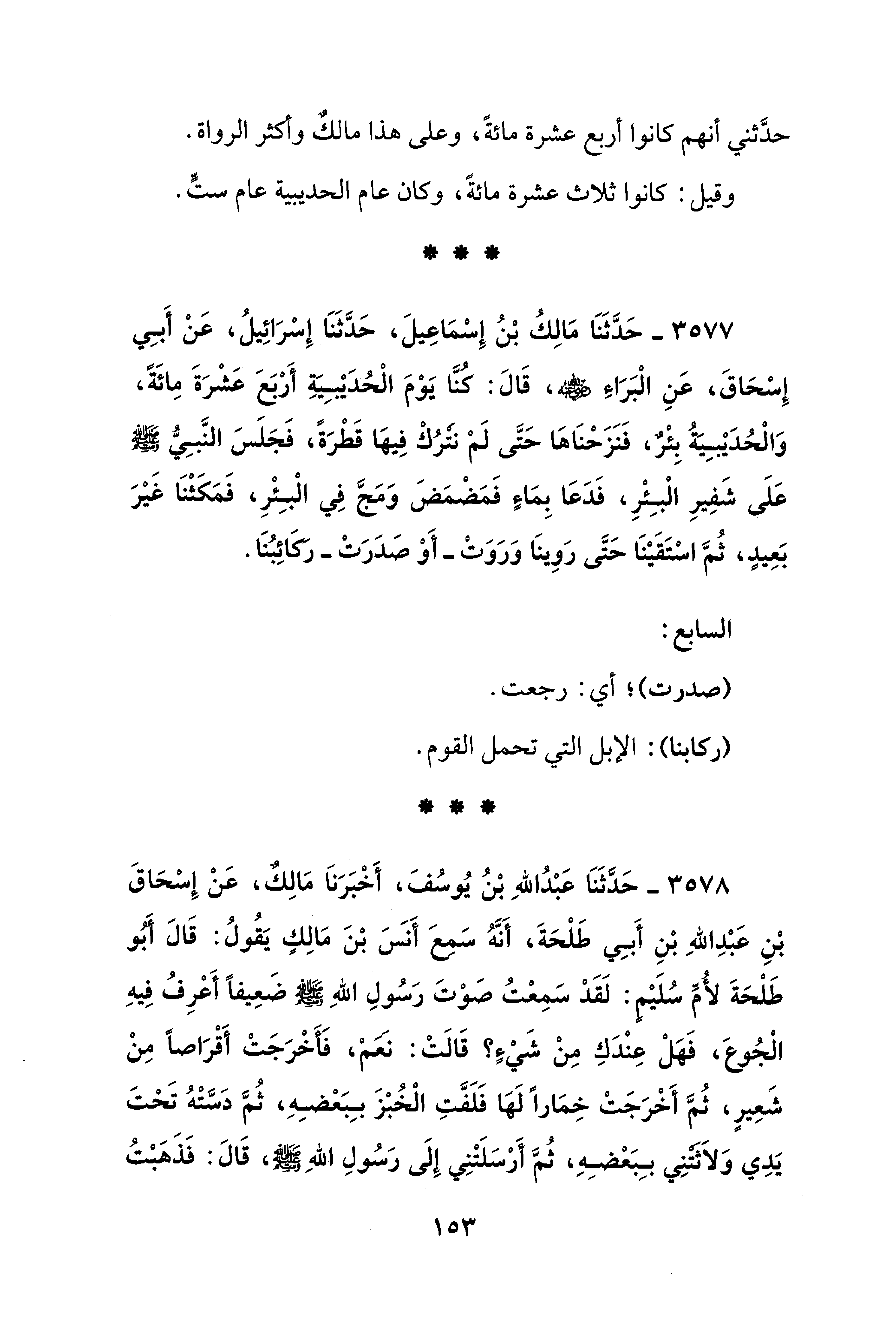 3577 - حَدَّثَنَا مَالِكُ بْنُ إِسْمَاعِيلَ، حَدَّثَنَا إِسْرَائِيلُ، عَنْ أَبِي إِسْحَاقَ، عَنِ الْبَرَاءِ - رضي الله عنه -، قَالَ: كُنَّا يَوْمَ الْحُدَيْبِيَةِ أَرْبَعَ عَشْرَةَ مِائَةً، وَالْحُدَيْبِيَةُ بِئْرٌ، فَنَزَحْنَاهَا حَتَّى لَمْ نَتْرُكْ فِيهَا قَطْرَةً، فَجَلَسَ النَبِيُّ - صلى الله عليه وسلم - عَلَى شَفِيرِ الْبِئْرِ، فَدَعَا بِمَاءٍ فَمَضْمَضَ وَمَجَّ فِي الْبِئْرِ، فَمَكَثْنَا غَيْرَ بَعِيدٍ، ثُمَّ اسْتَقَيْنَا حَتَّى رَوِينَا وَرَوَتْ -أَوْ صَدَرَتْ- ركَائِبُنَا.