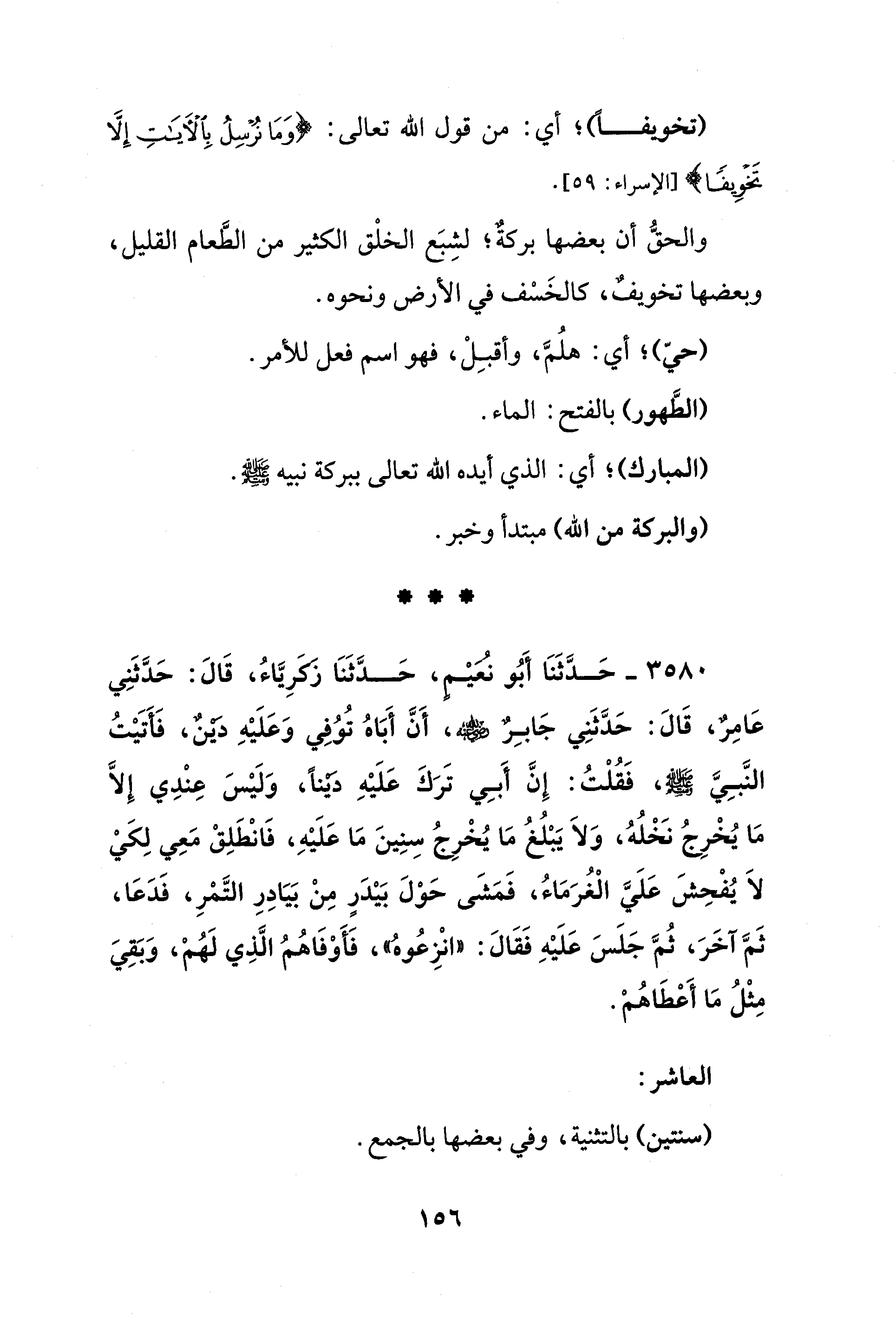 3580 - حَدَّثَنَا أَبُو نُعَيْمٍ، حَدَّثَنَا زَكَرِيَّاءُ، قَالَ: حَدَّثَنِي عَامِرٌ، قَالَ: حَدَّثَنِي جَابِرٌ - رضي الله عنه -، أَنَّ أَبَاهُ تُوُفِي وَعَلَيْهِ دينٌ، فَأَتَيْتُ النَّبِيَّ - صلى الله عليه وسلم -، فَقُلْتُ: إِنَّ أَبِي تَرَكَ عَلَيهِ دَيْنًا، وَلَيسَ عِنْدِي إلا مَا يُخْرِجُ نَخْلُهُ، وَلَا يَبْلُغُ مَا يُخْرِجُ سِنِينَ مَا عَلَيْهِ، فَانْطَلِقْ مَعِي لِكَيْ لَا يُفْحِشَ عَلَيَّ الْغُرَمَاءُ، فَمَشَى حَوْلَ بَيْدَرٍ مِنْ بَيَادِرِ التَّمْرِ، فَدَعَا، ثَمَّ آخَرَ، ثُمَّ جَلَسَ عَلَيْهِ فَقَالَ: "انْزِعُوه"، فَأَوْفَاهُمُ الَّذِي لَهُمْ، وَبَقِيَ مِثْلُ مَا أَعْطَاهُمْ.