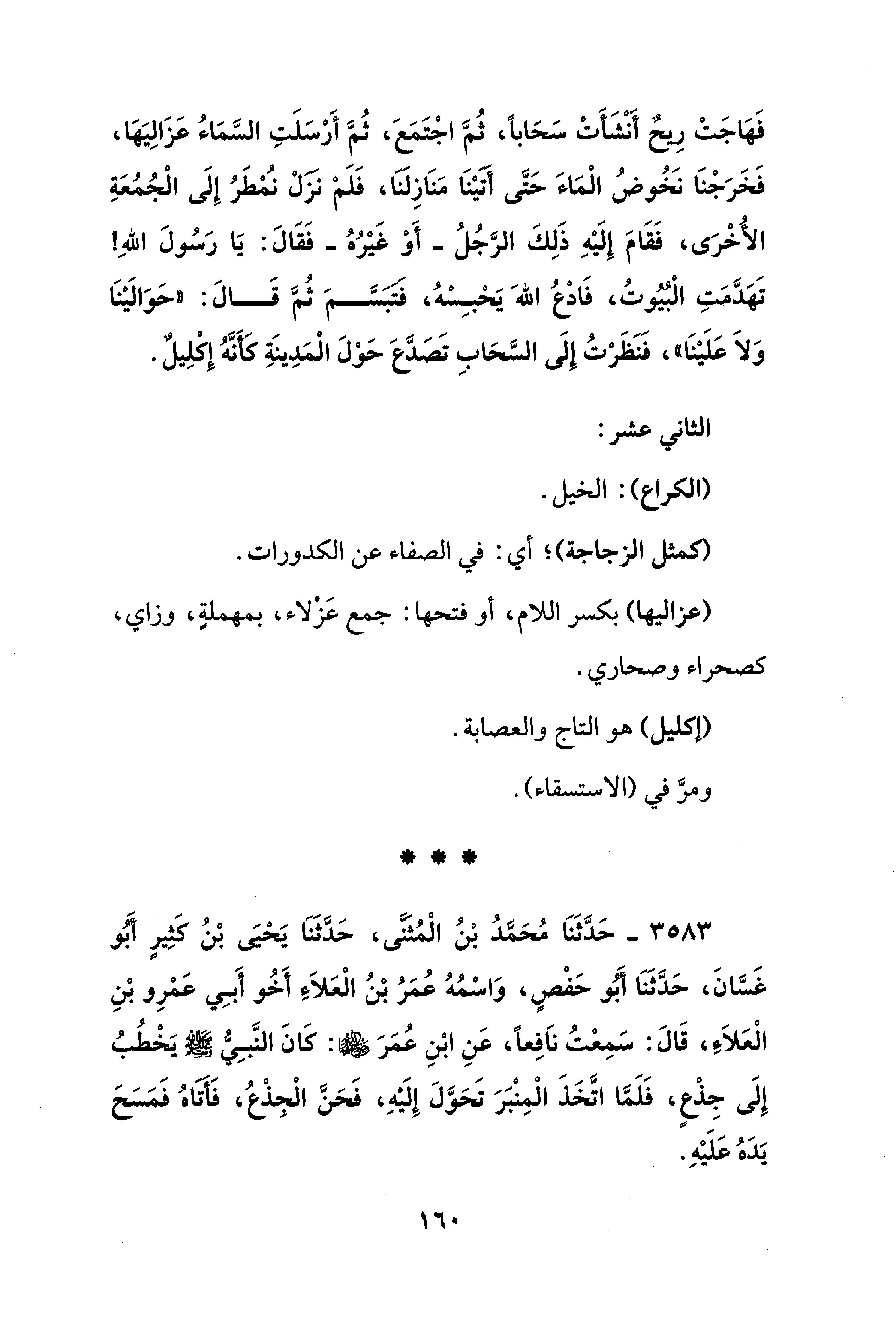 3583 - حَدَّثَنَا مُحَمَّدُ بْنُ الْمُثَنَّى، حَدَّثَنَا يَحْيَى بْنُ كَثِيرٍ أَبُو غَسَّانَ، حَدَّثَنَا أَبُو حَفْصٍ، وَاسْمُهُ عُمَرُ بْنُ الْعَلَاءِ أَخُو أَبِي عَمْرِو بْنِ الْعَلَاءِ، قَالَ: سَمِعْتُ نَافِعًا عَنِ ابْنِ عُمَرَ - رضي الله عنهما -: كَانَ النَّبِيُّ - صلى الله عليه وسلم - يَخْطُبُ إِلَى جِذْعٍ، فَلَمَّا اتَّخَذَ الْمِنْبَرَ تَحَوَّلَ إِلَيْهِ، فَحَنَّ الْجذْع، فَأَتاهُ فَمَسَحَ يَدَهُ عَلَيْهِ.