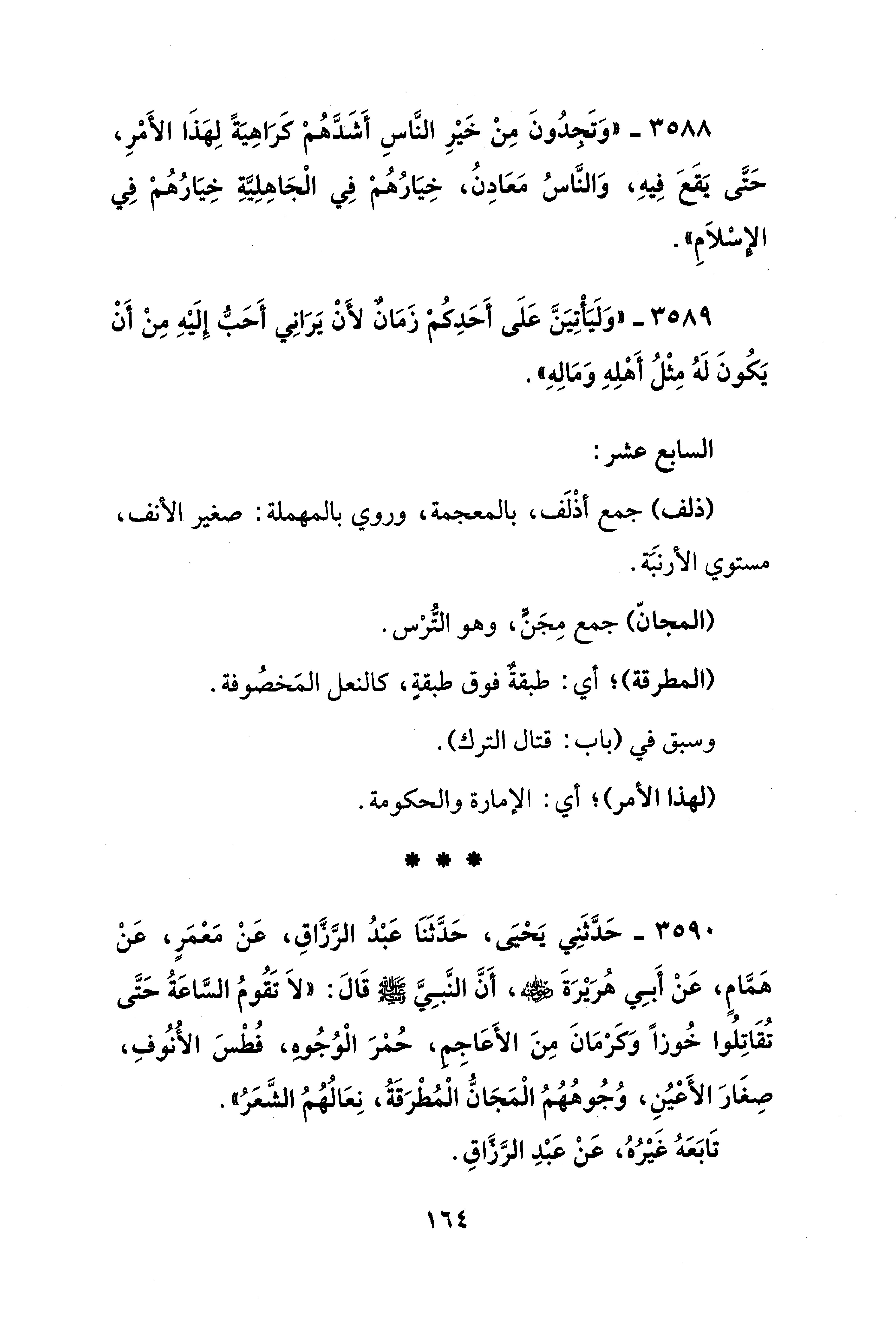 3590 - حَدَّثَنِي يَحْيَى، حَدَّثَنَا عَبْدُ الرَّزَاقِ، عَنْ مَعْمَرٍ، عَنْ هَمَّامٍ، عَنْ أَبِي هُرَيْرَةَ - رضي الله عنه -، أَنَّ النَّبِيَّ - صلى الله عليه وسلم - قَالَ: "لَا تَقُومُ السَّاعَةُ حَتَّى تُقَاتِلُوا خُوزًا وَكَرْمَانَ مِنَ الأَعَاجِمِ، حُمْرَ الْوُجُوه، فُطْسَ الأُنُوفِ، صِغَارَ الأَعْيُنِ، وُجُوهُهُمُ الْمَجَانُّ الْمُطْرَقَةُ، نِعَالُهُمُ الشَّعَرُ".