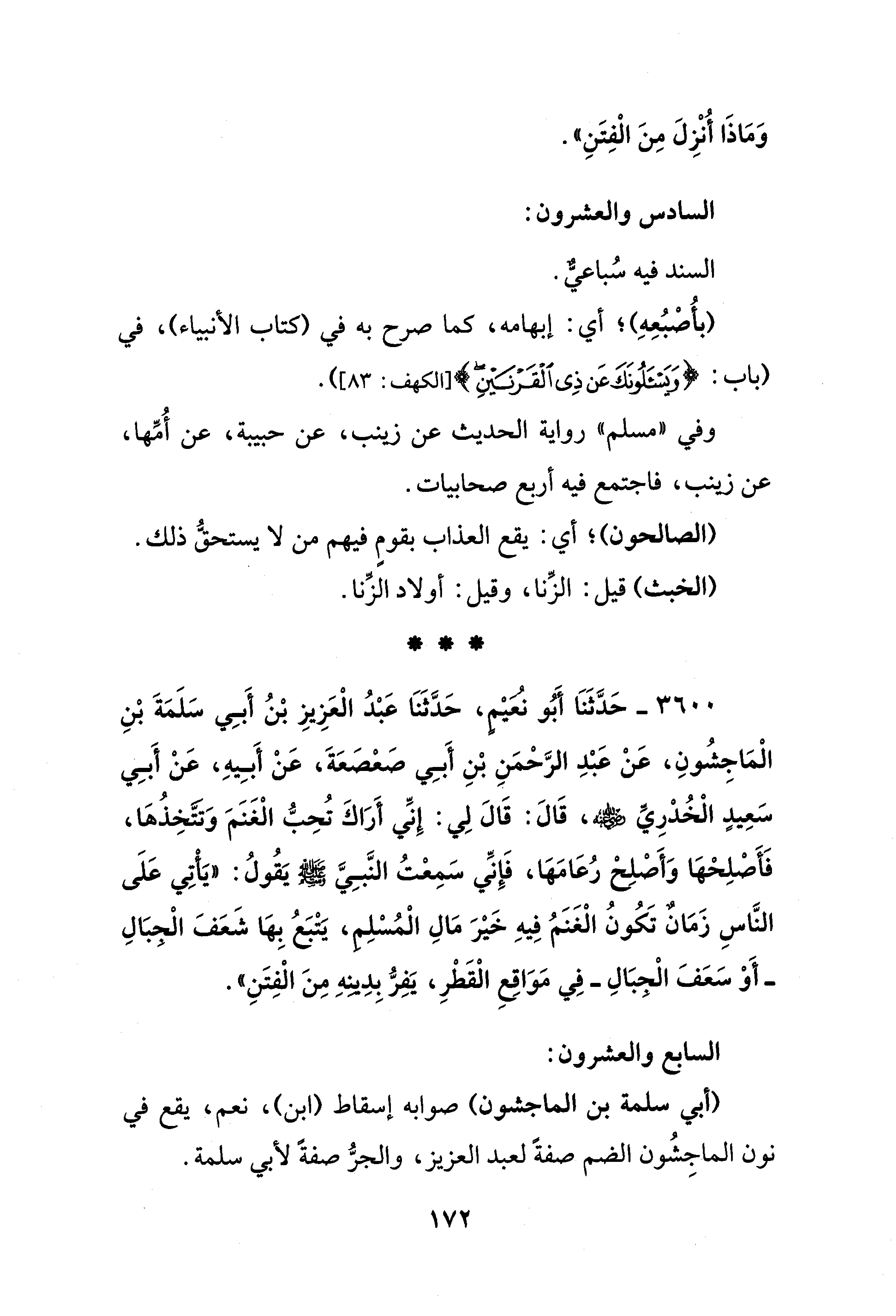 3600 - حَدَّثَنَا أَبُو نُعَيْم، حَدَّثَنَا عَبْدُ الْعَزِيزِ بْنُ أَبِي سَلَمَةَ بْنِ الْمَاجِشُونِ، عَنْ عَبْدِ الرَّحْمَنِ بْنِ أَبِي صَعْصَعَةَ، عَنْ أَبِيهِ، عَنْ أَبِي سَعِيدٍ الْخُدْرِيِّ - رضي الله عنه -، قَالَ: قَالَ لِي: إِنِّي أَرَاكَ تُحِبُّ الْغَنَمَ وَتتَّخِذُهَا، فَأَصْلِحْهَا وَأَصْلِحْ رُعَامَهَا، فَإِنِّي سَمِعْتُ النَّبِيَّ - صلى الله عليه وسلم - يَقُولُ: "يَأْتِي عَلَى النَّاسِ زَمَان تَكُونُ الْغَنَمُ فِيهِ خَيْرَ مَالِ الْمُسْلِم، يَتْبَعُ بِهَا شَعَفَ الْجِبَالِ -أَوْ سَعَفَ الْجبَالِ- فِي مَوَاقِعِ الْقَطْرِ، يَفِرُّ بِدِينهِ مِنَ الْفِتَنِ".
