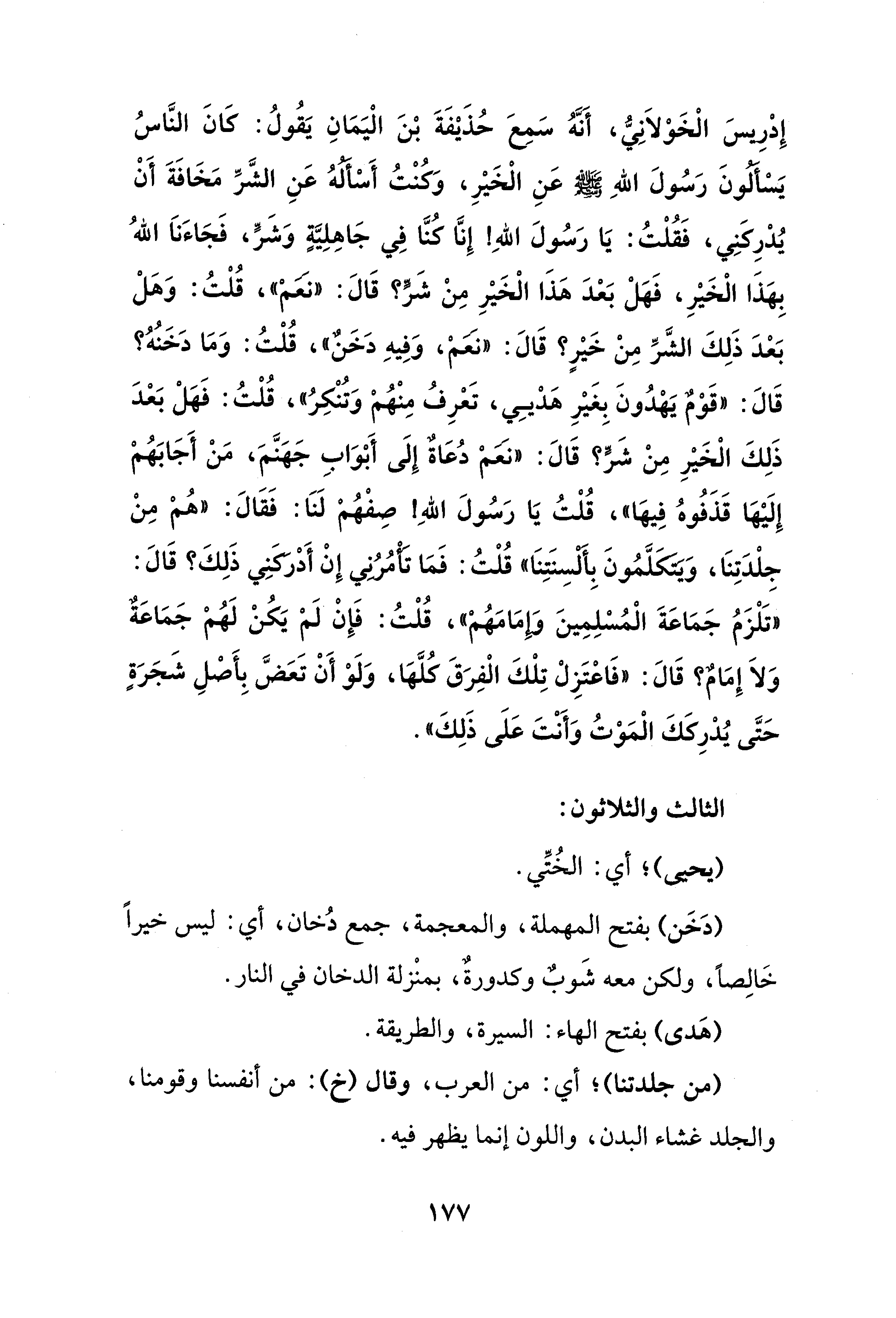 إِدْرِيسَ الْخَوْلَانِيُّ، أَنَّهُ سَمعَ حُذَيْفَةَ بْنَ الْيَمَانِ يَقُولُ: كَانَ النَّاسُ يَسْألونَ رَسُولَ اللهِ - صلى الله عليه وسلم - عَنِ الْخَيْرِ، وَكُنْتُ أَسْأَلَهُ عَنِ الشَّرِّ مَخَافَةَ أَنْ يُدْرِكَنِي، فَقُلْتُ: يَا رَسُولَ اللهِ! إِنَّا كُنَّا فِي جَاهِلِيَّةٍ وَشَرٍّ، فَجَاءَنَا اللهُ بِهَذَا الْخَيْرِ، فَهَلْ بَعْدَ هَذَا الْخَيْرِ مِنْ شَرٍّ؟ قَالَ: "نَعَمْ"، قُلْتُ: وَهَلْ بَعْدَ ذَلِكَ الشَّرِّ مِنْ خَيْرٍ؟ قَالَ: "نَعَمْ، وَفِيهِ دَخَنٌ"، قُلْتُ: وَمَا دَخَنُهُ؟ قَالَ: "قَوْمٌ يَهْدُونَ بِغَيْرِ هَدْيِي، تَعْرِفُ مِنْهُمْ وَتُنْكِرُ"، قُلْتُ: فَهَلْ بَعْدَ ذَلِكَ الْخَيْرِ مِنْ شَرٍّ؟ قَالَ: "نَعَمْ دُعَاةٌ إِلَى أَبْوَابِ جَهَنَّمَ، مَنْ أَجَابَهُمْ إِلَيْهَا قَذَفُوهُ فِيهَا"، قُلْتُ يَا رَسُولَ اللهِ! صِفْهُمْ لَنَا: فَقَالَ: "هُمْ مِنْ جِلْدَتِنَا، وَيَتَكَلَّمُونَ بِأَلْسِنَتِنَا" قُلْتُ: فَمَا تَأَمُرُني إِنْ أَدْركنِي ذَلِكَ؟ قَالَ: "تَلْزَمُ جَمَاعَةَ الْمُسْلِمِينَ وإمَامَهُمْ"، قُلْتُ: فَإِنْ لَمْ يَكُنْ لَهُمْ جَمَاعَةٌ وَلَا إِمَامٌ؟ قَالَ: "فَاعْتَزِلْ تِلْكَ الْفِرَقَ كُلَّهَا، وَلَوْ أَنْ تَعَضَّ بِأَصْلِ شَجَرَةٍ حَتَّى يُدْرِكَكَ الْمَوْتُ وَأَنْتَ عَلَى ذَلِكَ؟.