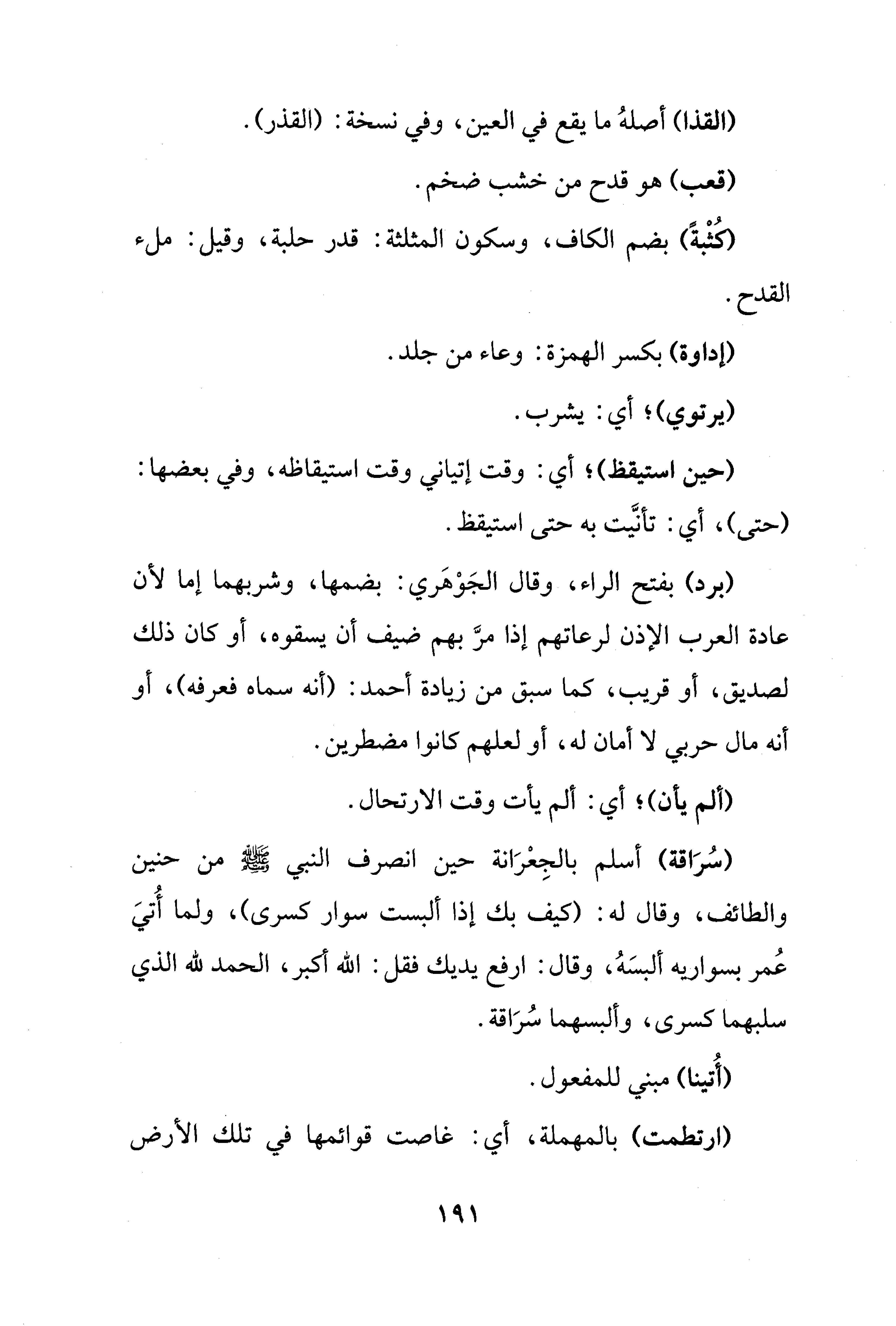(سُرَاقة) أسلم بالجِعْرَانة حين انصرف النّبيّ - صلى الله عليه وسلم - من حنين والطائف، وقال له: (كيف بك إذا ألبست سوار كسرى)، ولما أُتِيَ عُمر بسواريه ألبسَهُ، وقال: ارفع يديك فقل: الله أكبر، الحمد لله الّذي سلبهما كسرى، وألبسهما سُرَاقة.