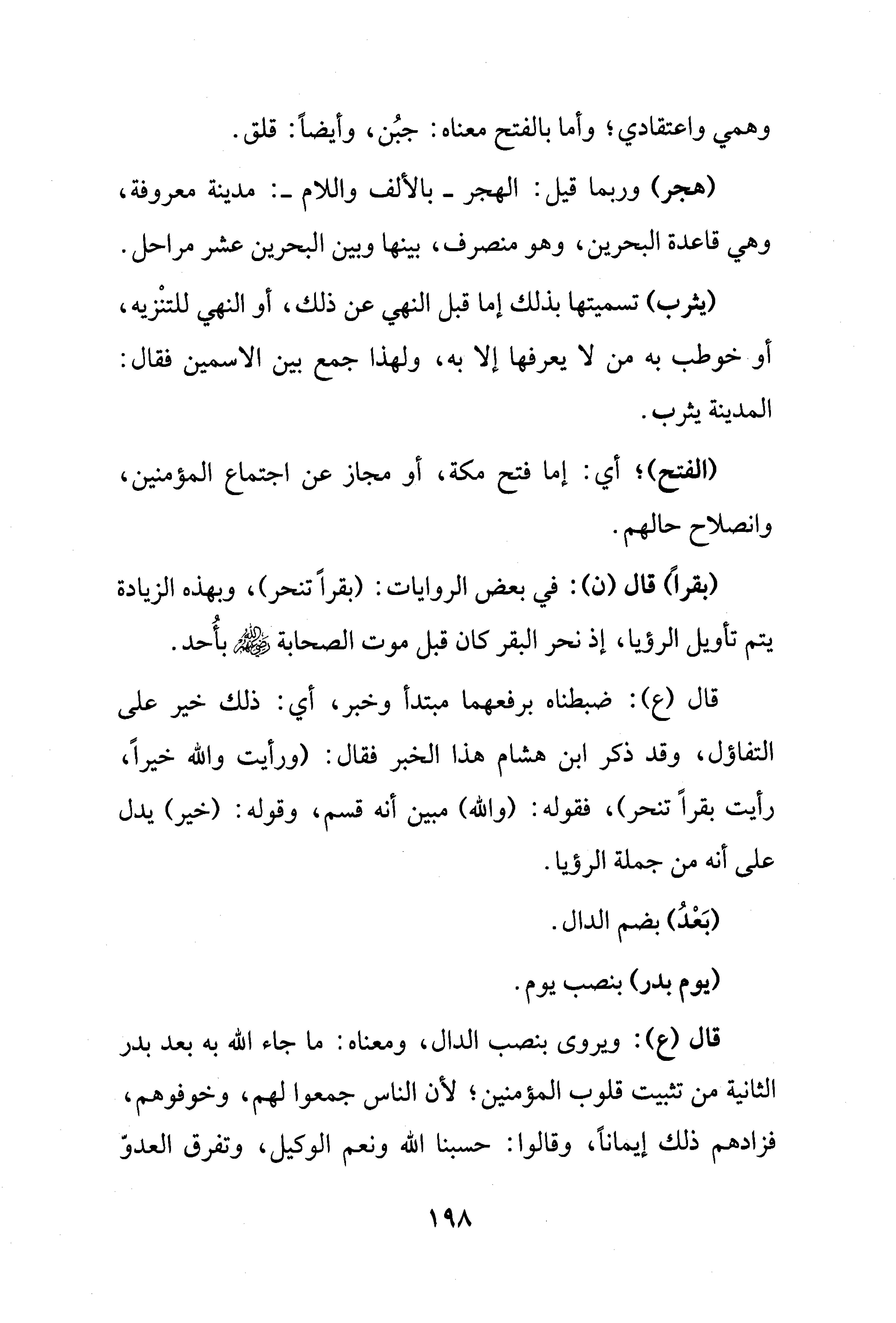 (بقرًا) قال (ن): في بعض الروايات: (بقرًا تنحر)، وبهذه الزيادة يتم تأويل الرؤيا، إذ نحر البقر كان قبل موت الصّحابة - صلى الله عليه وسلم - بأُحد.