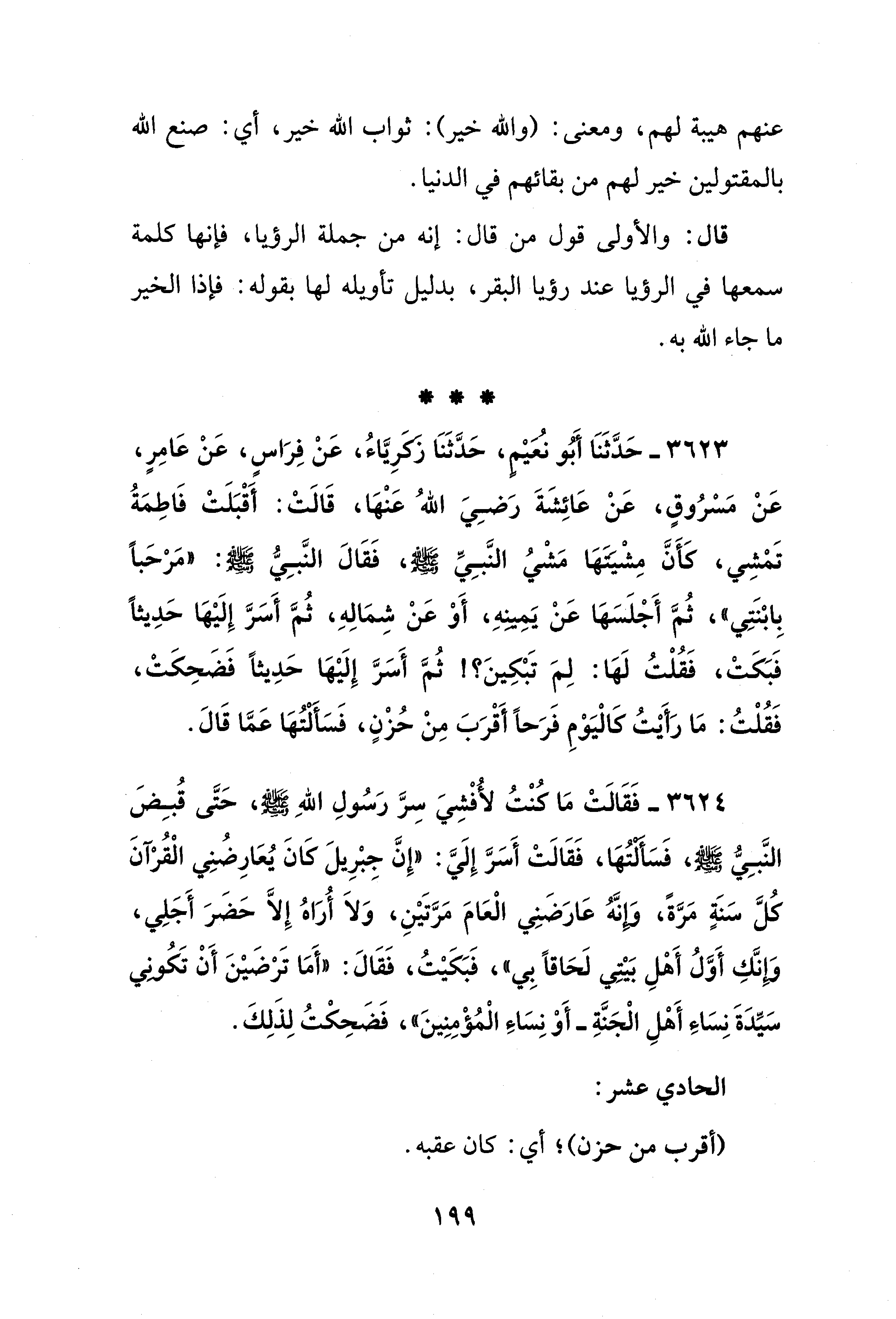3623 - حَدَّثَنَا أَبُو نُعَيْمِ، حَدَّثَنَا زَكَرِيَّاءُ، عَنْ فِرَاسٍ، عَنْ عَامِرٍ، عَنْ مَسْرُوقٍ، عَنْ عَائِشَةَ رَضِيَ اللهُ عَنْهَا، قَالَتْ: أَقْبَلَتْ فَاطِمَةُ تَمْشِي، كَأَنَّ مِشْيَتَهَا مَشْيُ النَّبِيِّ - صلى الله عليه وسلم -، فَقَالَ النَّبِيُّ - صلى الله عليه وسلم -: "مَرْحَبًا بِابْنَتِي"، ثُمَّ أَجْلَسَهَا عَنْ يَمِينهِ، أَوْ عَنْ شِمَالِهِ، ثُمَّ أَسَرَّ إِلَيْهَا حَدِيثًا فَبَكَتْ، فَقُلْتُ لَهَا: لِمِ تَبْكِينَ؟! ثُمَّ أَسَرَّ إِلَيْهَا حَدِيثًا فَضَحِكَتْ، فَقُلْتُ: مَا رَأَيْتُ كَالْيَوْمِ فرَحًا أَقْرَبَ مِنْ حُزْنٍ، فَسَأَلْتُهَا عَمَّا قَالَ.