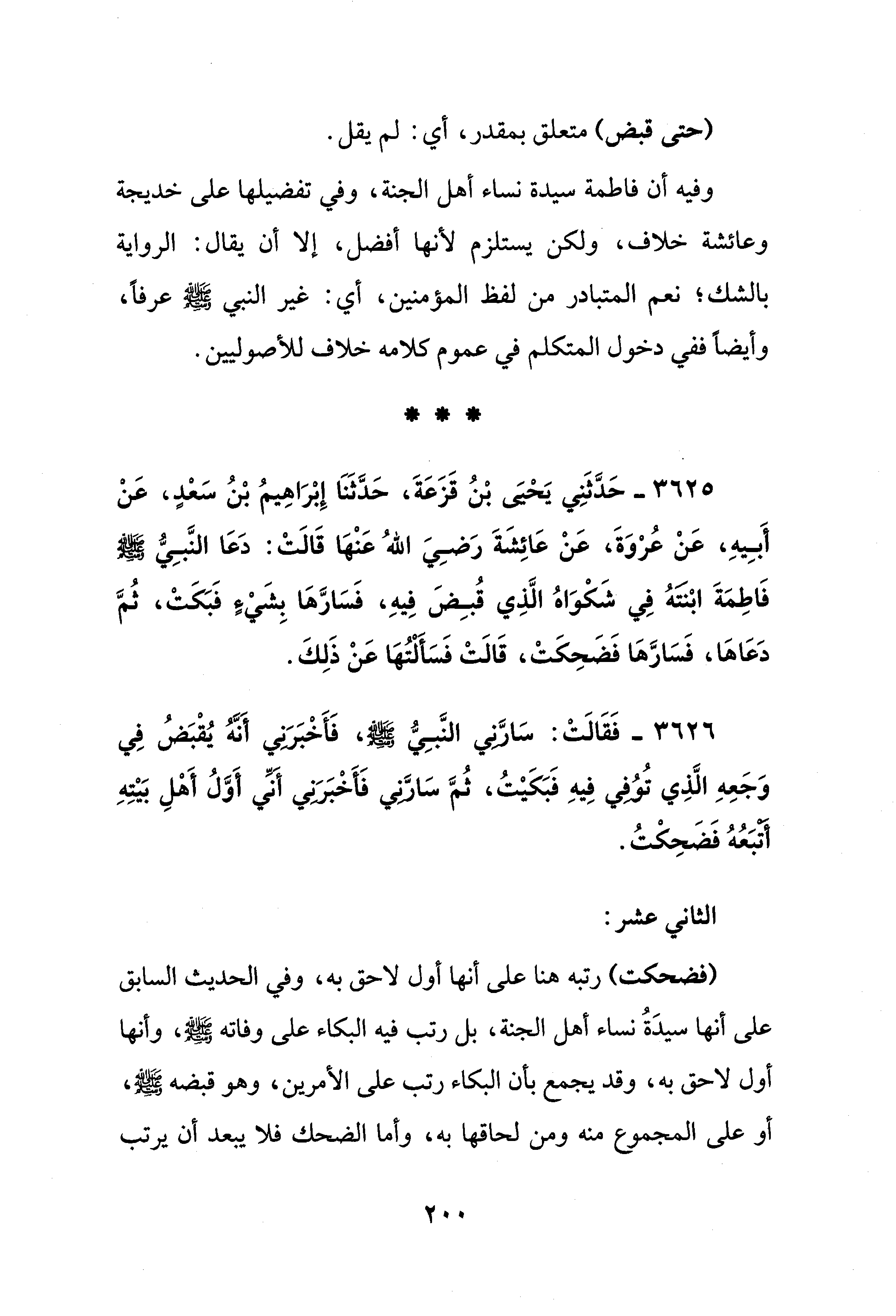 3626 - فَقَالَتْ: سَارَّنِي النَّبِيُّ - صلى الله عليه وسلم -، فَأَخْبَرَنِي أَنَّهُ يُقْبَضُ فِي وَجَعِهِ الَّذِي تُوُفِي فِيهِ فَبَكَيْتُ، ثُمَّ سَارَّنِي فَأَخْبَرَنِي أَنِّي أَوَّلُ أَهْلِ بَيْتِهِ أتبَعُهُ فَضَحِكْتُ.