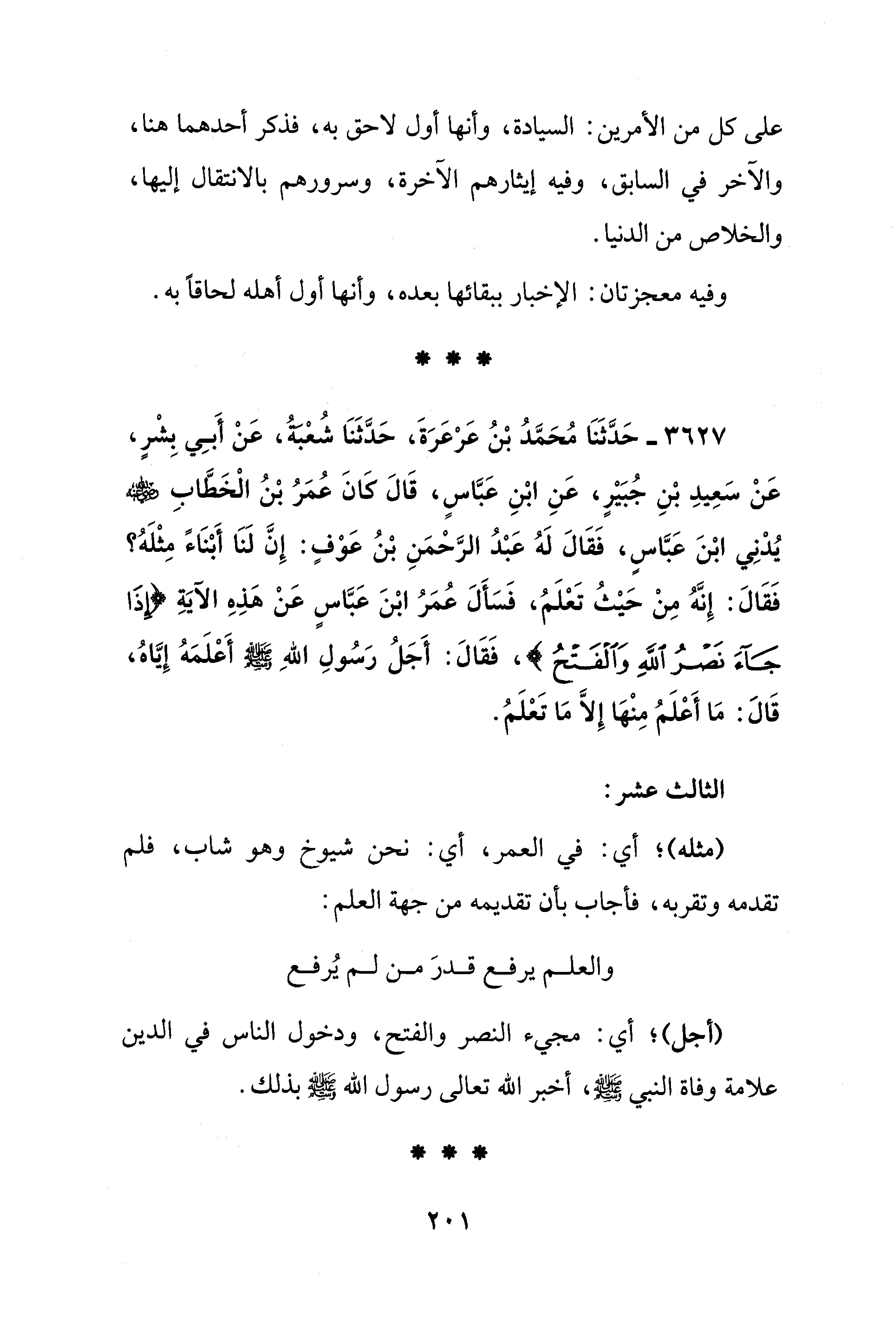3627 - حَدَّثَنَا مُحَمَّدُ بْنُ عَرْعَرَةَ، حَدَّثَنَا شُعْبَةُ، عَنْ أَبِي بِشْرٍ، عَنْ سَعِيدِ بْنِ جُبَيْرٍ، عَنِ ابْنِ عَبَّاسٍ، قَالَ كَانَ عُمَرُ بْنُ الْخَطَّابِ - رضي الله عنه - يُدْنِي ابْنَ عَبَّاسٍ، فَقَالَ لَهُ عَبْدُ الرَّحْمَنِ بْنُ عَوْفٍ: إِنَّ لنا أَبْنَاءً مِثْلَهُ؟ فَقَالَ: إِنَّهُ مِنْ حَيْثُ تَعْلَمُ، فَسَأَلَ عُمَرُ ابْنَ عَبَّاسٍ عَنْ هَذِهِ الآيَةِ {إِذَا جَاءَ نَصْرُ اللَّهِ وَالْفَتْحُ}، فَقَالَ: أَجَلُ رَسُولِ اللهِ - صلى الله عليه وسلم - أَعْلَمَهُ إِيَّاهُ، قَالَ: مَا أَعْلَمُ مِنْهَا إلا مَا تَعْلَمُ.