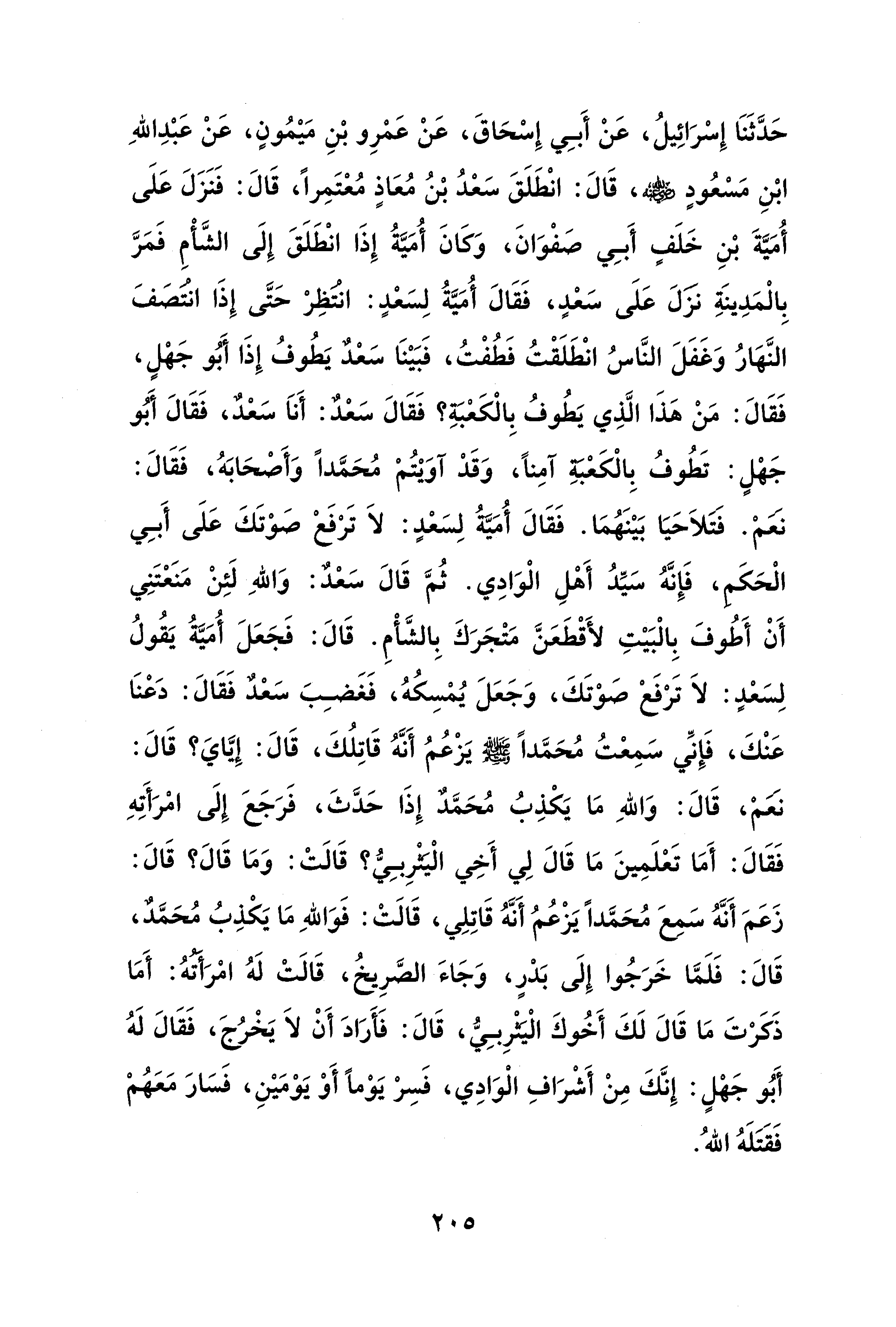حَدَّثَنَا إِسْرَائِيلُ، عَنْ أَبِي إِسْحَاقَ، عَنْ عَمْرِو بْنِ مَيْمُونٍ، عَنْ عَبْدِ اللهِ ابْنِ مَسْعُودٍ - رضي الله عنهما -، قَالَ: انْطَلَقَ سَعْدُ بْنُ مُعَاذٍ مُعْتَمِرًا، قَالَ: فَنَزَلَ عَلَى أُمَيَّةَ بْنِ خَلَفٍ أَبِي صَفْوَانَ، وَكَانَ أُمَيَّةُ إِذَا انْطَلَقَ إِلَى الشّأْمِ فَمَرَّ بِالْمَدِينَةِ نزَلَ عَلَى سَعْدٍ، فَقَالَ أُمَيَّةُ لِسَعْدٍ: انتظِرْ حَتَّى إِذَا انتصَفَ النَّهَارُ وَغَفَلَ النَّاسُ انْطَلَقْتُ فَطُفْتُ، فَبَيْنَا سَعْدٌ يَطُوفُ إِذَا أَبُو جَهْلٍ، فَقَالَ: مَنْ هَذَا الَّذِي يَطُوفُ بِالْكَعْبَةِ؟ فَقَالَ سَعْدٌ: أَنَا سَعْدٌ، فَقَالَ أَبُو جَهْلٍ: تَطُوفُ بِالْكَعْبَةِ آمِنًا، وَقَدْ آوَيْتُمْ مُحَمَّدًا وَأَصْحَابَهُ، فَقَالَ: نعمْ. فتلَاحَيَا بَيْنَهُمَا. فَقَالَ أُمَيَّةُ لِسَعْدٍ: لَا تَرْفَعْ صَوْتَكَ عَلَى أَبِي الْحَكَم، فَإنَّهُ سَيِّدُ أَهْلِ الْوَادِي. ثُمَّ قَالَ سَعْدٌ: وَاللهِ لَئِنْ مَنَعْتَنِي أَنْ أَطُوفَ بِالْبَيْتِ لأَقْطَعَنَّ مَتْجَرَكَ بِالشَّأْمِ. قَالَ: فَجَعَلَ أُمَيَّةُ يَقُولُ لِسَعْدٍ: لَا تَرْفَعْ صَوْتَكَ، وَجَعَلَ يُمْسِكُهُ، فَغَضِبَ سَعْدٌ فَقَالَ: دَعْنَا عَنْكَ، فَإِنِّي سَمِعْتُ مُحَمَّدًا - صلى الله عليه وسلم - يَزْعُمُ أَنَّهُ قَاتِلُكَ، قَالَ: إِيَّايَ؟ قَالَ: نعمْ، قَالَ: وَاللهِ مَا يَكْذِبُ مُحَمَّدٌ إِذَا حَدَّثَ، فَرَجَعَ إِلَى امْرَأَتِهِ فَقَالَ: أَمَا تَعْلَمِينَ مَا قَالَ لِي أَخِي الْيَثْربِيُّ؟ قَالَتْ: وَمَا قَالَ؟ قَالَ: زَعَمَ أَنَّهُ سَمِعَ مُحَمَّدَّا يَزْعُمُ أَنَّهُ قَاتِلِي، قَالَتْ: فَوَاللهِ مَا يَكْذِبُ مُحَمَّد، قَالَ: فَلَمَّا خَرَجُوا إِلَى بَدْرٍ، وَجَاءَ الصَّرِيخُ، قَالَتْ لَهُ امْرَأتُهُ: أَمَا ذَكَرْتَ مَا قَالَ لَكَ أَخُوكَ الْيَثْربِيُّ، قَالَ: فَأَرَادَ أَنْ لَا يَخْرُجَ، فَقَالَ لَهُ أَبُو جَهْلٍ: إِنَّكَ مِنْ أَشْرَافِ الْوَادِي، فَسِرْ يَوْمًا أَوْ يَوْمَيْنِ، فَسَارَ مَعَهُمْ فَقَتَلَهُ اللهُ.