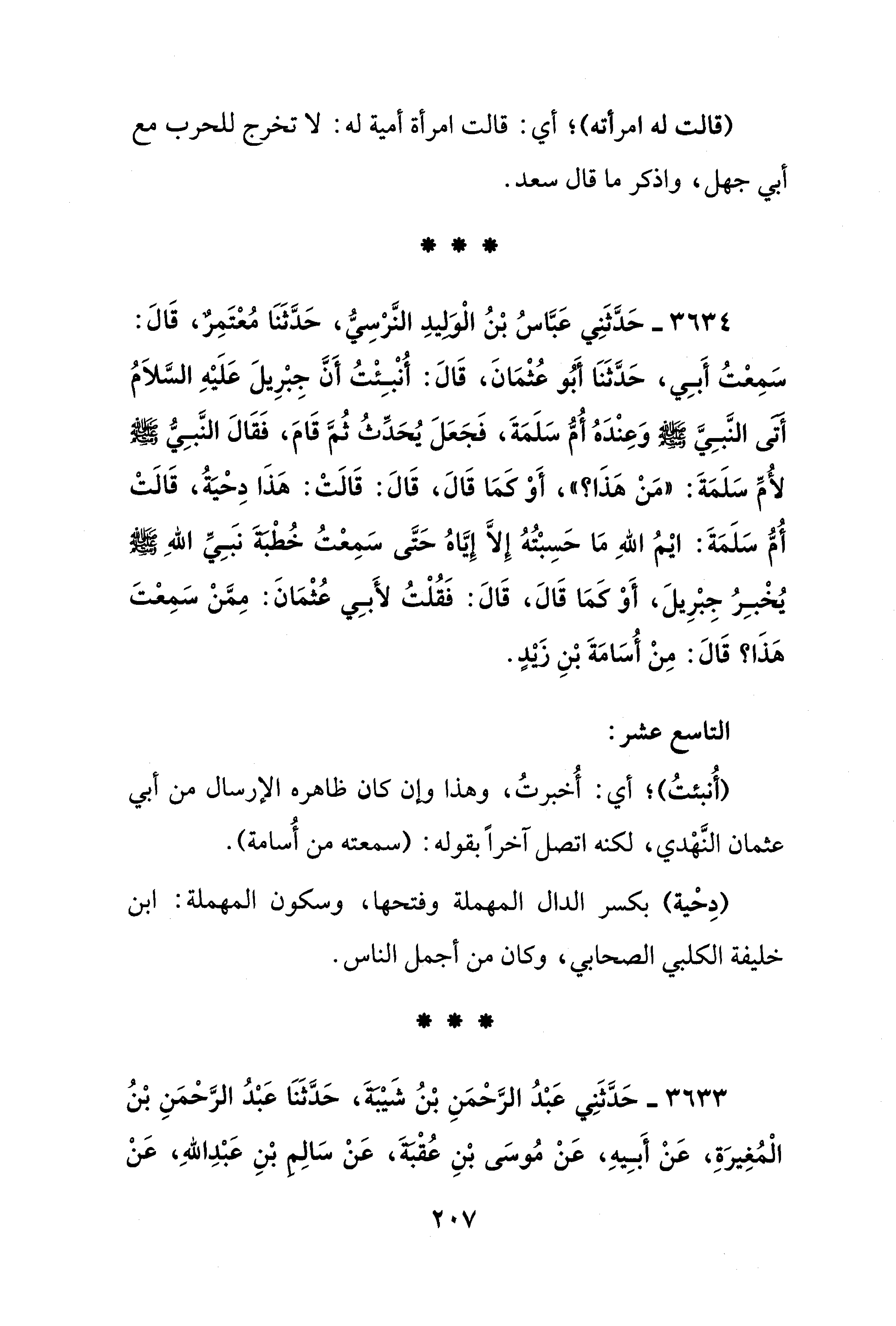 3634 - حَدَّثَنِي عَبَّاسُ بْنُ الْوَلِيدِ النَّرْسِيُّ، حَدَّثَنَا مُعْتَمِرٌ، قَالَ: سَمِعْتُ أَبِي، حَدَّثَنَا أَبُو عُثْمَانَ، قَالَ: أُنْبِئْتُ أَنَّ جِبْرِيلَ عَلَيْهِ السَّلَامُ أَتَى النَّبِيَّ - صلى الله عليه وسلم - وَعِنْدَهُ أُمُّ سَلَمَةَ، فَجَعَلَ يُحَدِّثُ ثُمَّ قَامَ، فَقَالَ النَّبِيُّ - صلى الله عليه وسلم - لأُمِّ سَلَمَةَ: "مَنْ هَذَا؟ "، أَوْ كمَا قَالَ، قَالَ: قَالَتْ: هَذَا دِحْيَةُ، قَالَتْ أُمُّ سَلَمَةَ: ايْمُ اللهِ مَا حَسِبْتُهُ إلا إِيَّاهُ حَتَّى سَمِعْتُ خُطْبَةَ نبَيِّ اللهِ - صلى الله عليه وسلم - يُخْبِرُ جِبْرِيلَ، أَوْ كمَا قَالَ، قَالَ: فَقُلْتُ لأَبِي عُثْمَانَ: مِمَّنْ سَمِعْتَ هَذَا؟ قَالَ: مِنْ أُسَامَةَ بْنِ زيدٍ.