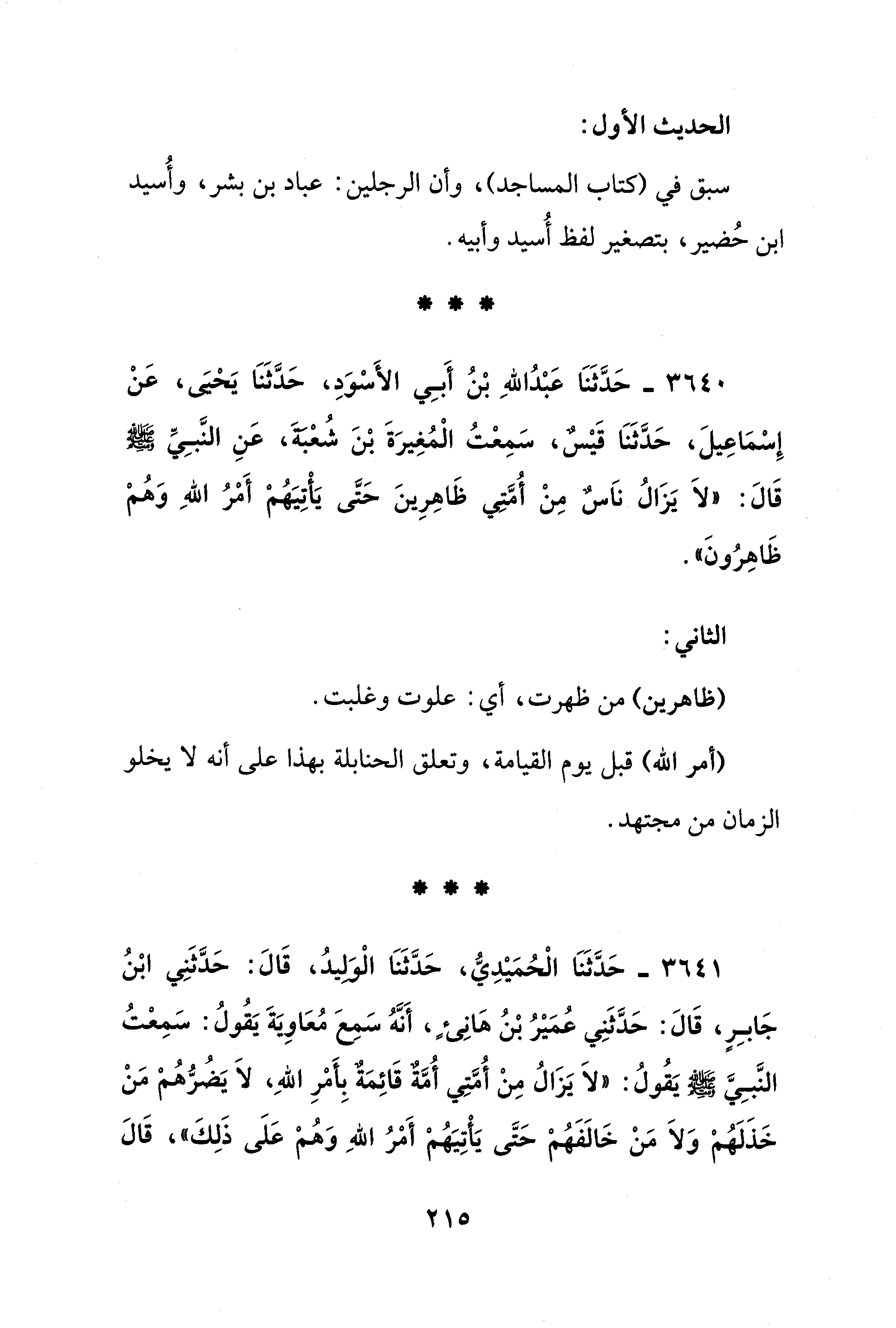 3641 - حَدَّثَنَا الْحُمَيْدِيُّ، حَدَّثَنَا الْوَلِيدُ، قَالَ: حَدَّثَنِي ابْنُ جَابِرٍ، قَالَ: حَدَّثَنِي عُمَيْرُ بْنُ هَانِئٍ، أَنَّهُ سَمعَ مُعَاوِيَةَ يَقُولُ: سَمِعْتُ النَّبِيَّ - صلى الله عليه وسلم - يَقُولُ: "لَا يَزَالُ مِنْ أُمَّتِي أُمَّةٌ قَائِمَةٌ بِأْمْرِ اللهِ، لَا يَضُرُّهُمْ مَنْ خَذَلَهُمْ وَلَا مَنْ خَالَفَهُمْ حَتَّى يَأْتِيَهُمْ أَمْرُ اللهِ وَهُمْ عَلَى ذَلِكَ"، قَالَ