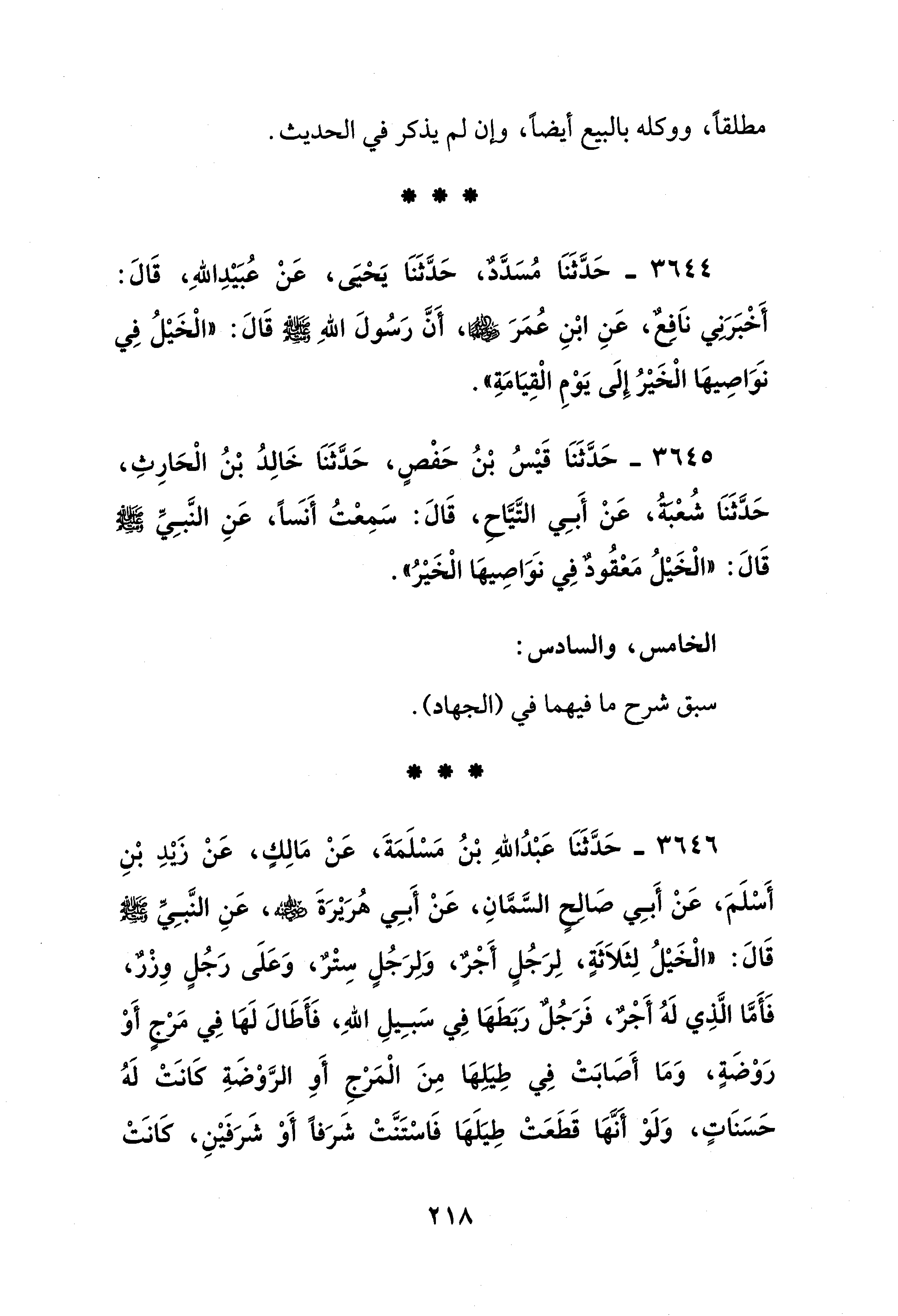3644 - حَدَّثَنَا مُسَدَّدٌ، حَدَّثَنَا يَحْيَى، عَنْ عُبَيْدِ اللهِ، قَالَ: أَخْبَرَنِي نَافِعٌ، عَنِ ابْنِ عُمَرَ - رضي الله عنهما -، أَنَّ رَسُولَ اللهِ - صلى الله عليه وسلم - قَالَ: "الْخَيْلُ فِي نَوَاصِيهَا الْخَيْرُ إِلَى يَوْمِ الْقِيَامَةِ".