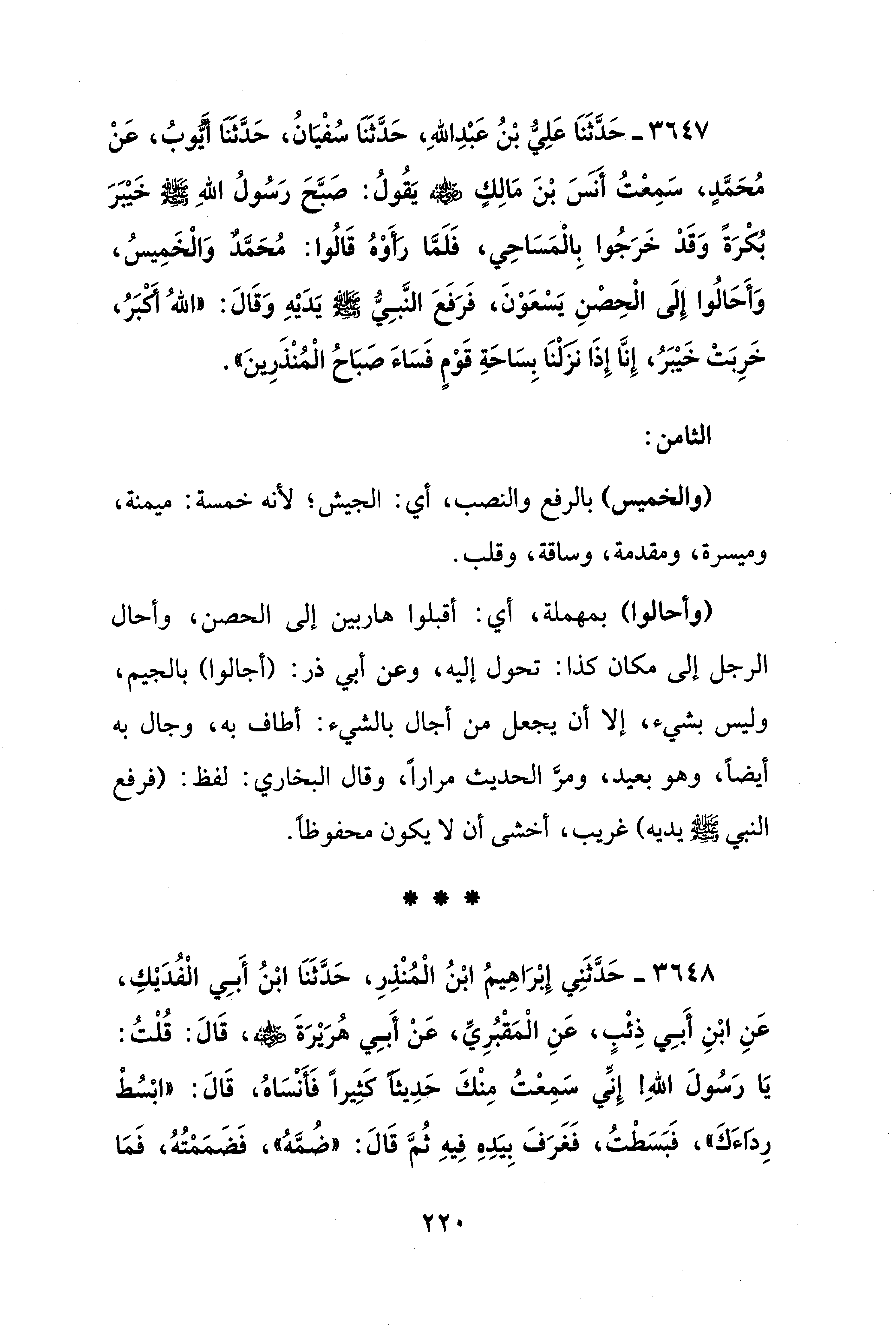 3647 - حَدَّثَنَا عَلِيُّ بْنُ عَبْدِ اللهِ، حَدَّثَنَا سُفْيَانُ، حَدَّثَنَا أَيُّوبُ، عَنْ مُحَمَّدٍ، سَمِعْتُ أَنس بْنَ مَالِكٍ - رضي الله عنه - يَقُولُ: صَبَّحَ رَسُولُ اللهِ - صلى الله عليه وسلم - خَيْبَرَ بُكْرَةً وَقَدْ خَرَجُوا بِالْمَسَاحِي، فَلَمَّا رَأَوْهُ قَالُوا: مُحَمَّدٌ وَالْخَمِيسُ، وَأَحَالُوا إِلَى الْحِصْنِ يَسْعَوْنَ، فَرَفَعَ النَّبِيُّ - صلى الله عليه وسلم - يَدَيْهِ وَقَالَ: "اللهُ أَكبَرُ، خَرِبَتْ خَيْبَرُ، إِنَّا إِذَا نزَلْنَا بِسَاحَةِ قَوْمٍ فَسَاءَ صَبَاحُ الْمُنْذَرِينَ".