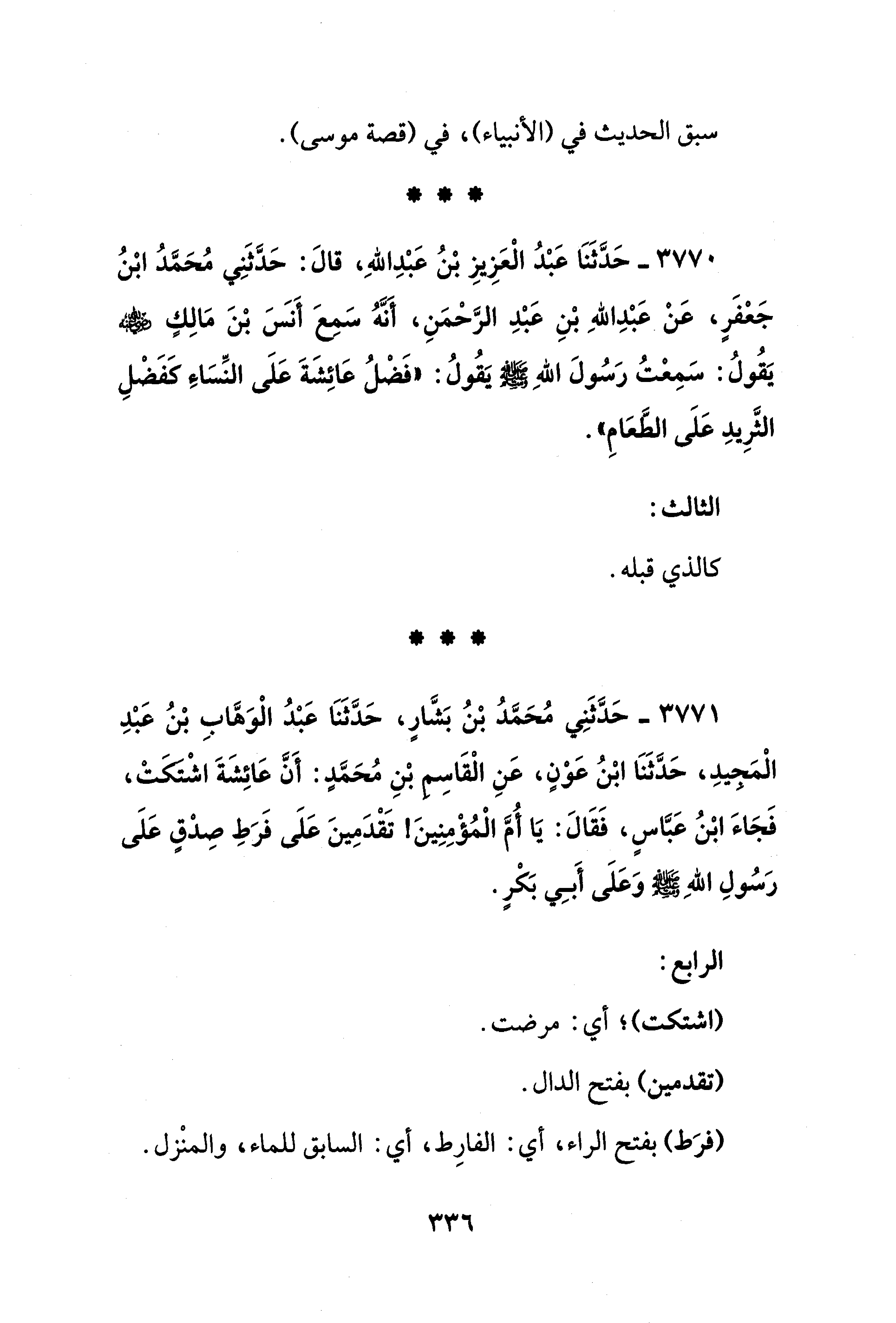 3770 - حَدَّثَنَا عَبْدُ الْعَزِيزِ بْنُ عَبْدِ اللهِ، قالَ: حَدَّثَنِي مُحَمَّدُ ابْنُ جعْفَرٍ، عَنْ عَبْدِ اللهِ بْنِ عَبْدِ الرَّحْمَنِ، أَنَّهُ سَمِعَ أَنس بْنَ مَالِكٍ - رضي الله عنه - يَقُولُ: سَمِعْتُ رَسُولَ اللهِ - صلى الله عليه وسلم - يَقُولُ: "فَضْلُ عَائِشَةَ عَلَى النِّسَاءِ كفَضْلِ الثَّرِيدِ عَلَى الطعَامِ".