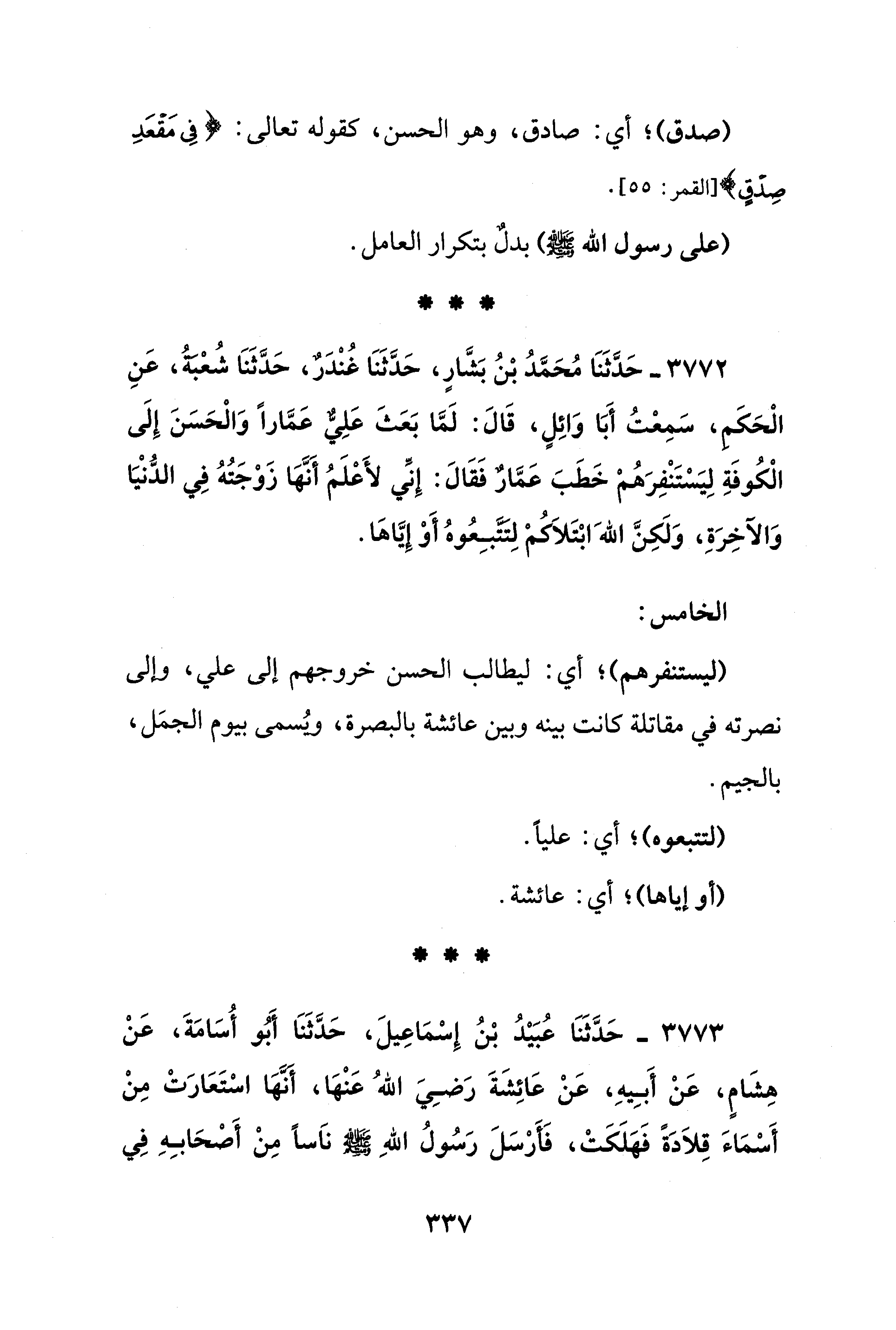 3772 - حَدَّثَنَا مُحَمَّدُ بْنُ بَشَّارٍ، حَدَّثَنَا غُنْدَرٌ، حَدَّثَنَا شُعبةُ، عَنِ الْحَكَم، سَمِعْتُ أَبَا وَائِلٍ، قَالَ: لَمَّا بَعَثَ عَلِيٌّ عَمَّارًا وَالْحَسَنَ إِلَى الْكُوفَةِ لِيَسْتَنْفِرَهُمْ خَطَبَ عَمَّارٌ فَقَالَ: إِنِّي لأَعْلَمُ أَنَّها زَوْجَتُهُ فِي الدُّنْيَا وَالآخِرَةِ، وَلَكِنَّ الله ابْتَلاَكُم لِتتَبِعُوهُ أَوْ إِيَّاها.