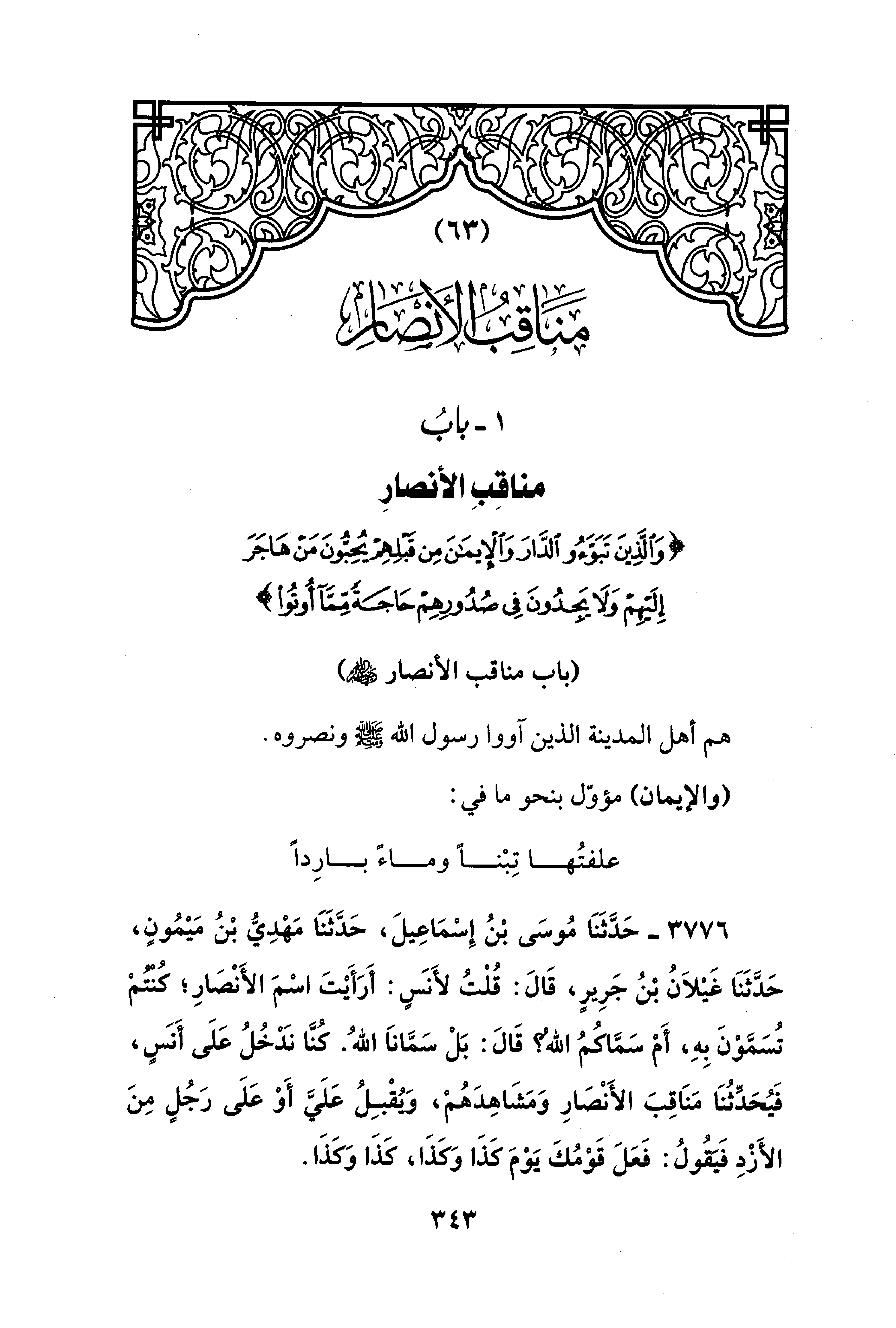 3776 - حَدَّثَنَا مُوسَى بْنُ إِسْمَاعِيلَ، حَدَّثَنَا مَهْديُّ بْنُ مَيْمُونٍ، حَدَّثَنَا غَيْلاَنُ بْنُ جَرِيرٍ، قَالَ: قُلْتُ لأَنسٍ: أَرَأَيْتَ اسْمَ ألأَنْصَارِ؛ كنْتُمْ تُسَمَّوْنَ بِهِ، أمْ سَمَّاكُمُ الله؟ قَالَ: بَلْ سَمَّاناَ اللهُ. كُنَّا ندخُلُ عَلَى أَنسٍ، فَيُحَدِّثُنَا مَنَاقِبَ الأَنْصَارِ وَمَشَاهِدَهمْ، وَيُقْبِلُ عَلَيَّ أَوْ عَلَى رَجُلٍ مِنَ الأَزْدِ فَيَقُولُ: فَعَلَ قَوْمُكَ يَوْمَ كَذَا وَكَذَا، كَذَا وَكَذَا.