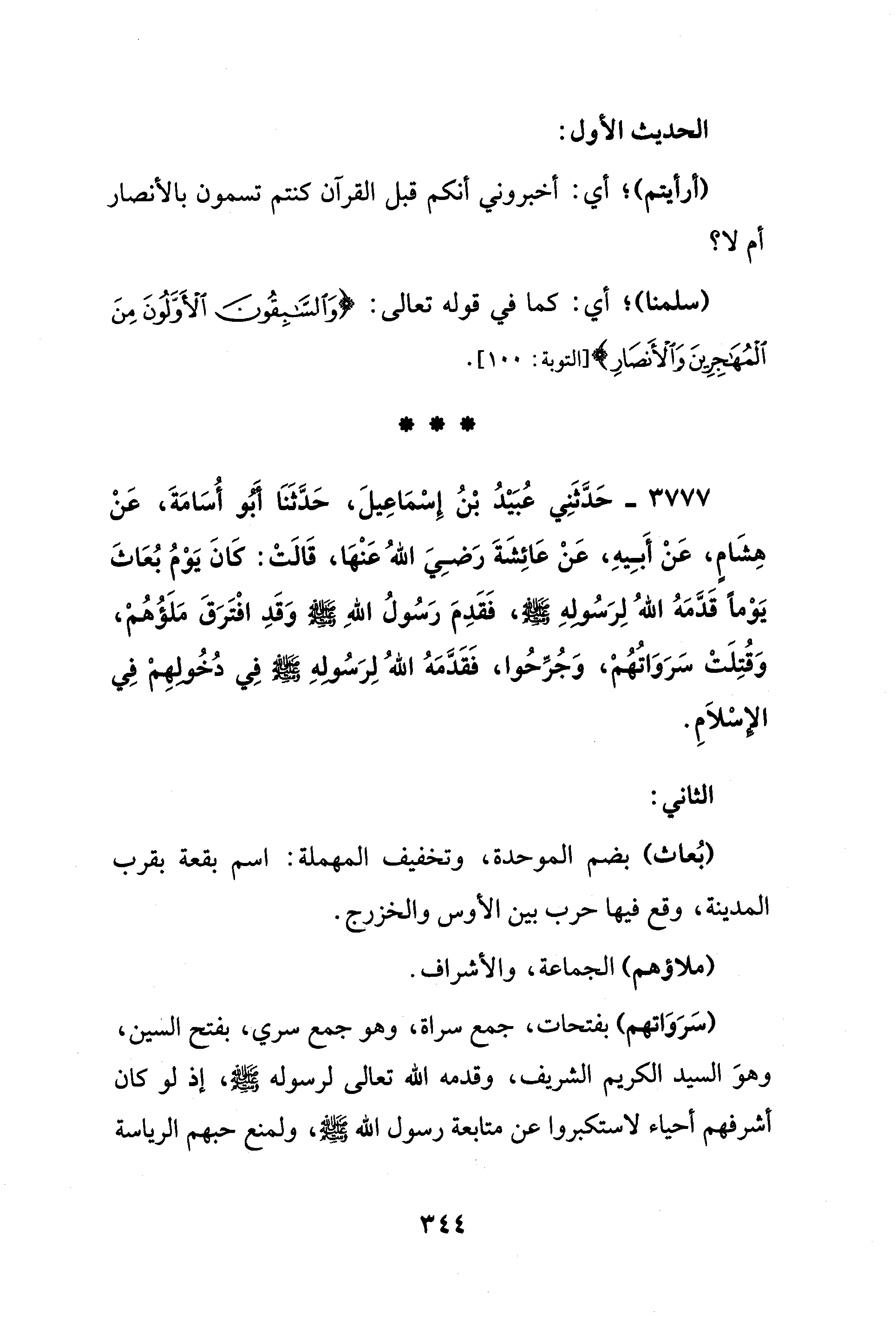 3777 - حَدَّثَنِي عُبَيْدُ بْنُ إِسْمَاعِيلَ، حَدَّثَنَا أَبُو أُسَامَةَ، عَنْ هِشَامٍ، عَنْ أَبِيهِ، عَنْ عَائِشَةَ رَضِيَ اللهُ عَنْها، قَالَتْ: كَانَ يَوْمُ بُعَاثَ يَوْمًا قَدَّمَهُ اللهُ لِرَسُولهِ - صلى الله عليه وسلم -، فَقَدِمَ رَسُولُ اللهِ - صلى الله عليه وسلم - وَقَدِ افْتَرَقَ مَلَؤُهُمْ، وَقُتِلَتْ سَرَوَاتُهُمْ، وَجُرِّحُوا، فَقَدَّمَهُ اللهُ لِرَسُولهِ - صلى الله عليه وسلم - فِي دُخُولهم فِي الإسْلاَمِ.