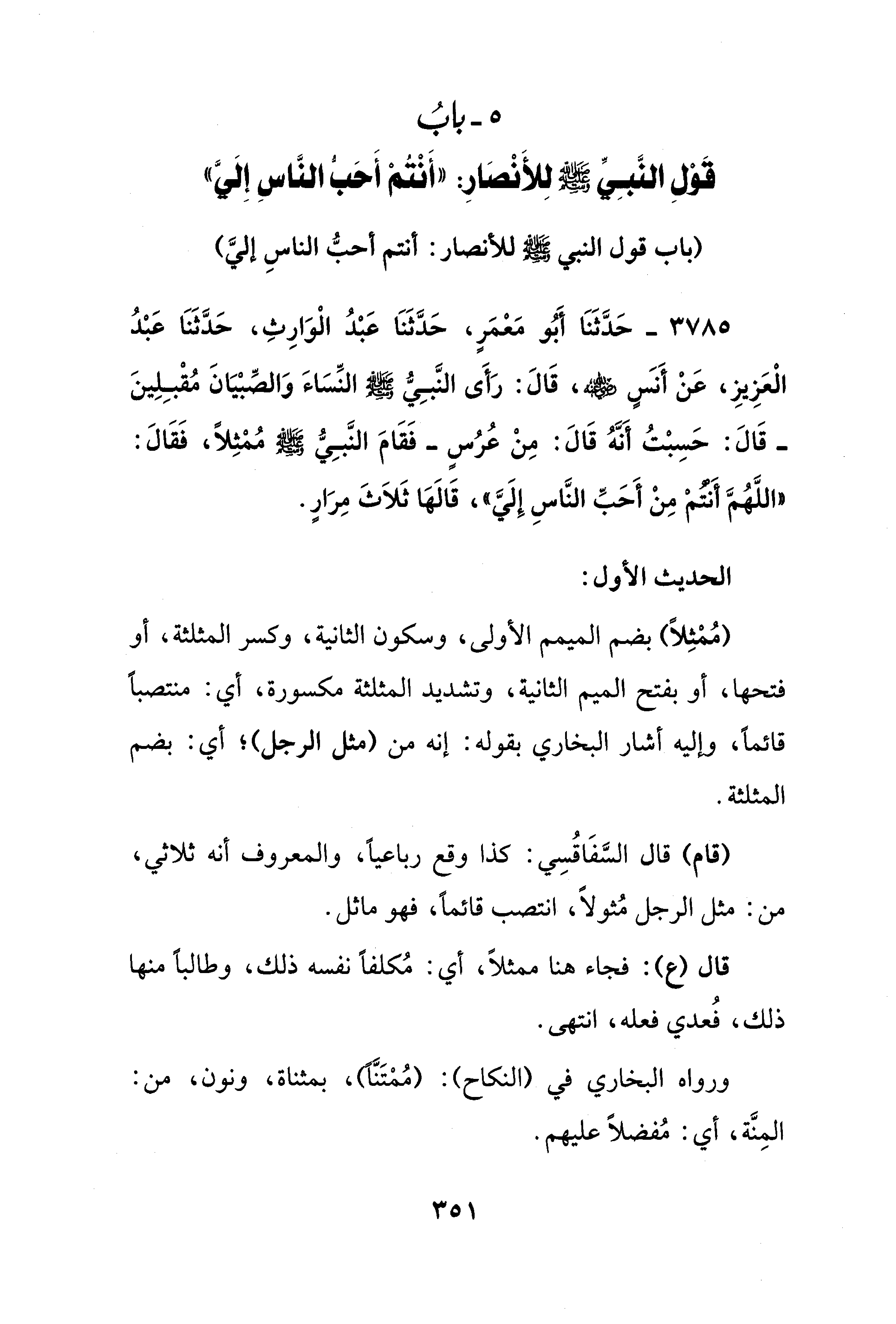 3785 - حَدَّثَنَا أَبو مَعمَرٍ، حَدَّثَنَا عَبْدُ الْوَارِثِ، حَدَّثَنَا عَبْدُ الْعَزِيزِ، عَنْ أَنسٍ - رضي الله عنه -، قَالَ: رَأَى النَّبِي - صلى الله عليه وسلم - النِّسَاءَ وَالصِّبْيَانَ مُقْبِلِينَ -قَالَ: حَسِبْتُ أَنَّهُ قَالَ: مِنْ عُرُس- فَقَامَ النَّبِيُّ - صلى الله عليه وسلم - مُمْثلًا، فَقَالَ: "اللَّهُمَّ أَنتم مِنْ أَحَبِّ النَّاسِ إِلَيّ"، قَالها ثَلاَثَ مِرَارٍ.