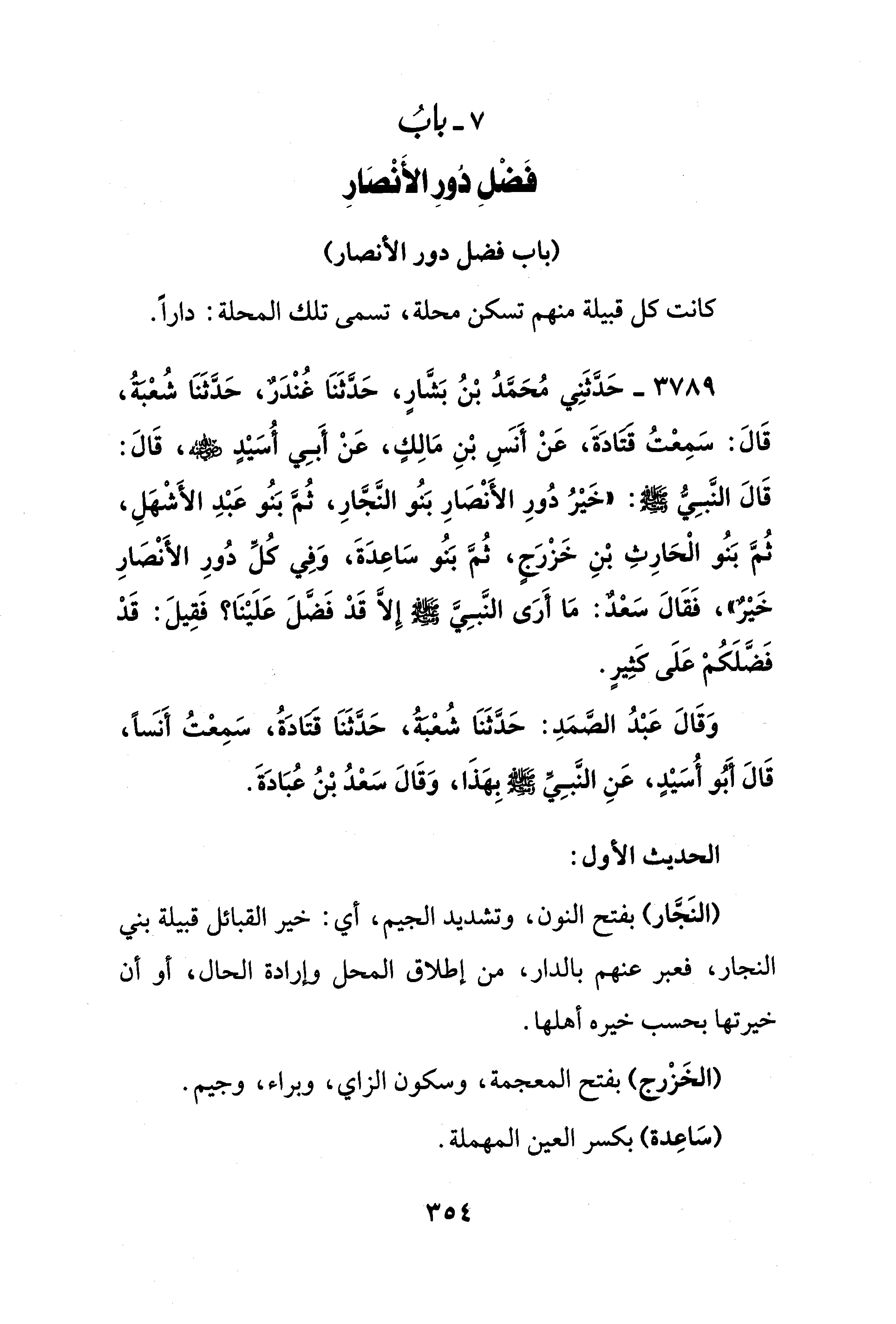 3789 - حَدَّثَنِي مُحَمَّدُ بْنُ بَشَّارٍ، حَدَّثَنَا غُنْدَرٌ، حَدَّثَنَا شُعْبَةُ، قَالَ: سَمِعْتُ قتادَةَ، عَنْ أَنَسٍ بْنِ مَالِكٍ، عَنْ أَبِي أُسَيْدٍ - رضي الله عنه -، قَالَ: قَالَ النَّبِيُّ - صلى الله عليه وسلم -: "خَيْرُ دُورِ الأَنْصَارِ بَنُو النَّجَّارِ، ثُمَّ بَنُو عَبْدِ الأَشْهَلِ، ثُمَّ بَنُو الْحَارِثِ بْنِ خَزْرَجٍ، ثُمَّ بَنُو سَاعِدَةَ، وَفِي كُلِّ دُورِ الأَنْصَارِ خَيْرٌ"، فَقَالَ سَعْدٌ: مَا أَرَى النَّبِيَّ - صلى الله عليه وسلم - إلا قَدْ فَضَّلَ عَلَيْنَا؟ فَقِيلَ: قَدْ فَضَّلَكُمْ عَلَى كَثِيرٍ.