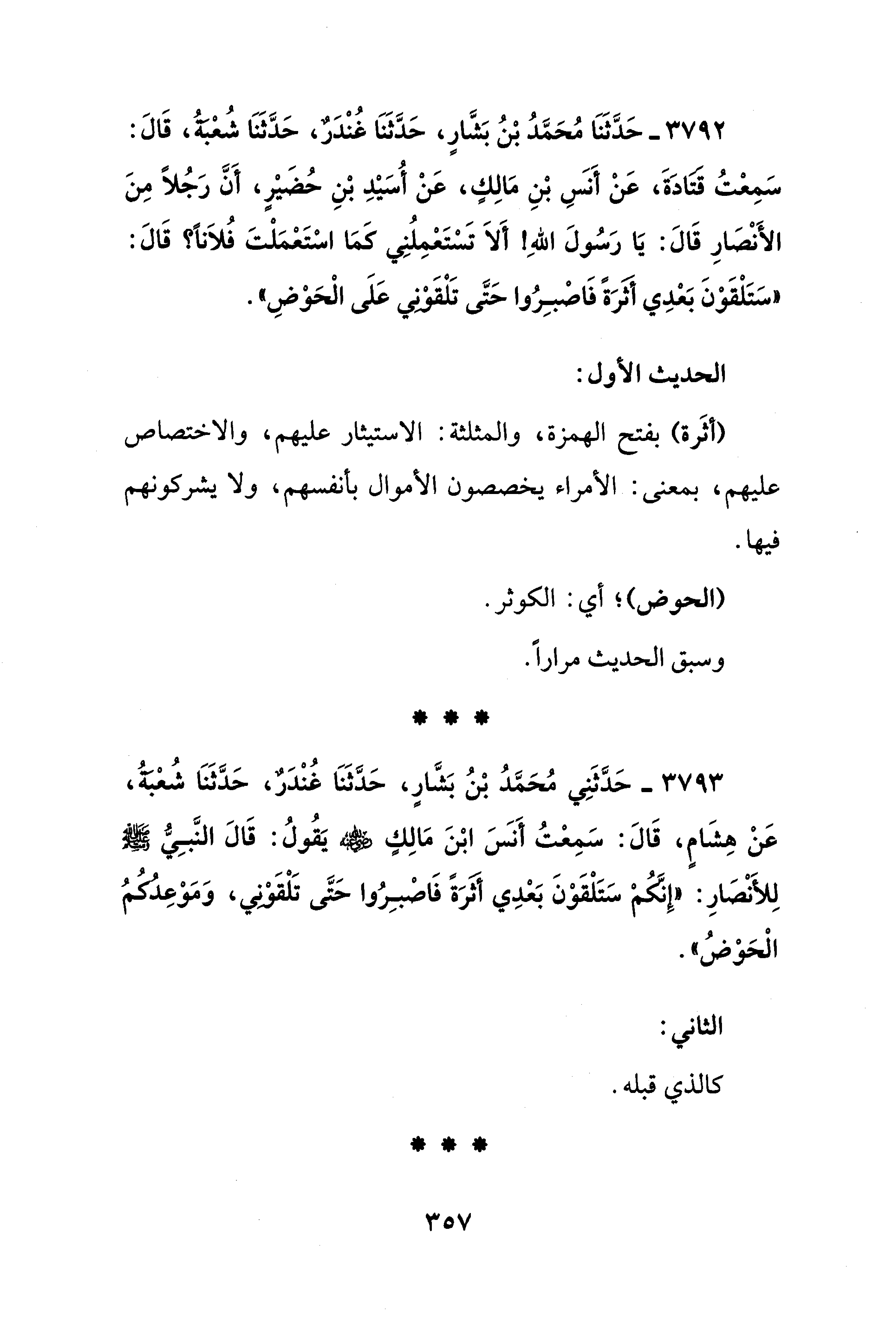 3792 - حَدَّثَنَا مُحَمَّدُ بْنُ بَشَّارٍ، حَدَّثنَا غُنْدَرٌ، حَدَّثَنَا شُعْبَةُ، قَالَ: سَمِعْتُ قَتَادَةَ، عَنْ أَنَسٍ بْنِ مَالِكٍ، عَنْ أُسَيْدِ بْنِ حُضَيْرٍ، أَنَّ رَجُلًا مِنَ الأَنْصَارِ قَالَ: يَا رَسُولَ اللهِ! أَلَا تَسْتَعْمِلُنِي كَمَا اسْتَعْمَلْتَ فُلَانًا؟ قَالَ: "سَتَلْقَوْنَ بَعْدِي أَثَرَةً فَاصْبِرُوا حَتَّى تَلْقَوْنِي عَلَى الْحَوْضِ".