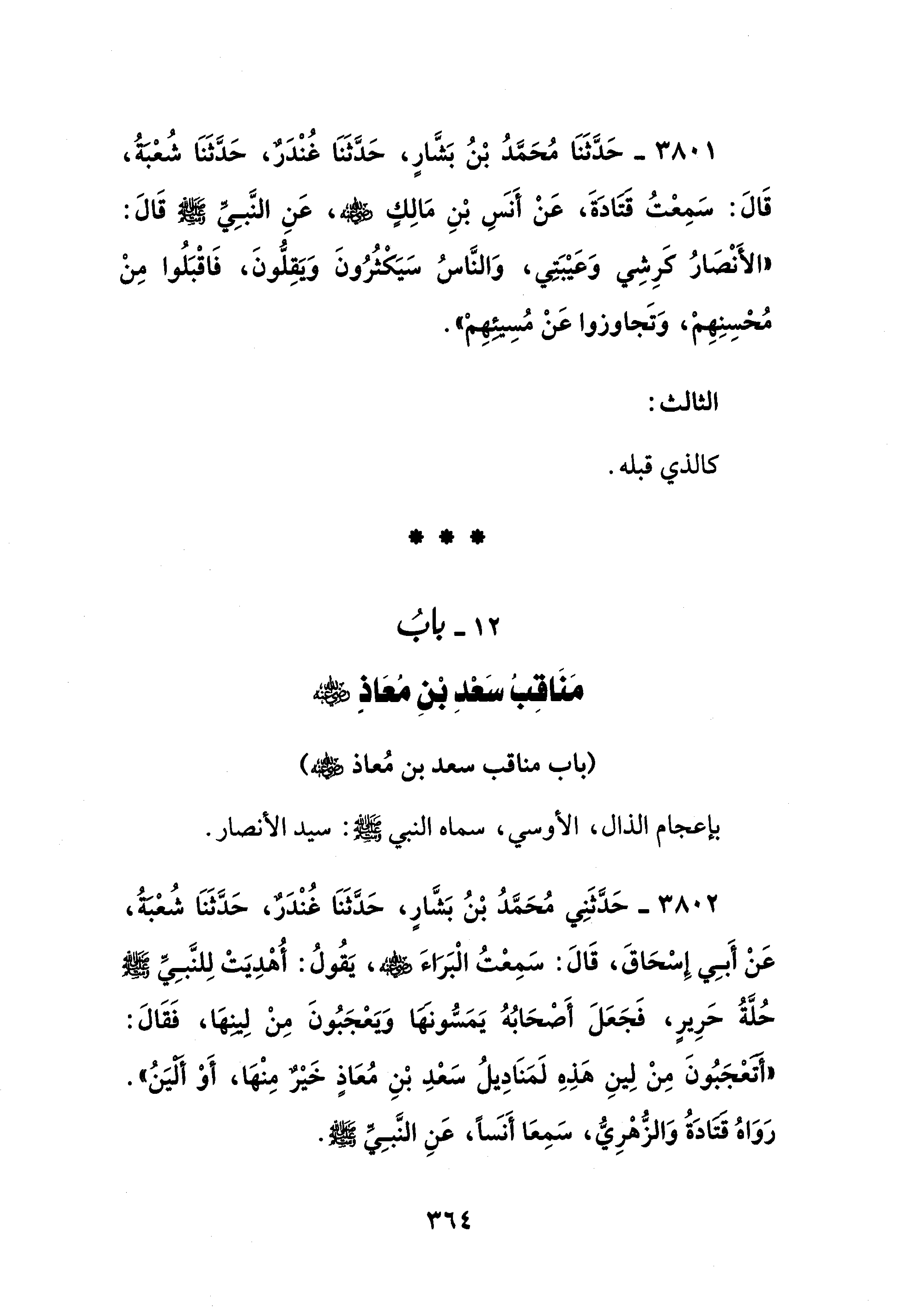 3802 - حَدَّثَنِي مُحَمَّدُ بْنُ بَشَّارٍ، حَدَّثَنَا غُنْدَرٌ، حَدَّثَنَا شُعْبَةُ، عَنْ أَبِي إِسْحَاقَ، قَالَ: سَمِعْتُ الْبَرَاءَ - رضي الله عنه -، يَقُولُ: أُهْدِيَتْ لِلنَّبِيِّ - صلى الله عليه وسلم - حُلَّةُ حَرِيرٍ، فَجَعَلَ أَصْحَابُهُ يَمَسُّونَهَا وَيَعْجَبُونَ مِنْ لِيِنهَا، فَقَالَ: "أَتَعْجَبُونَ مِنْ لِينِ هَذِهِ لَمَنَادِيلُ سَعْدِ بْنِ مُعَاذٍ خَيْرٌ مِنْهَا، أَوْ أَلَيَنُ". رَوَاهُ قتادَةُ وَالزُّهْرِيُّ، سَمِعَا أَنسًا، عَنِ النَّبِيِّ - صلى الله عليه وسلم -.
