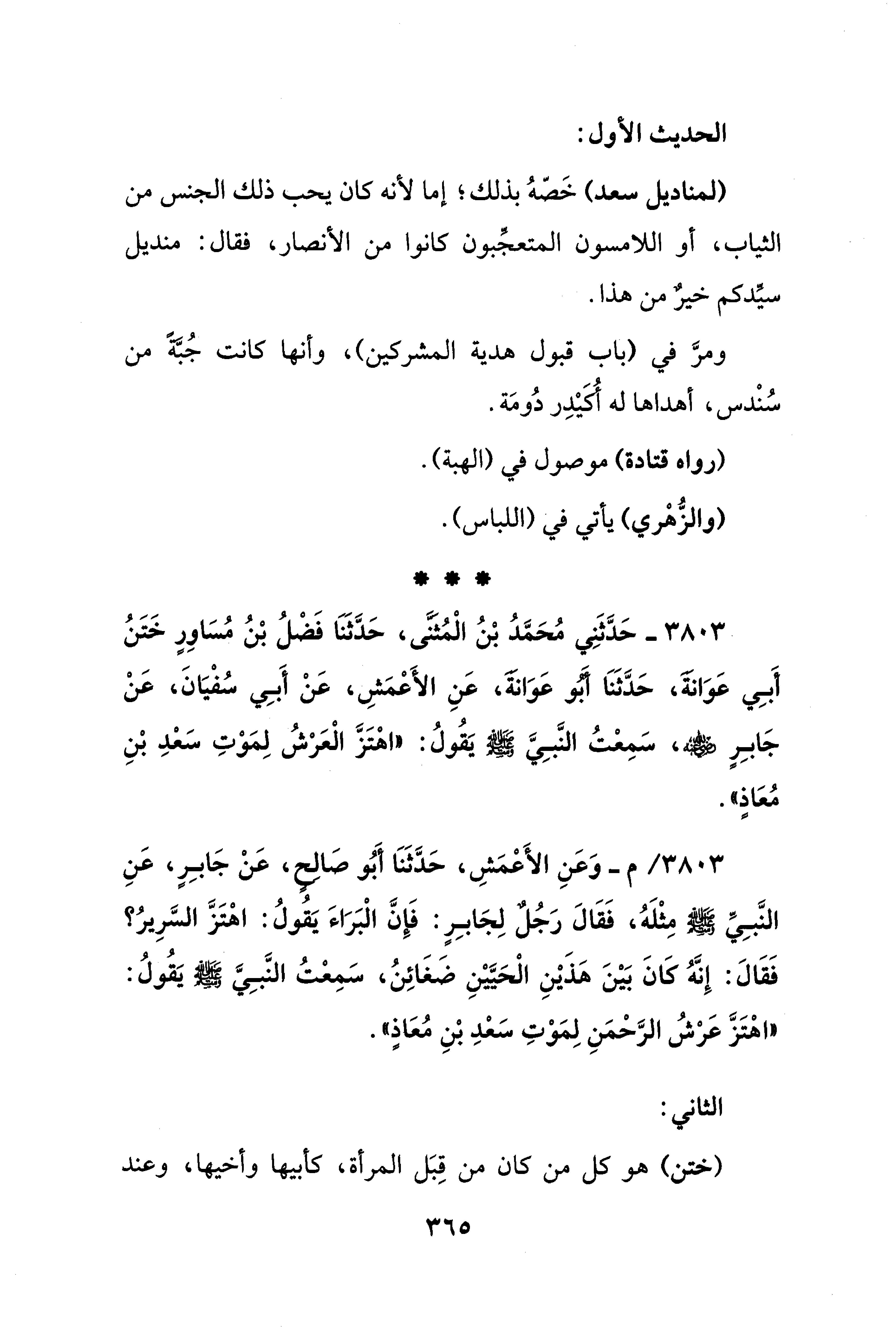 3803 - حَدَّثَنِي مُحَمَّدُ بْنُ الْمُثَنَّى، حَدَّثَنَا فَضْلُ بْنُ مُسَاوِرٍ خَتَنُ أَبِي عَوَانَةَ، حَدَّثَنَا أَبُو عَوَانَةَ، عَنِ الأَعْمَشِ، عَنْ أَبِي سُفْيَانَ، عَنْ جَابِرٍ - رضي الله عنه -، سَمِعْتُ النَّبِيَّ - صلى الله عليه وسلم - يَقُولُ: "اهْتَزَّ الْعَرشُ لِمَوْتِ سَعْدِ بْنِ مُعَاذٍ".