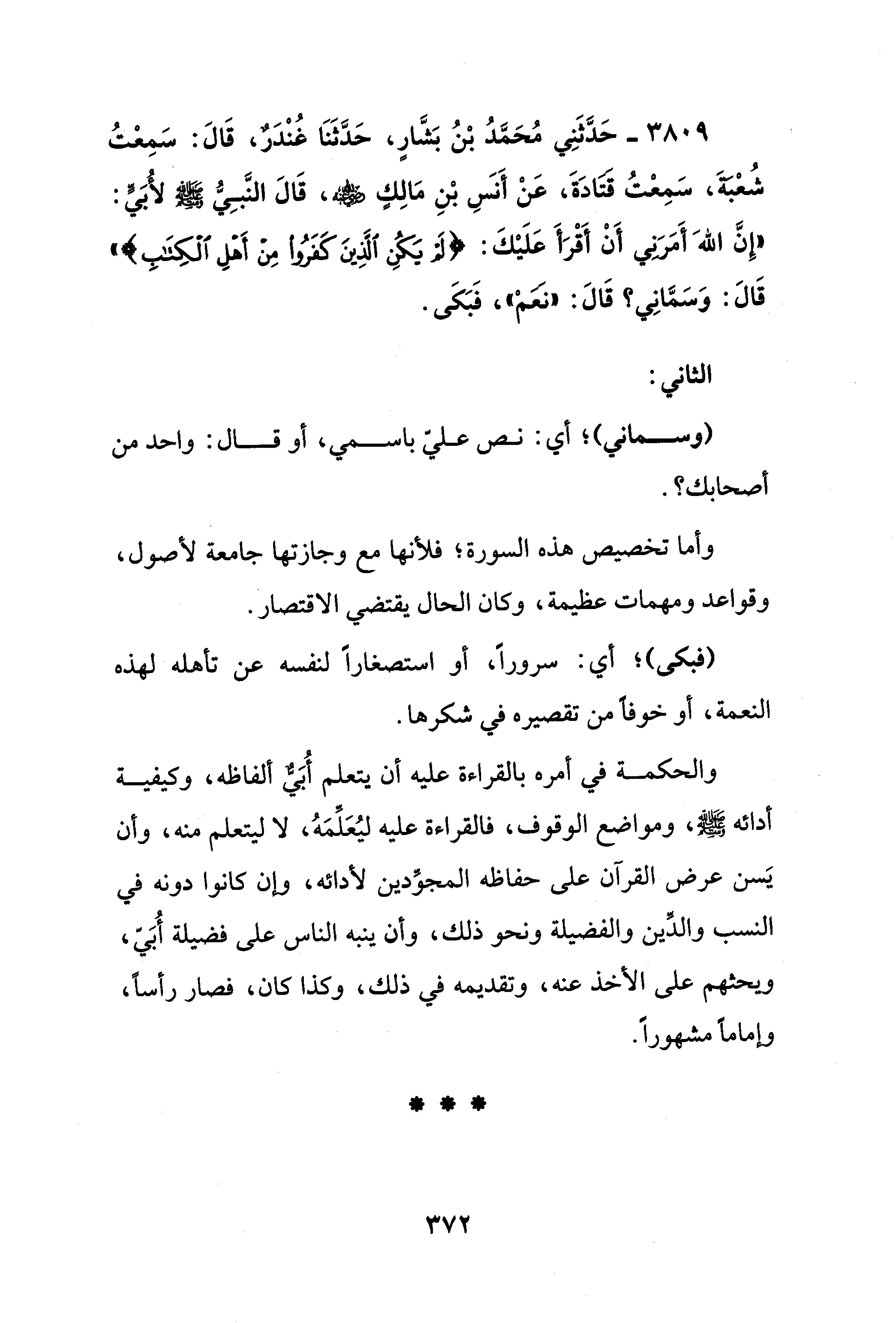 3809 - حَدَّثَنِي مُحَمَّدُ بْنُ بَشَّارٍ، حَدَّثَنَا غُنْدَرٌ، قَالَ: سَمِعْتُ شُعْبة، سَمِعْتُ قتادَةَ، عَنْ أَنسٍ بنِ مَالِكٍ - رضي الله عنه -، قَالَ النَّبِيُّ - صلى الله عليه وسلم - لأُبَيٍّ: "إِنَّ اللهَ أَمَرَنِي أَنْ أَقْرَأَ عَلَيْكَ: {لَمْ يَكُنِ الَّذِينَ كَفَرُوا مِنْ أَهْلِ الْكِتَابِ} " قَالَ: وَسَمَّانِي؟ قَالَ: "نَعَمْ"، فَبَكَى.